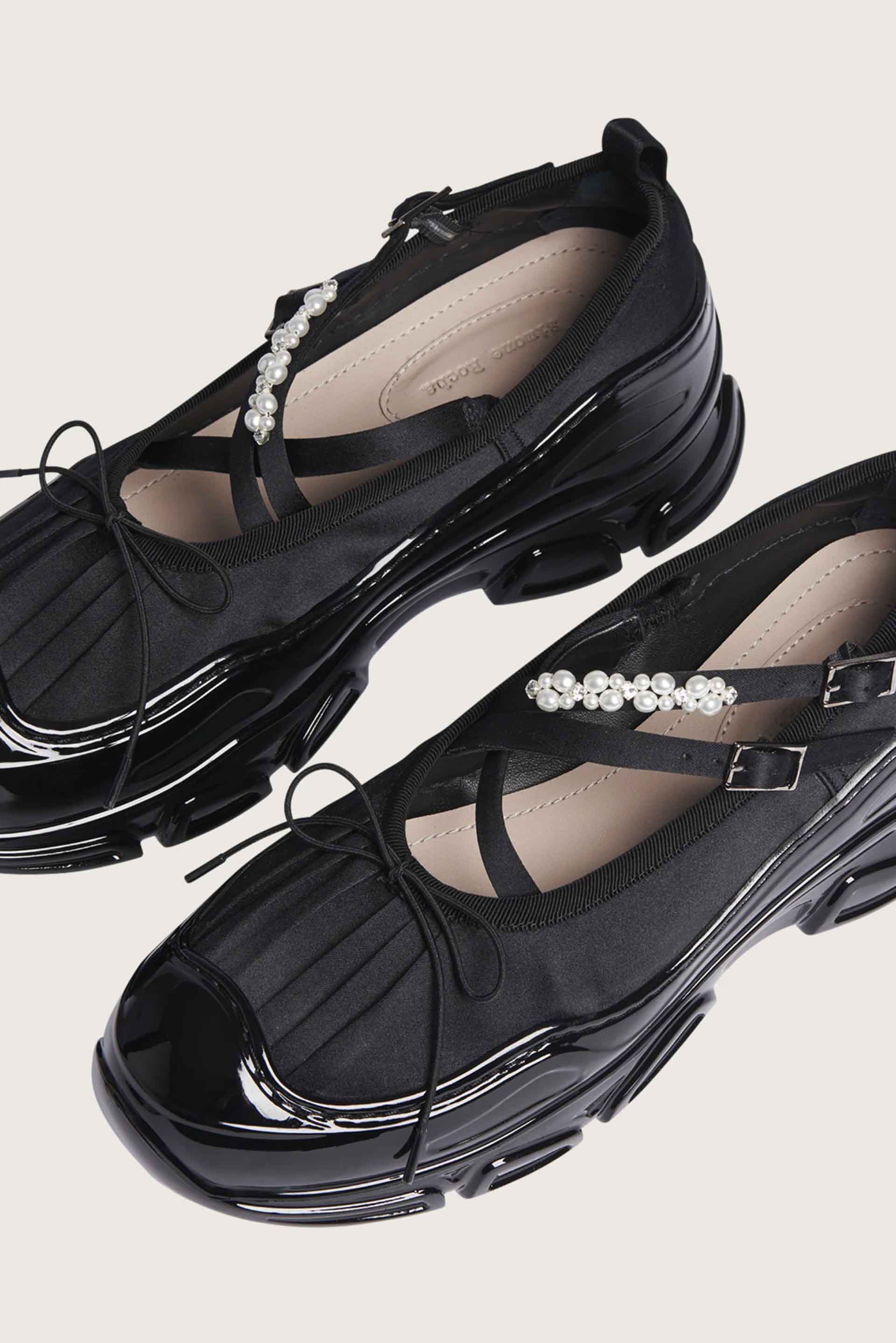Simone Rocha Classic Criss Cross Tracker Ballerina. Low trek satin ballerina pumps. Classic tracker sole. Signature pearl beaded straps. Slight platform.