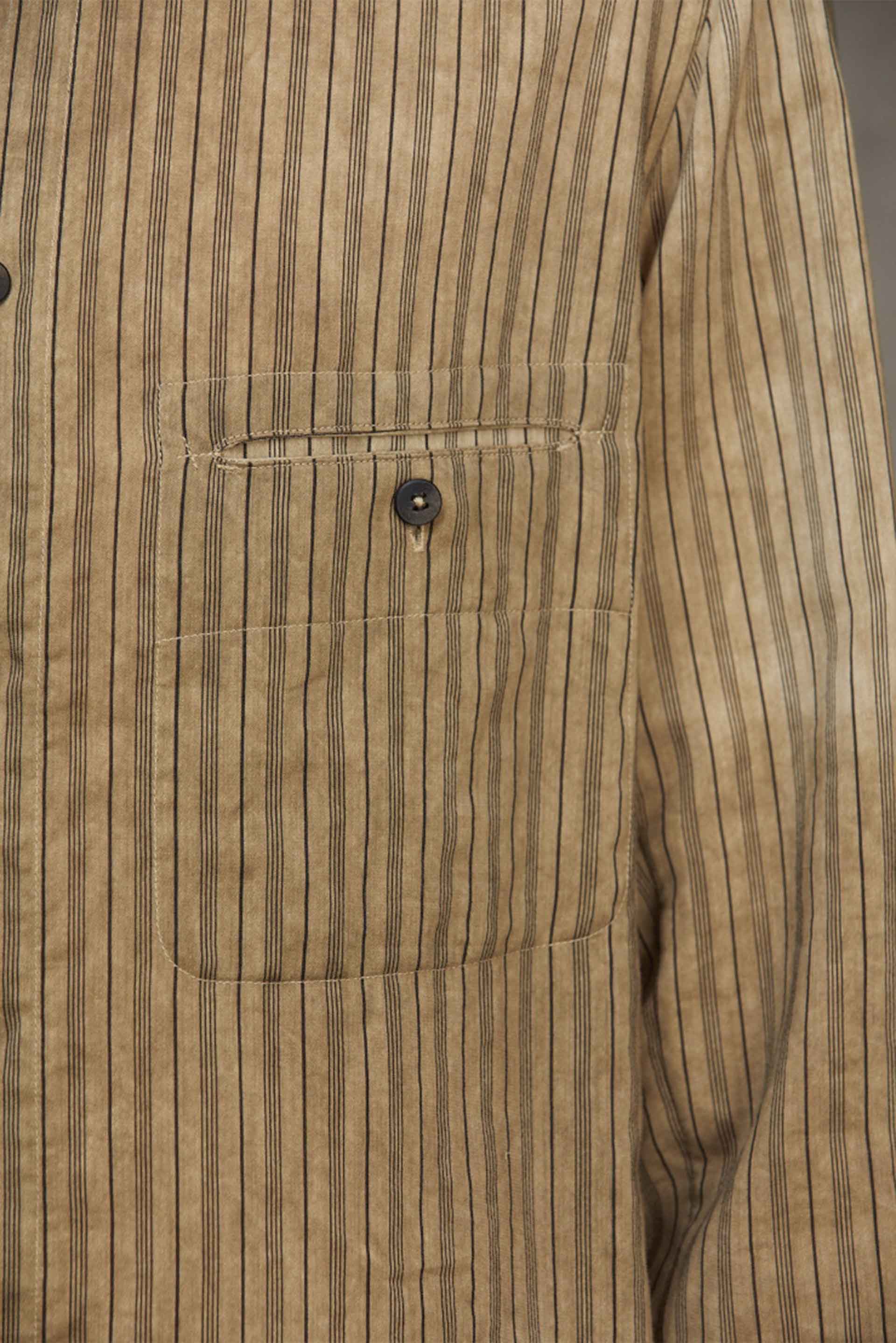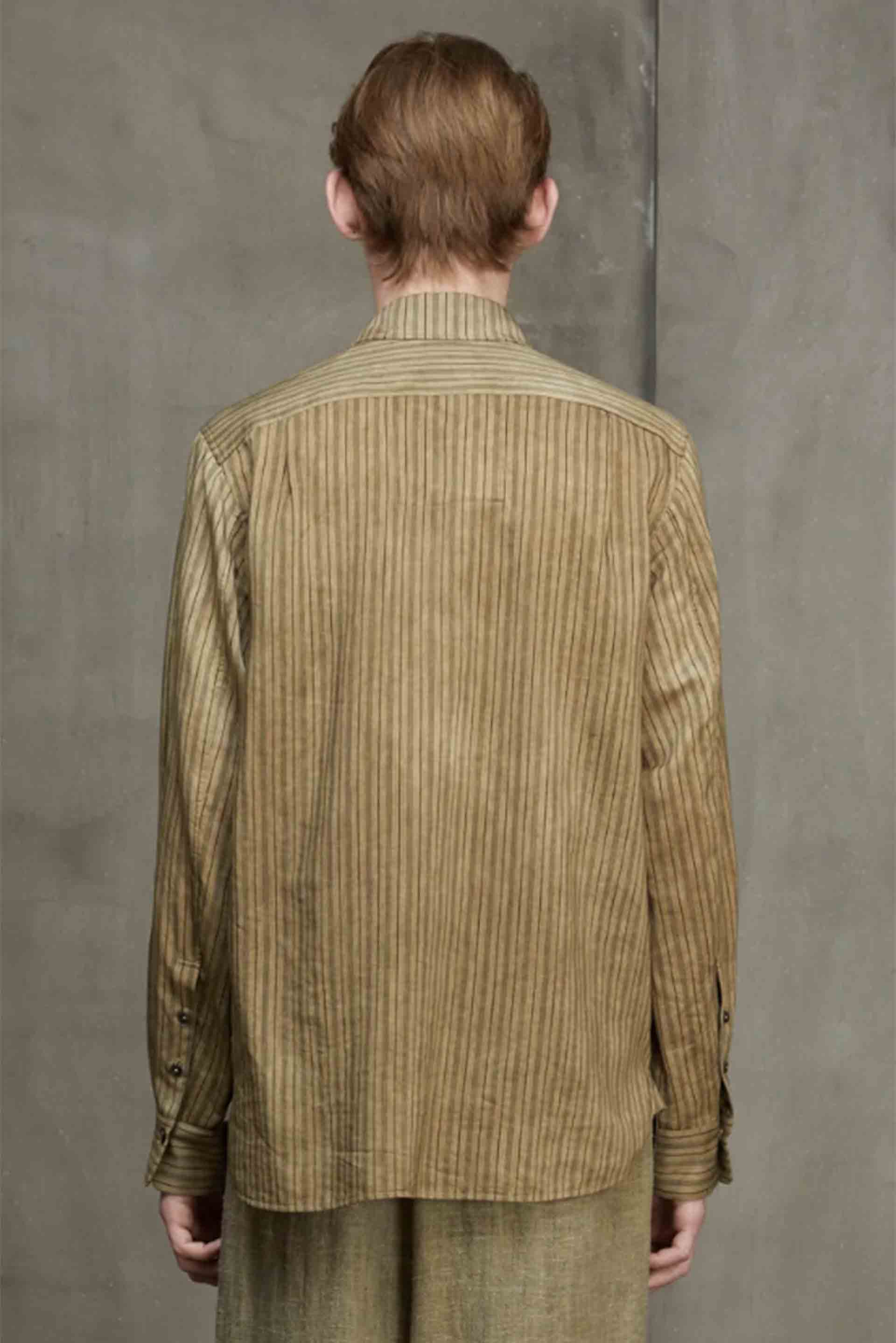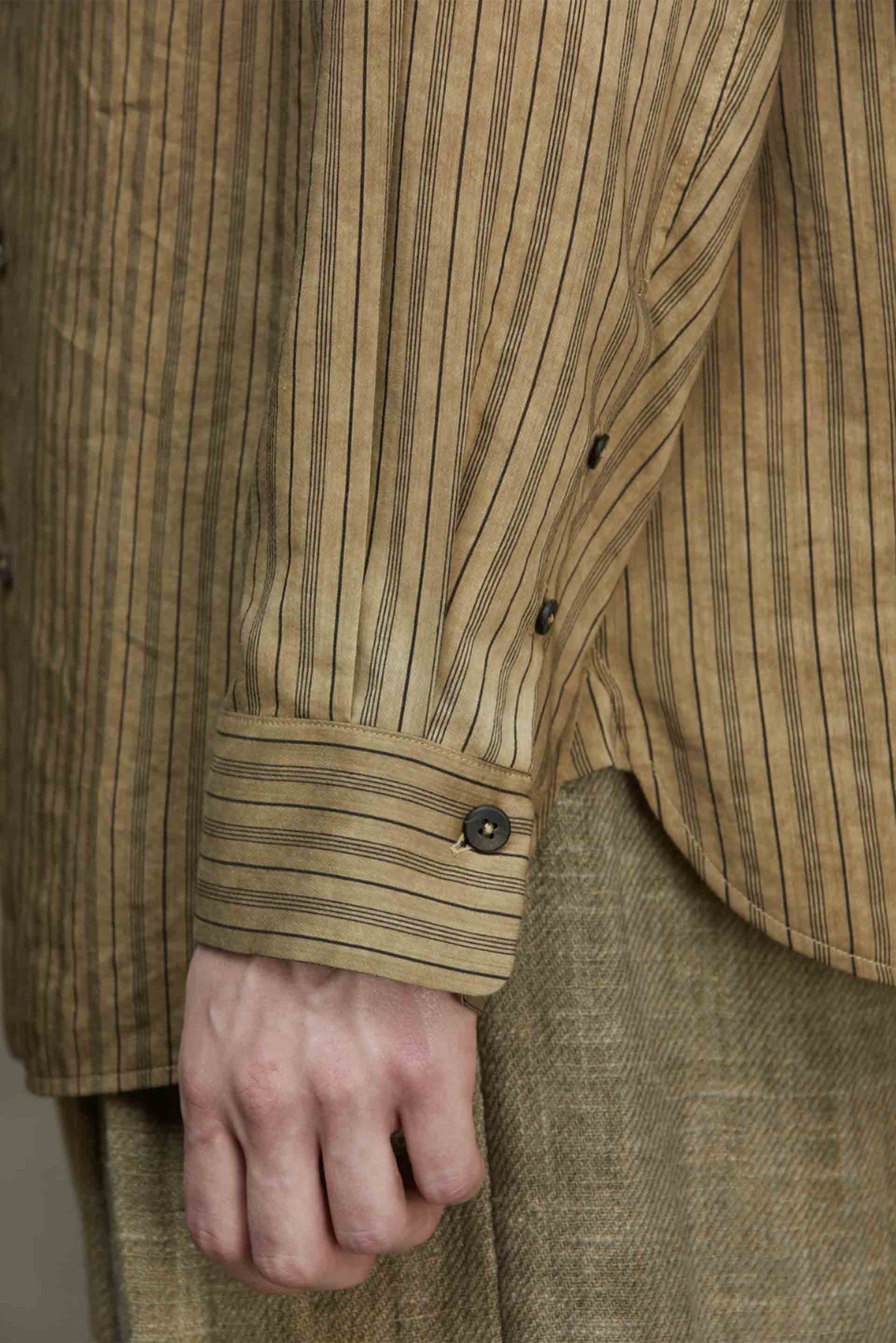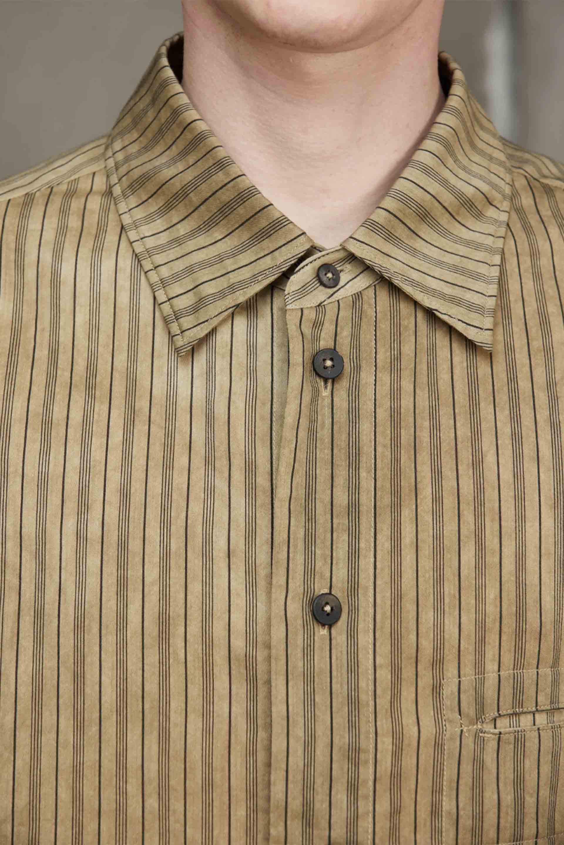 For Ziggy Chen Interlude III collection, Ziggy Chen continues his multifaceted research of fabrics and structures, creating garments that revolve around the concept of life and spontaneity. Old book covers and old pieces of fabric-from his private collection-were cut and reassembled to bring the motif to life. Referencing both century old Chinese and European silhouettes Ziggy Chen is a brand that is carving its own path within the industry as seen with the Classic Stripe Shirt Dirty White.