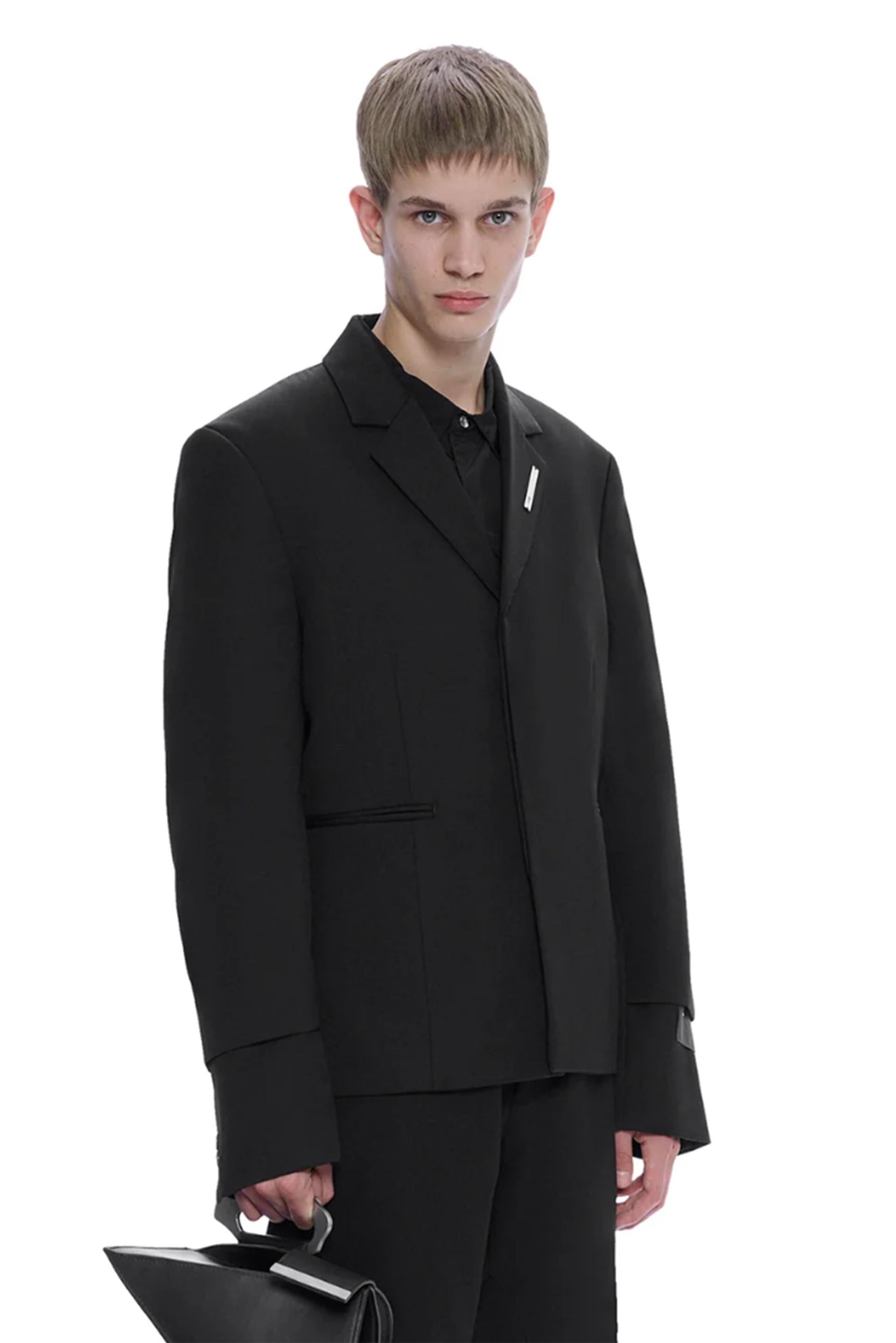 Tailored blazer with detachable hood & vest. Features metal label detailing at collar. Virgin wool grain de poudre. High break line. Detachable vest in main fabric with asymmetric zip and hood. Branded jacquard lining. Two Button cuffs. Metal label at collar.