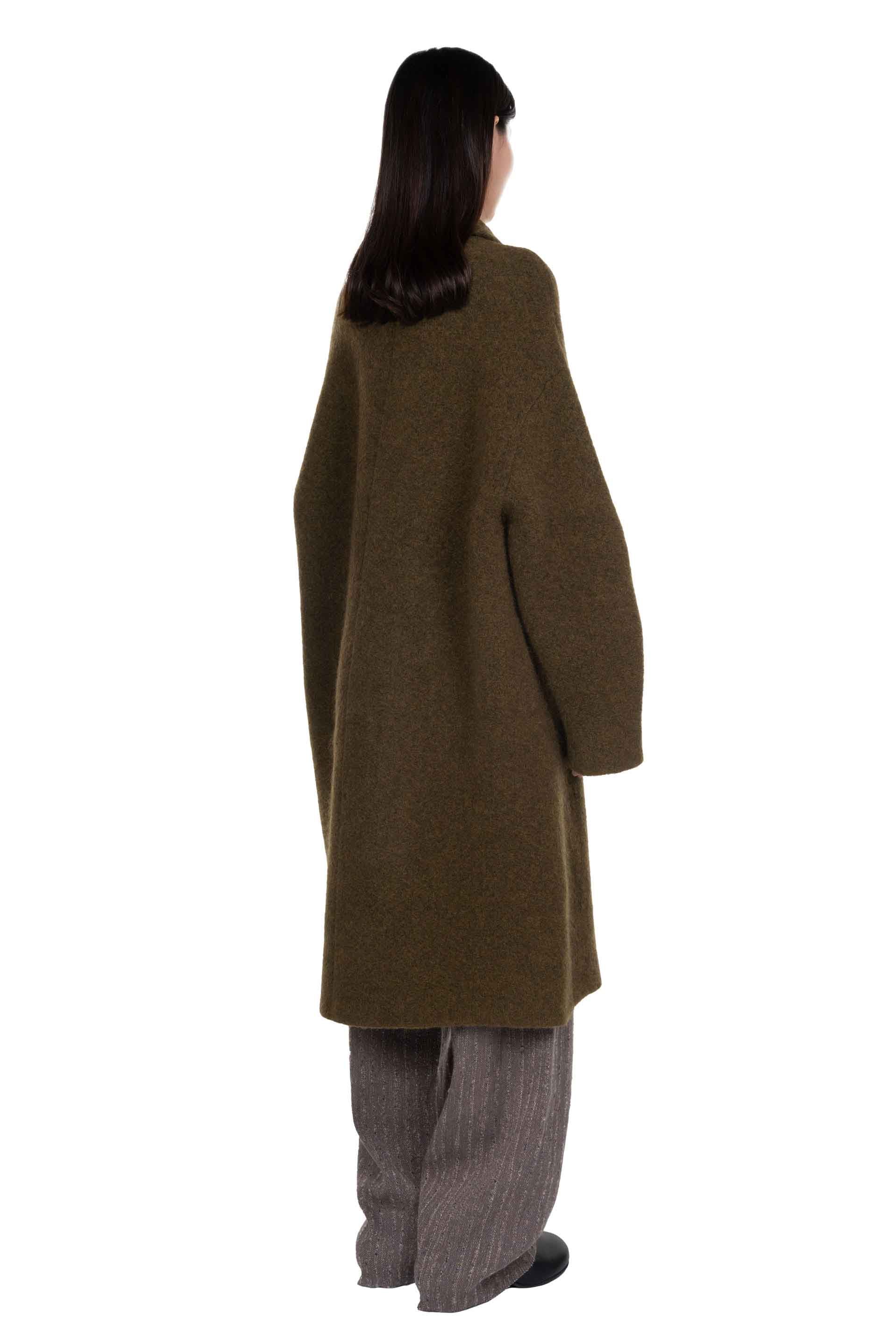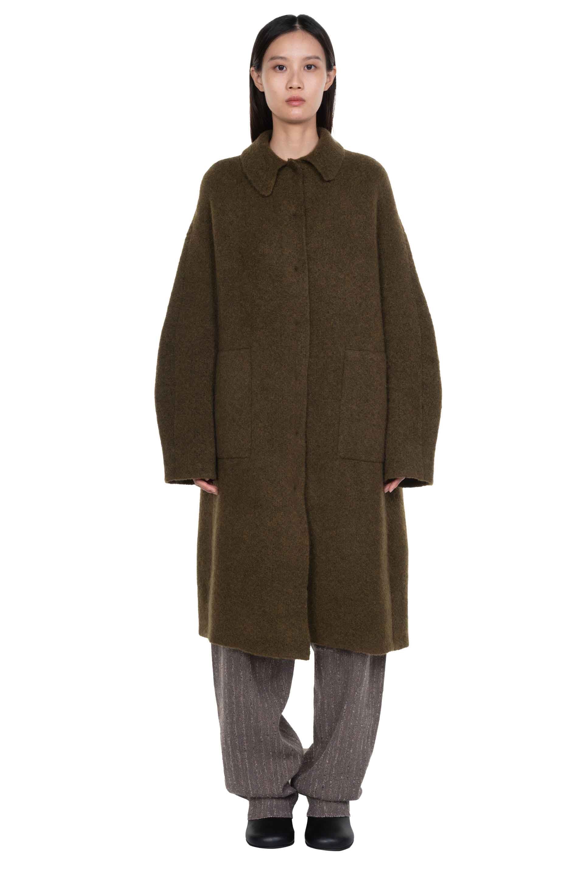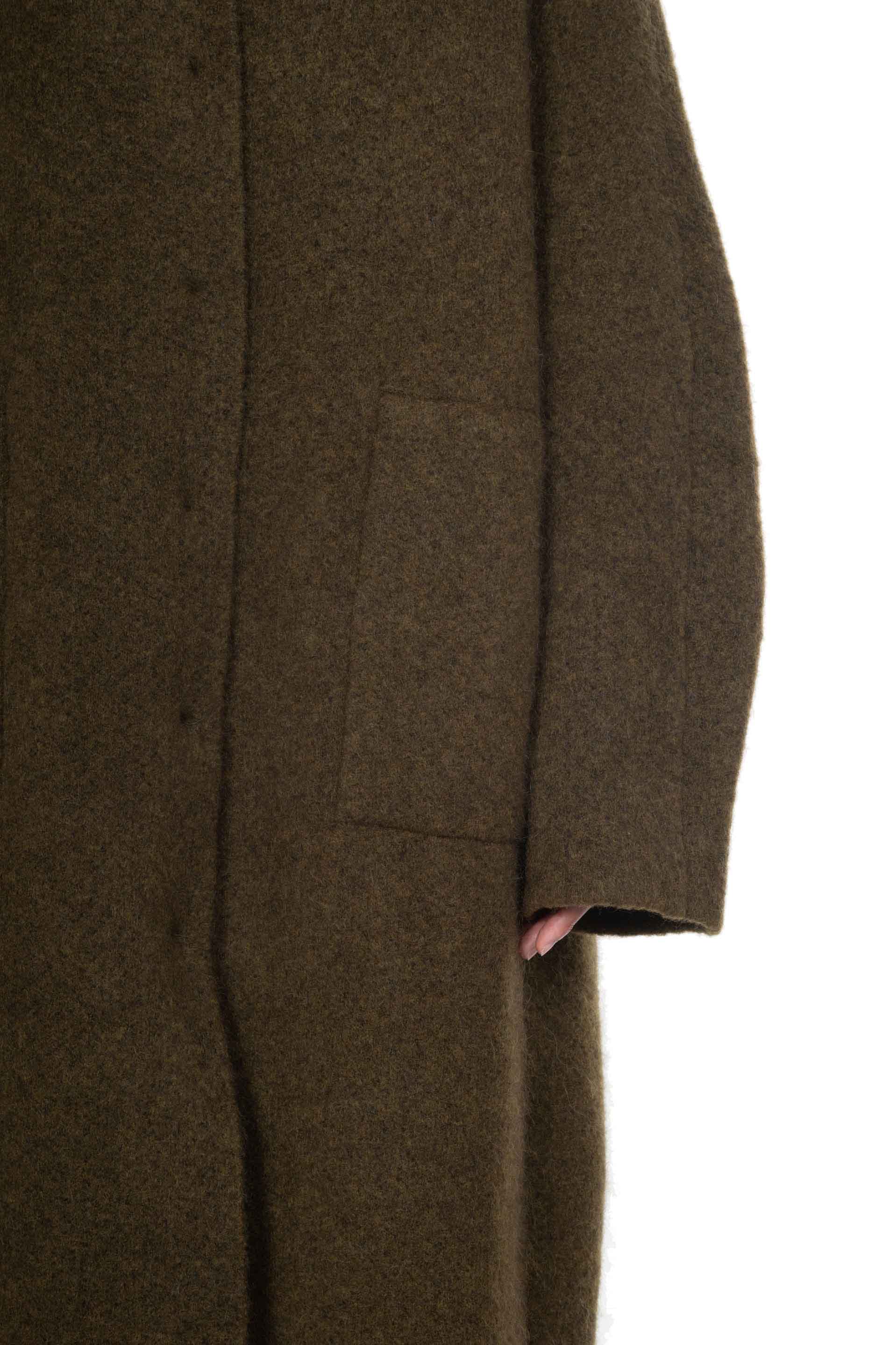 Moss Yak wool coat from Boboutic. Classic collar. Long sleeves. Button closure at front. Hidden button system. Two side pockets. Signature Yak mix. Soft textural fabric. Lightweight.
