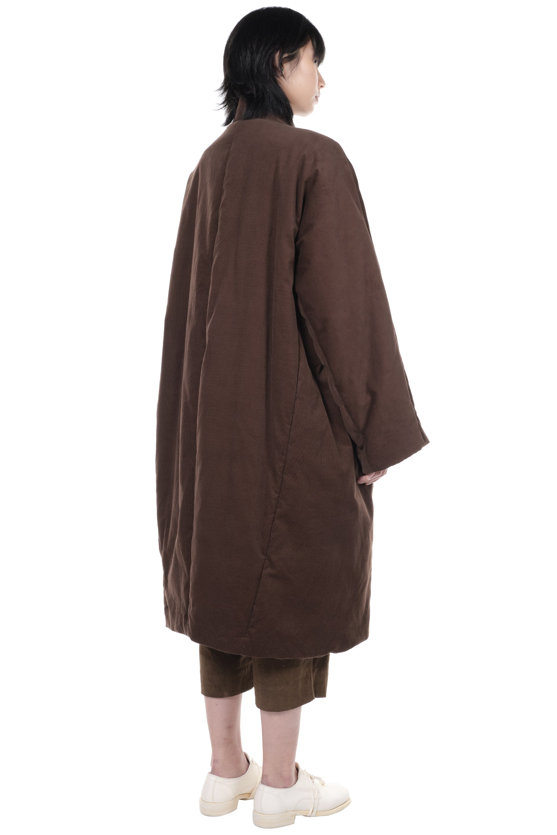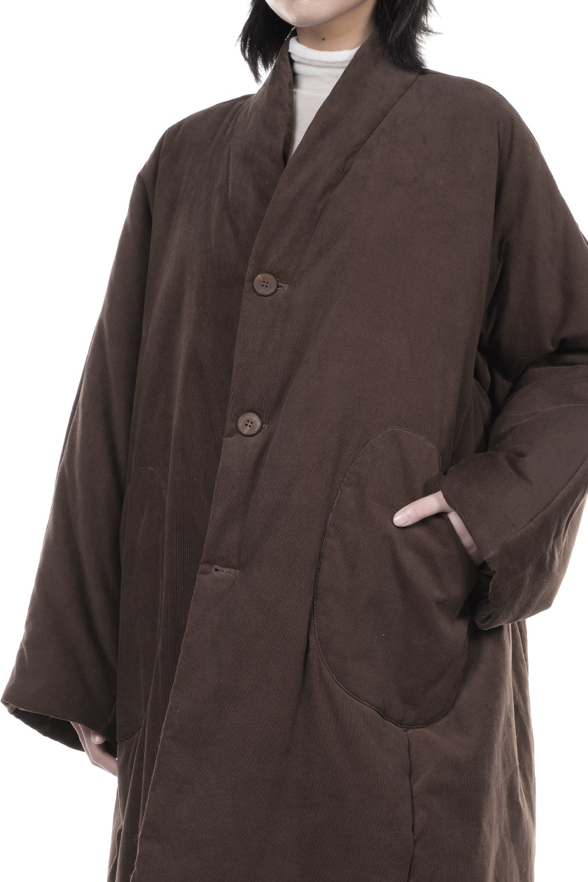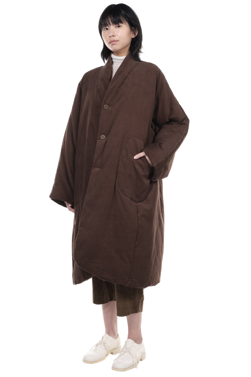 Coffee Corduroy Padded Coat from Kar. Button closure at front. Two round pockets on side. Handmade buttons. Oversize fit.