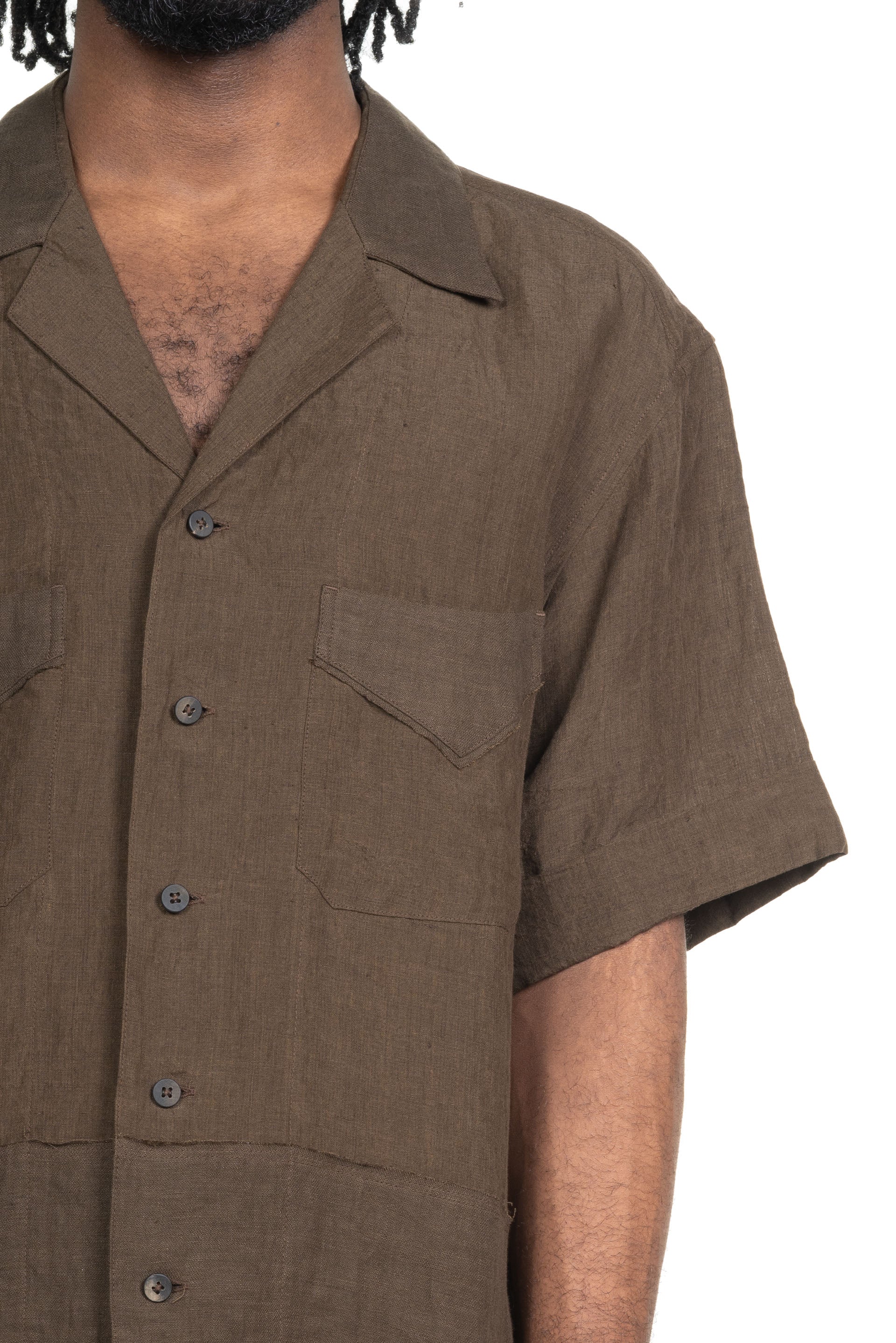 Ziggy Chen Short sleeve shirt. Button closure at front. Spread collar. Pocket at chest. Slit at side. Soft and textural linen fabric.