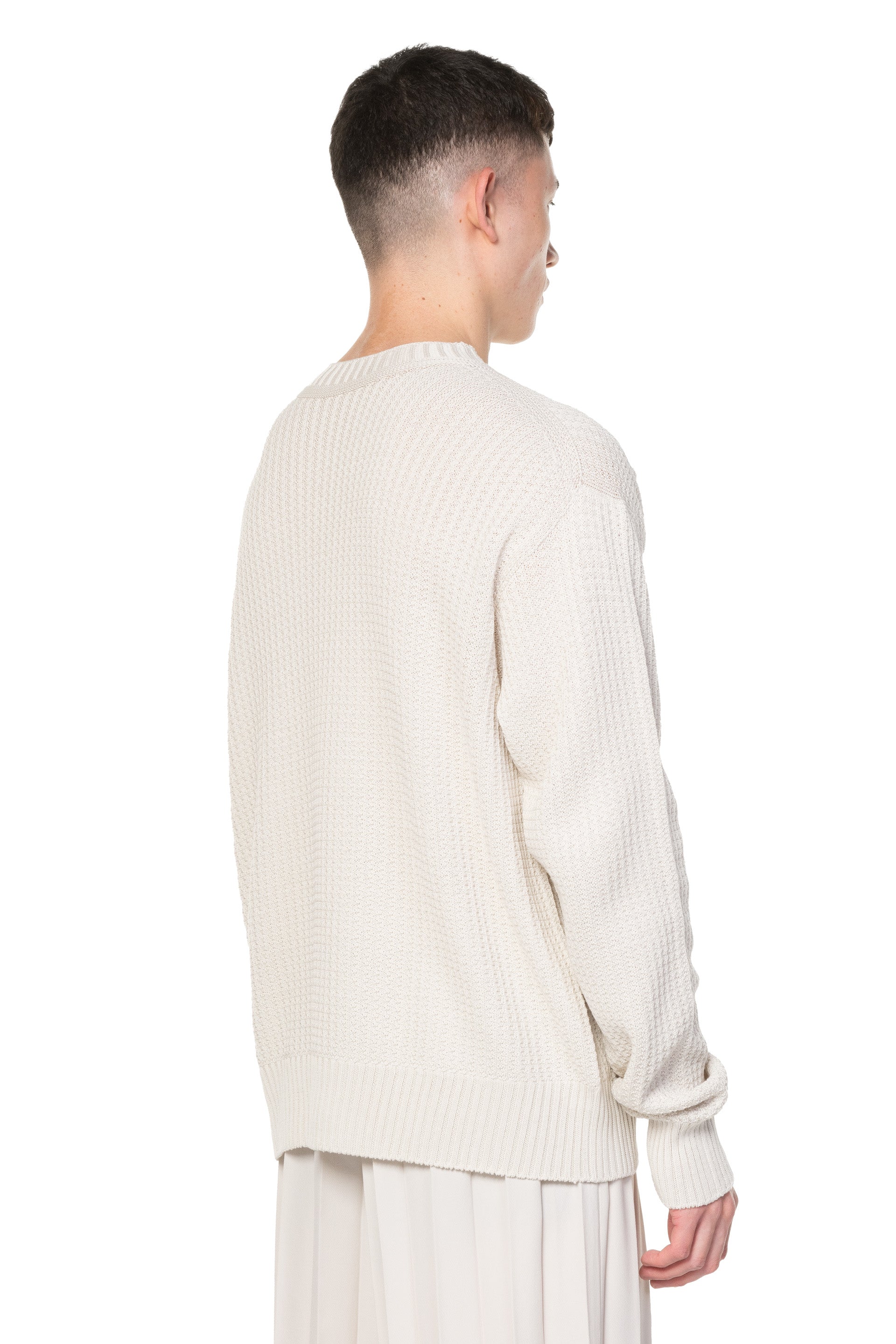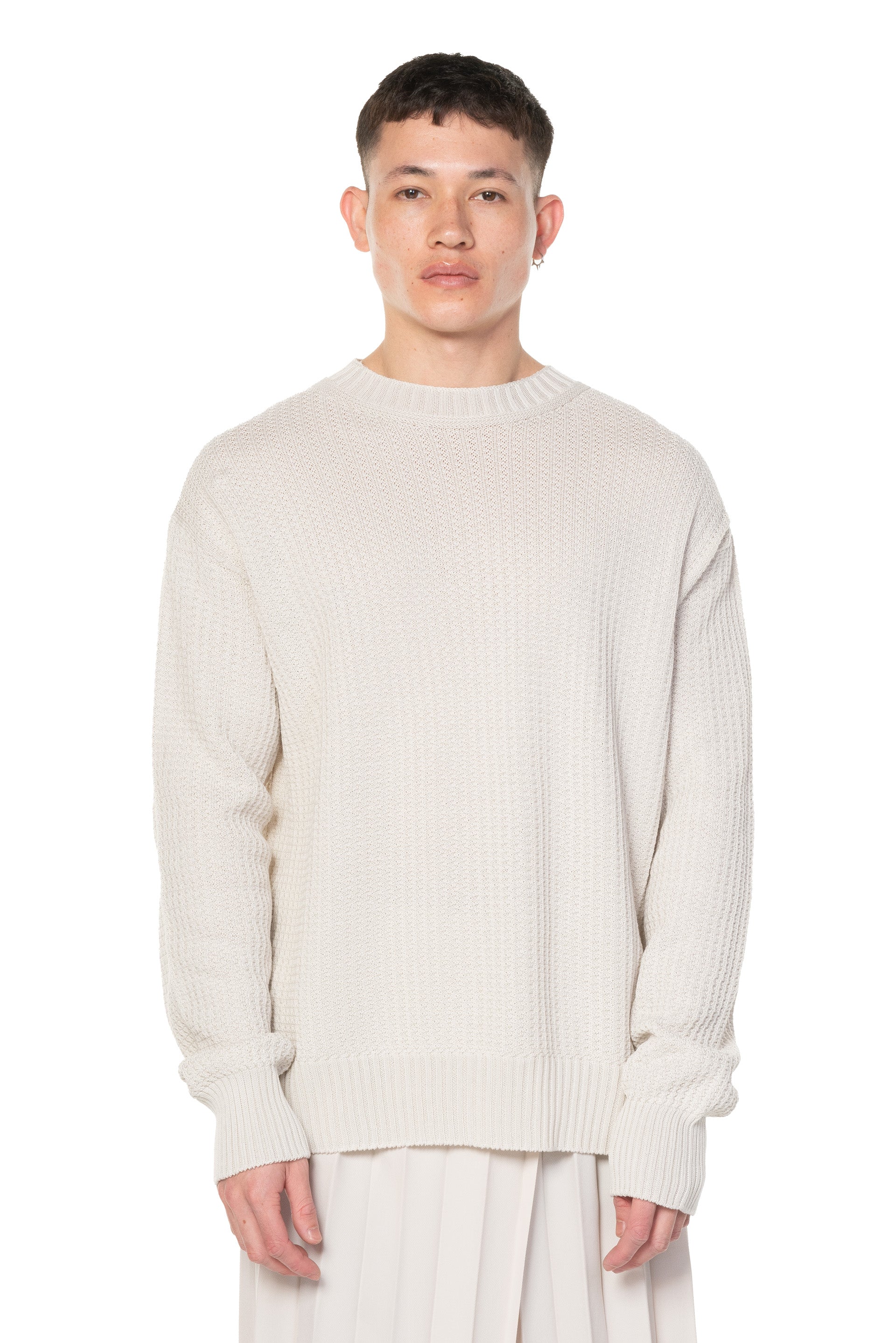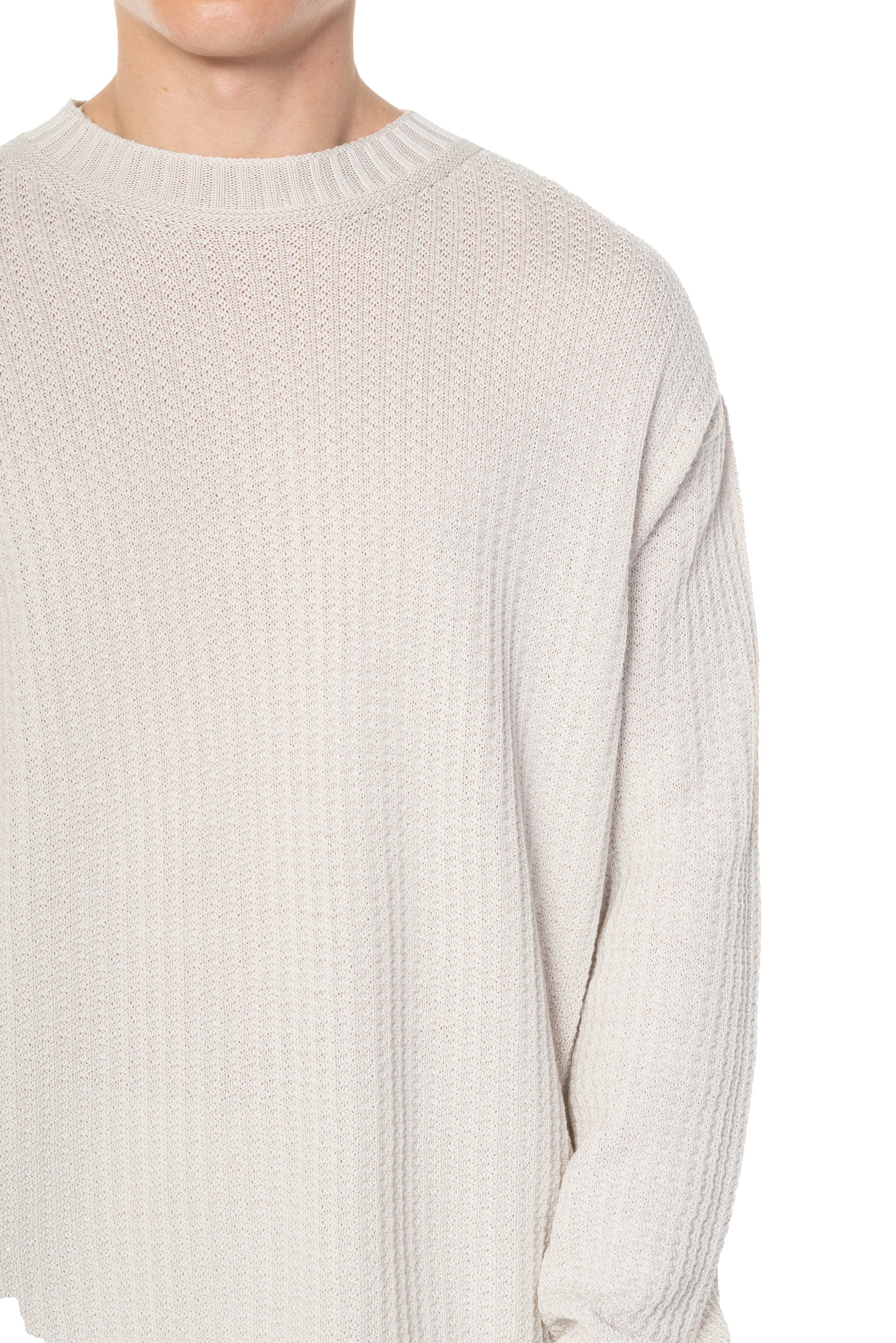 This knitted jumper has a mock neckline. Long sleeves. Reversible COMMON KNIT made from cotton yarn and knit using lily knit stitch. Light garment fit for the warmer seasons. When worn inside out the knit structure resembles pleats.