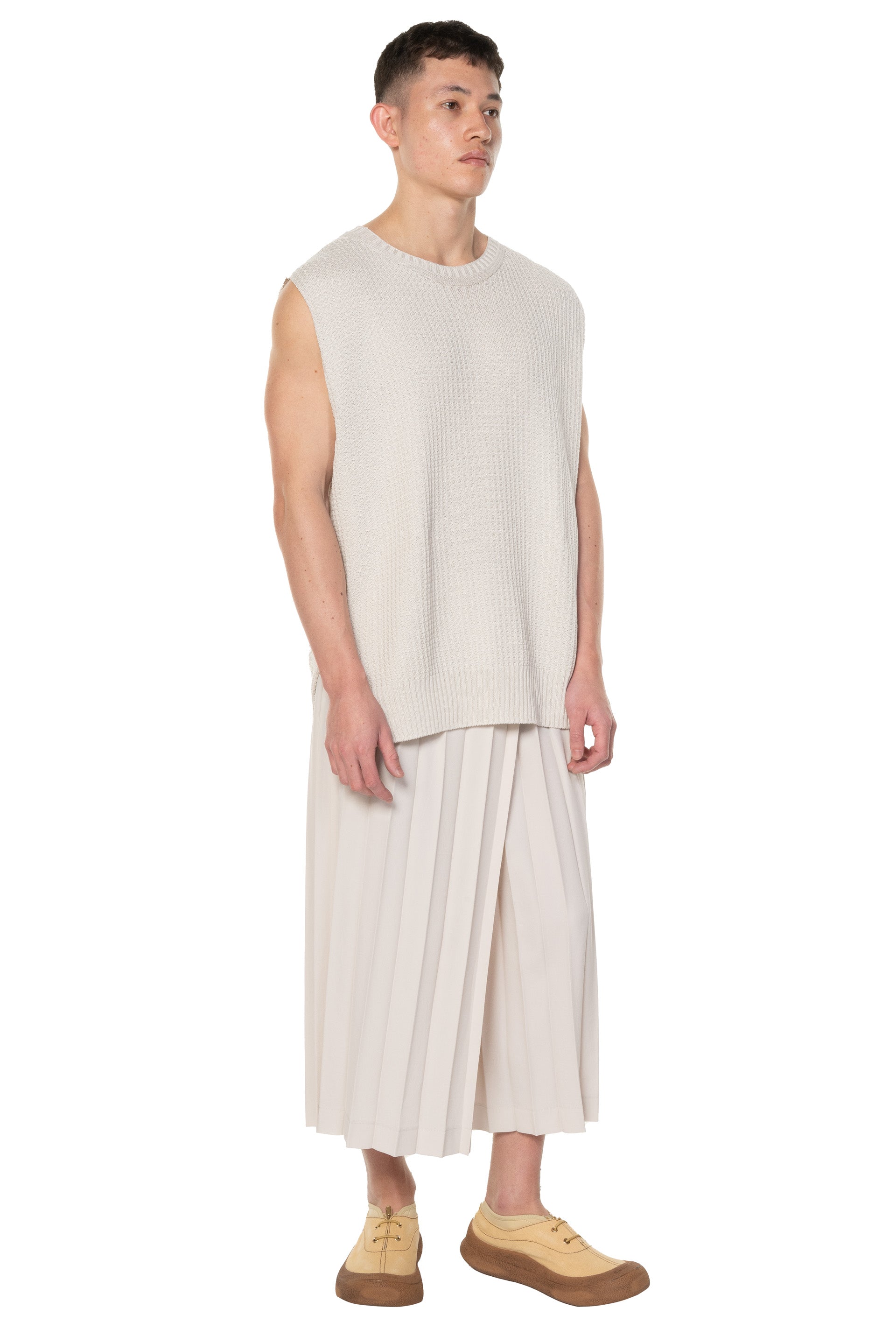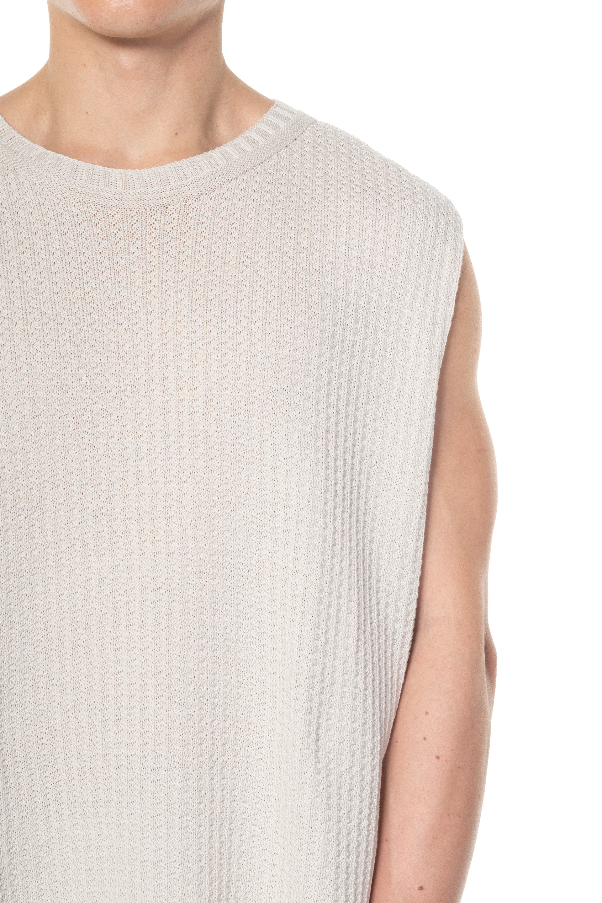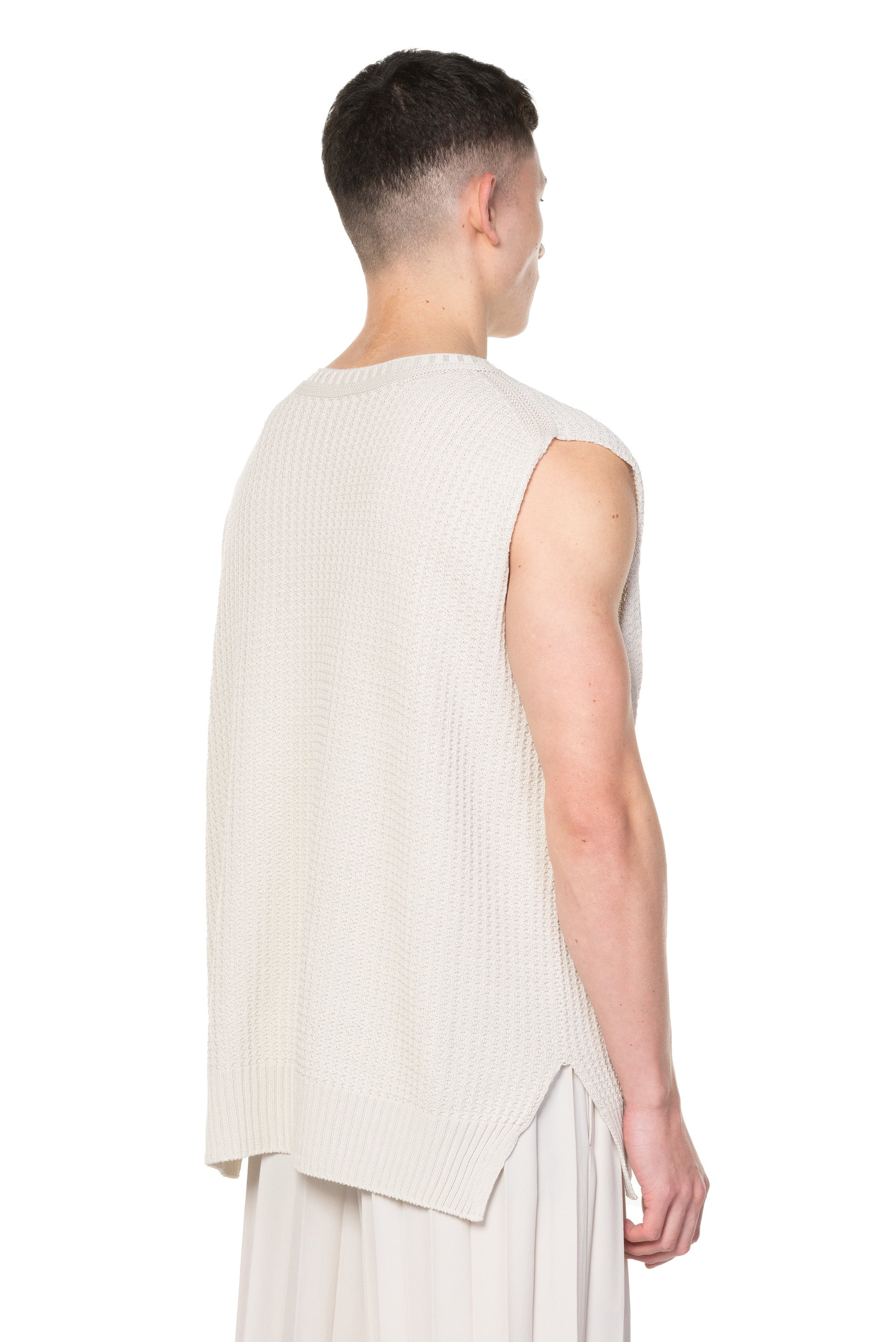 This knitted Vest has a round neckline. Sleeveless. Wide armhole. Slit at side. Reversible COMMON KNIT VEST made from cotton yarn and knit using lily knit stitch. Light garment fit for the warmer seasons. When worn inside out the knit structure resembles pleats.