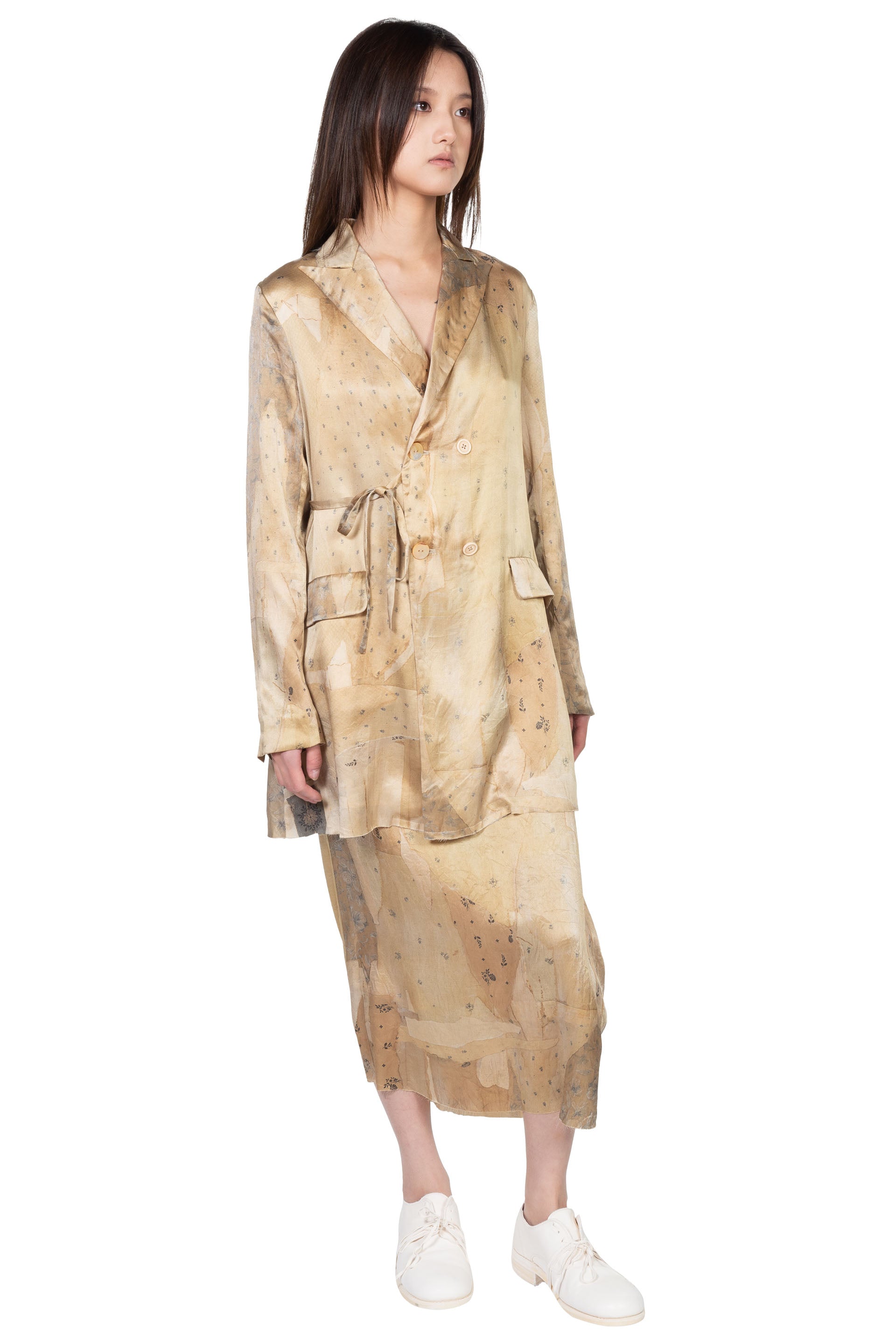Mid length. Zip closure at side. Lined. Light fabric. Printed silk throughout.