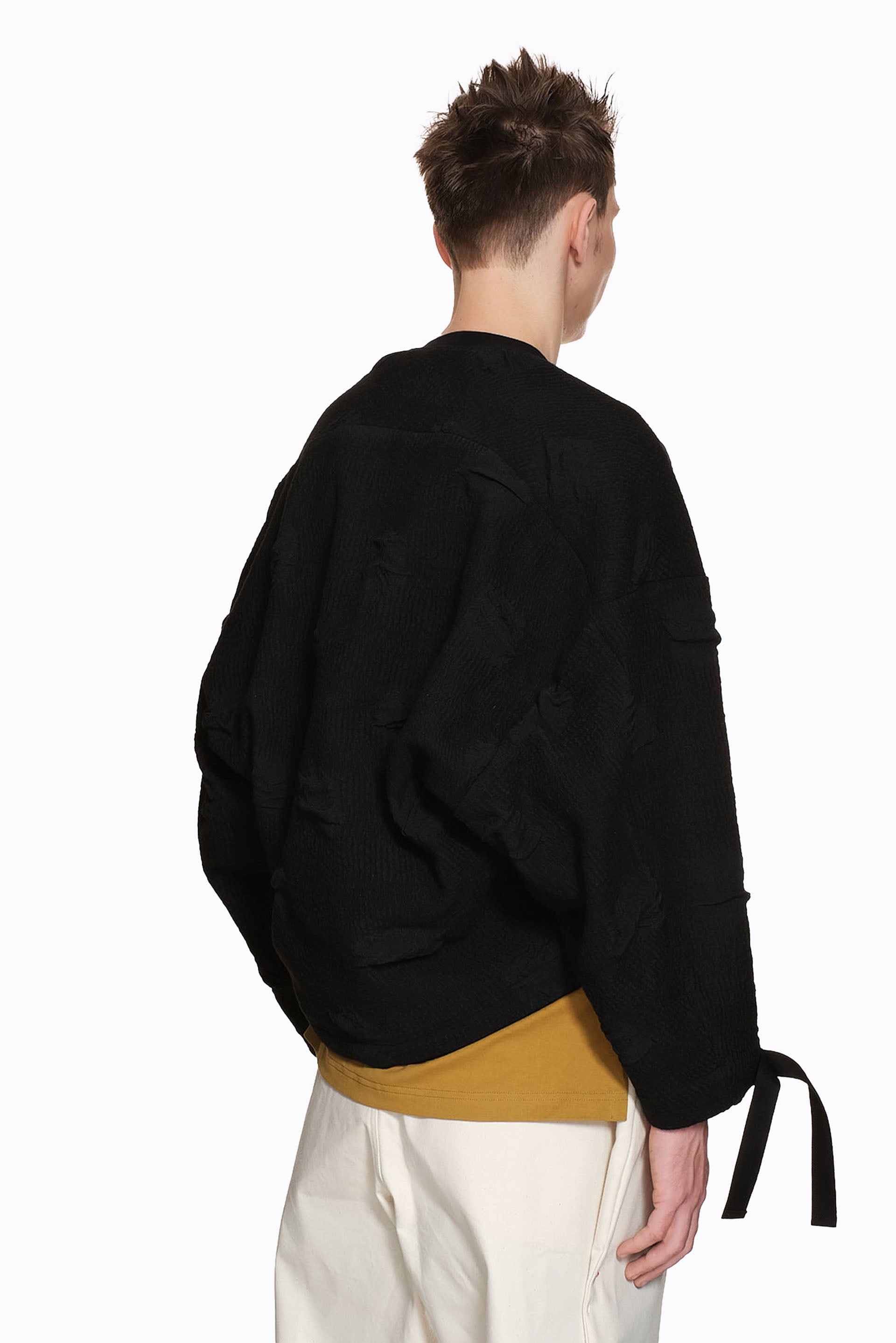 Long sleeve textured and stretchable cotton sweater in black with round neck. Patch pocket at the front and yoke at the back. Dropped shoulders.