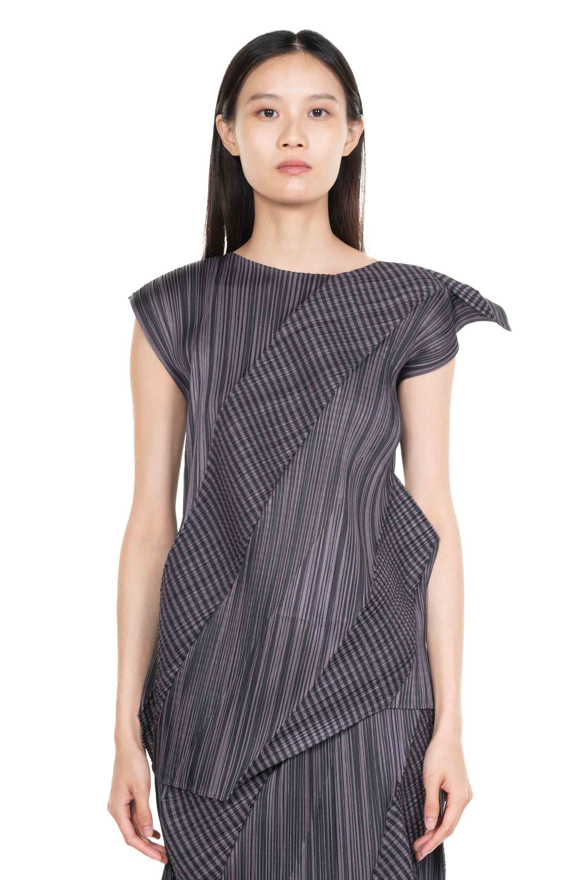 Grey pleated top from Pleats Please. Round neckline. Asymmetrical cap sleeves and hemline.