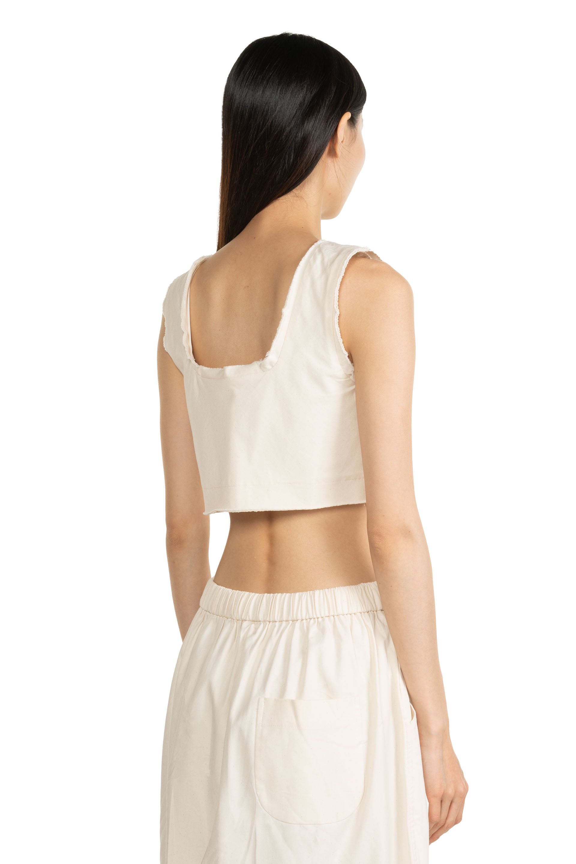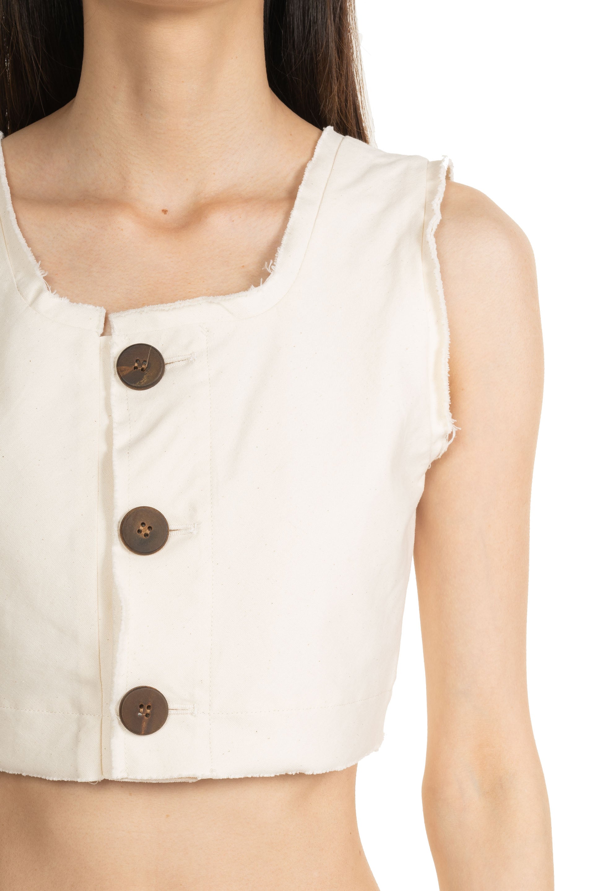 Kar tank top in Cotton. Sleeveless. Cropped. Three button closure at front. Signature wooden button. Raw edges finish. Soft cotton fabric.