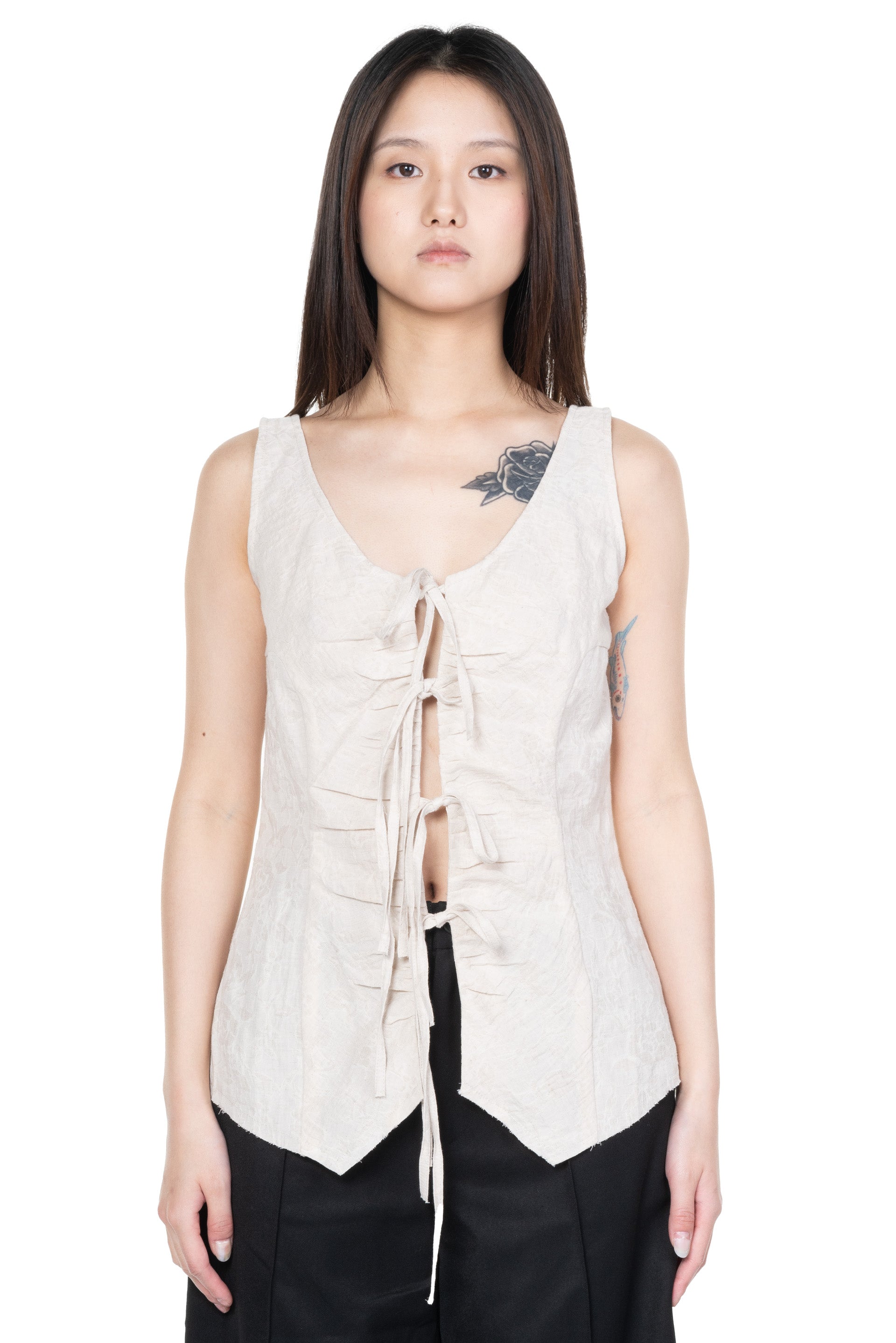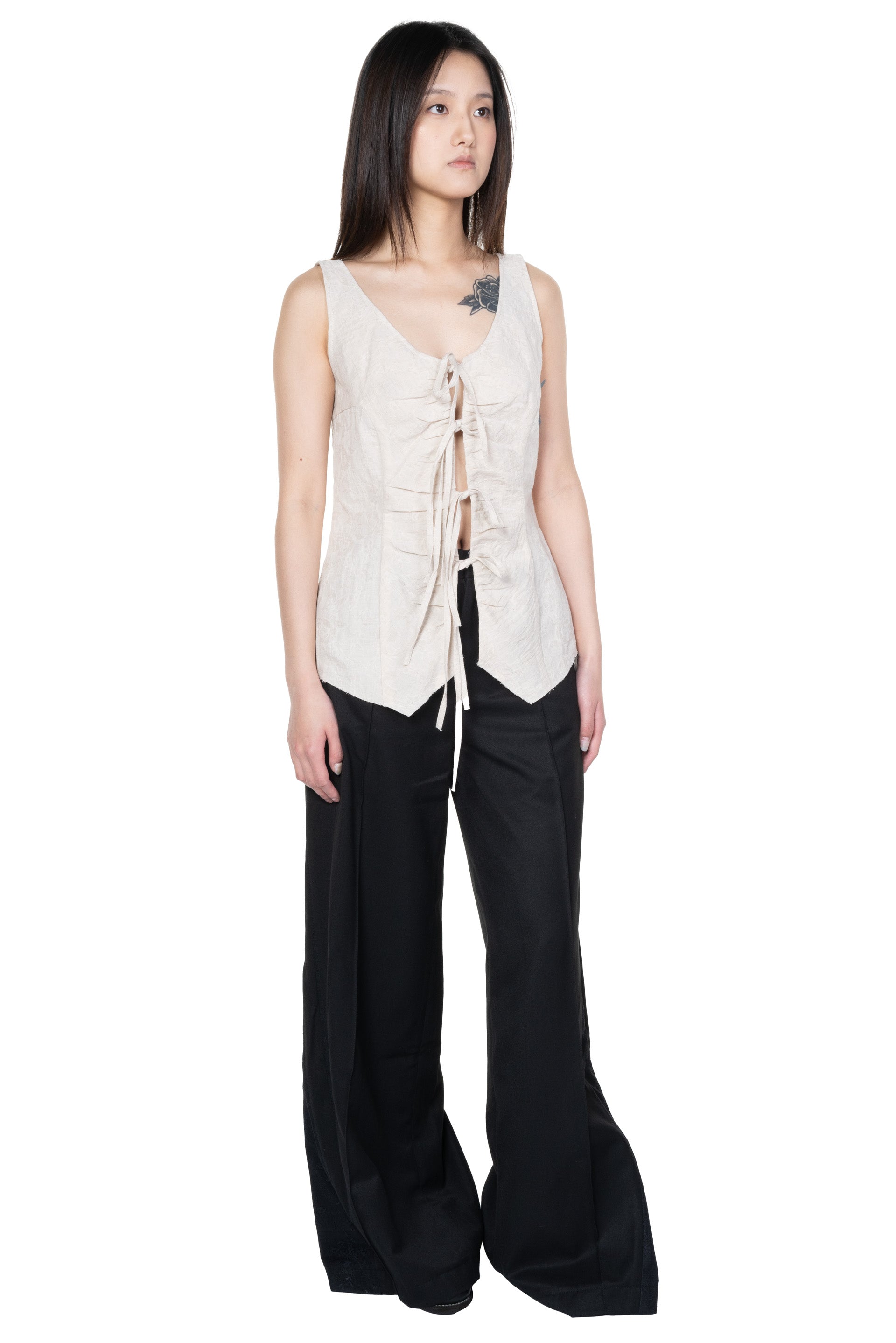 Professor. E Cross Linen Top Beige. Sleeveless. Bow closure at front. Signature details at front. Beautiful linen fabric.