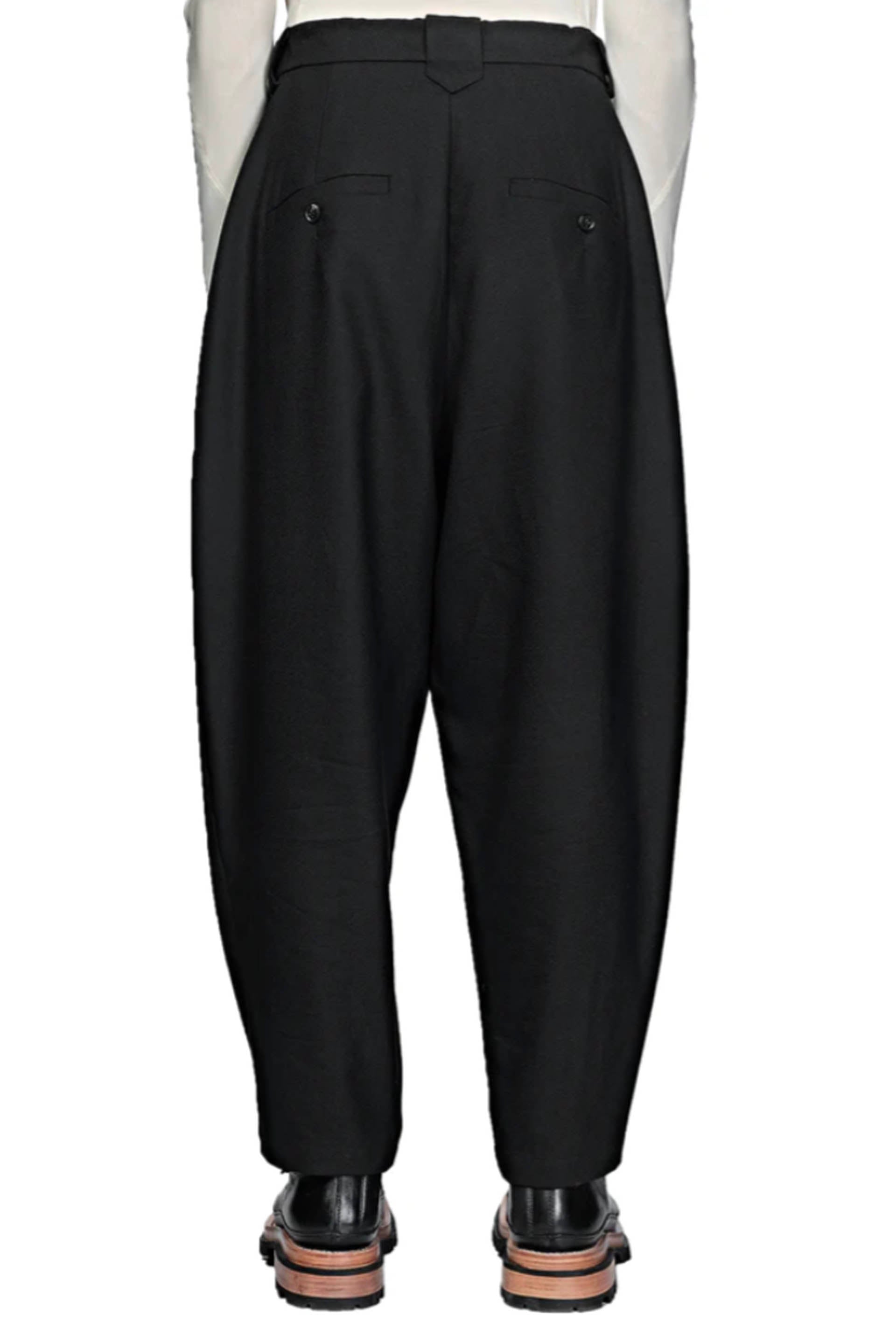 Slanted pleat long pants with four pockets. Adjustable strap detailing with tonal hardware and belt loops. Gun-metal hook at front. Low inseam. Zip-fly. Medium weight, breathable and comfortable.