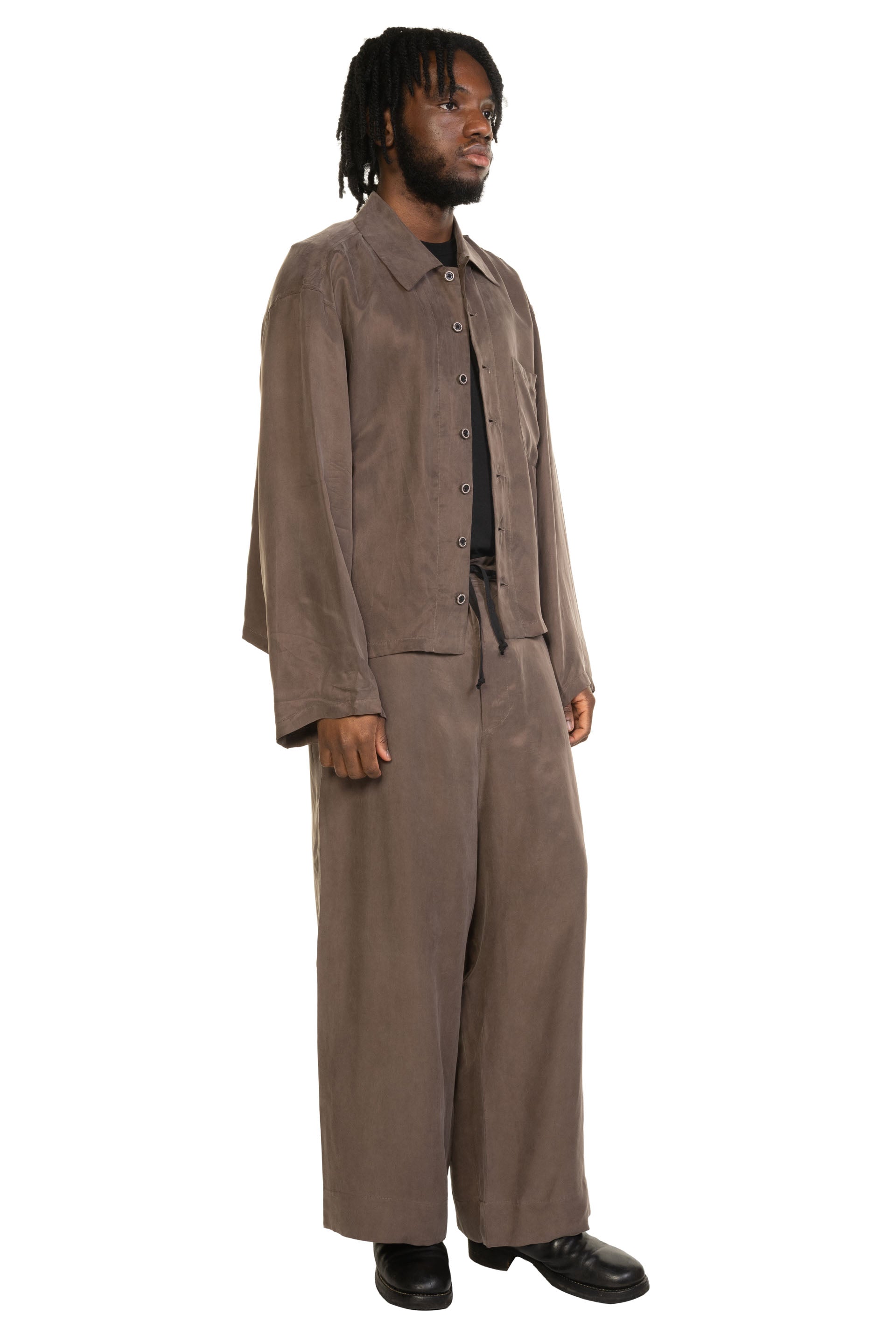 PENG approaches clothing as a quiet expression of the human experience, shaped by nature, time, and the body. Designed by Zhi-Chen Tai (formerly Peng Tai), each piece reflects a considered balance between conceptual design and everyday wearability. Natural elements such as leaves, soil, and organic textures inform the materials and silhouettes, resulting in garments that feel thoughtful, tactile, and timeless. Defined by refined craftsmanship and contemporary form, PENG offers modern menswear with a calm, organic sensibility, clothing designed to be worn, lived in, and appreciated over time as seen with the Cupro Trousers Dust Brown.