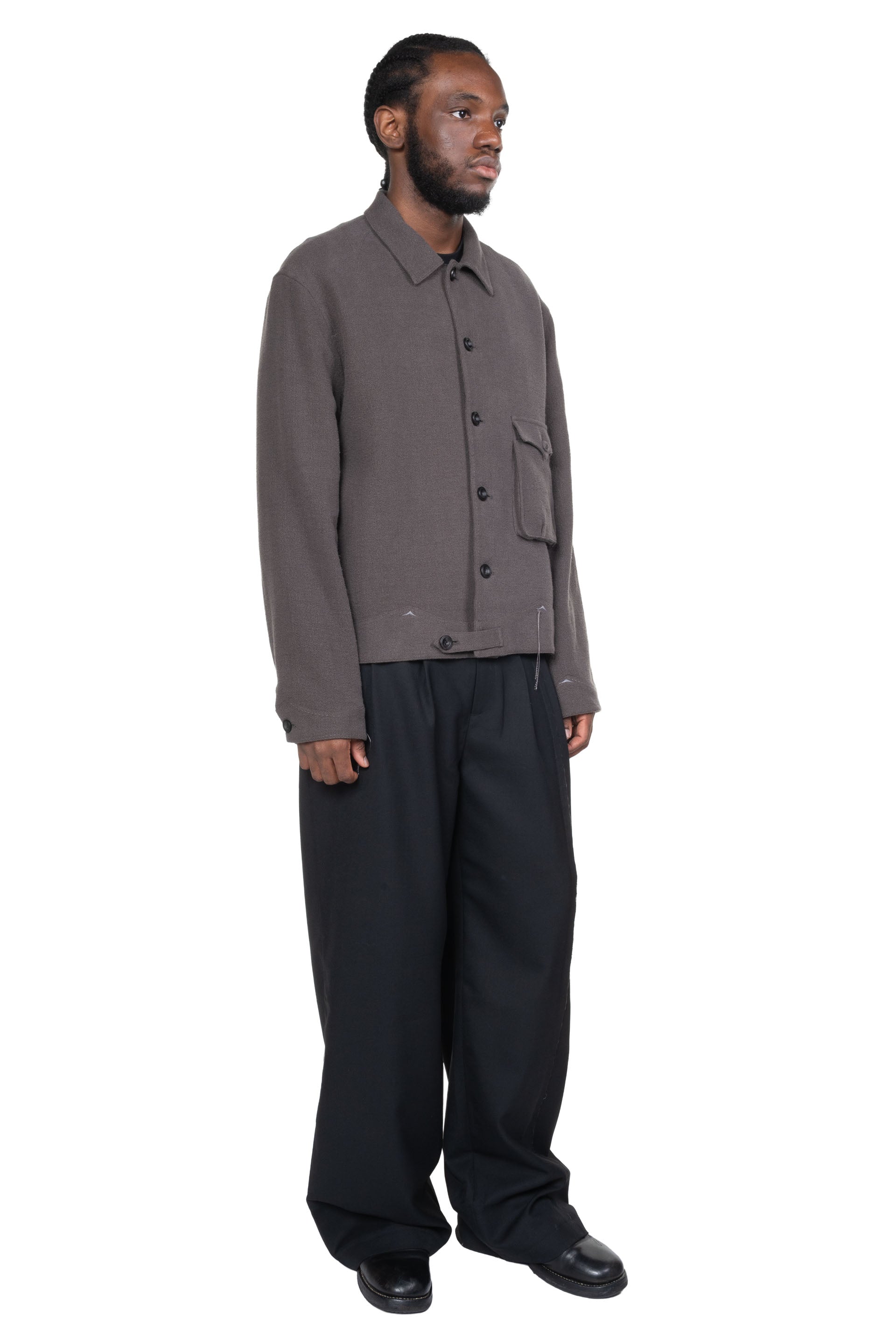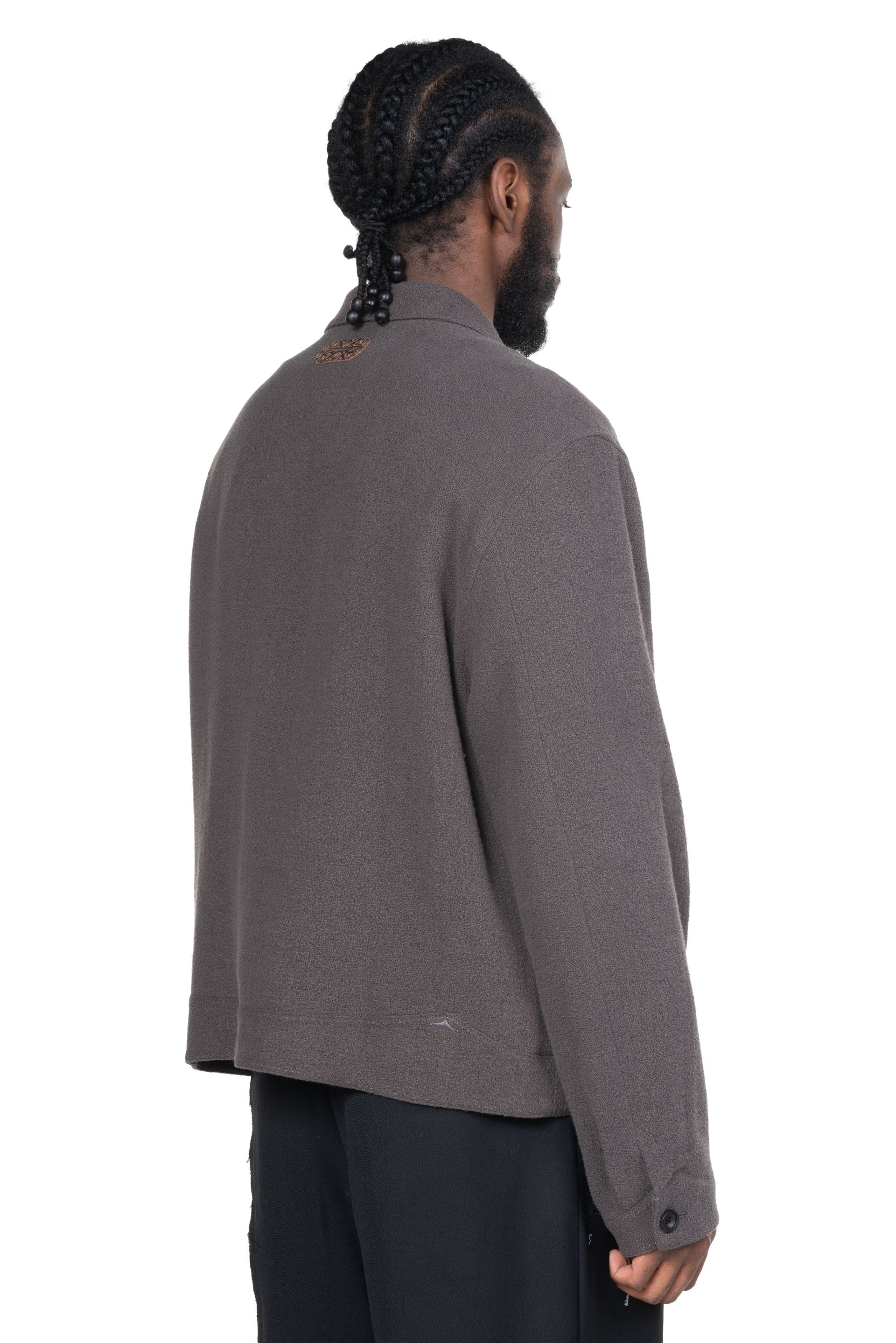 A modern reinterpretation of a 1930s French cyclist jacket from our archive, this piece features an enlarged silhouette infused with signature design elements from E. The original single pocket and the distinctive buttoned placket detail are thoughtfully preserved, while an embroidered button at the chest adds a striking focal point. Professor e cyclist jacket in grey. Long sleeves. Button closure at front. Side pockets. Pocket at front with seasonal details. Signature details at back. Boxy cut. Lined. Regular collar.