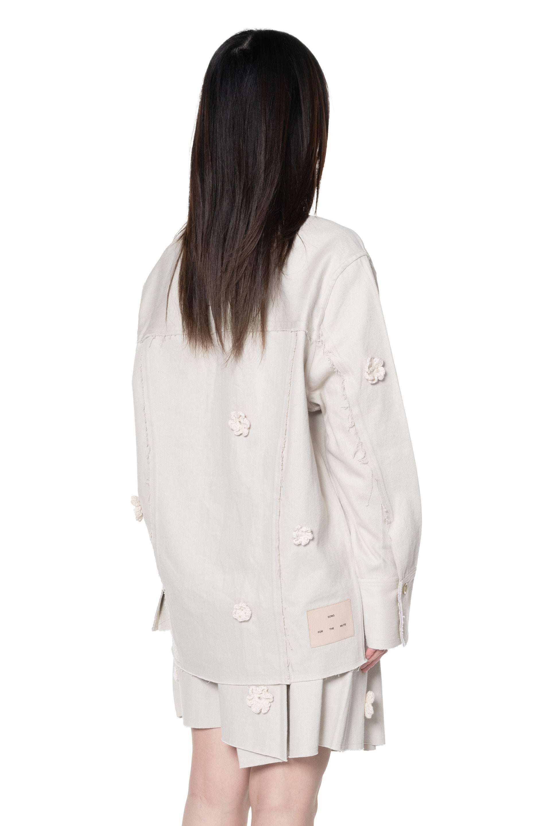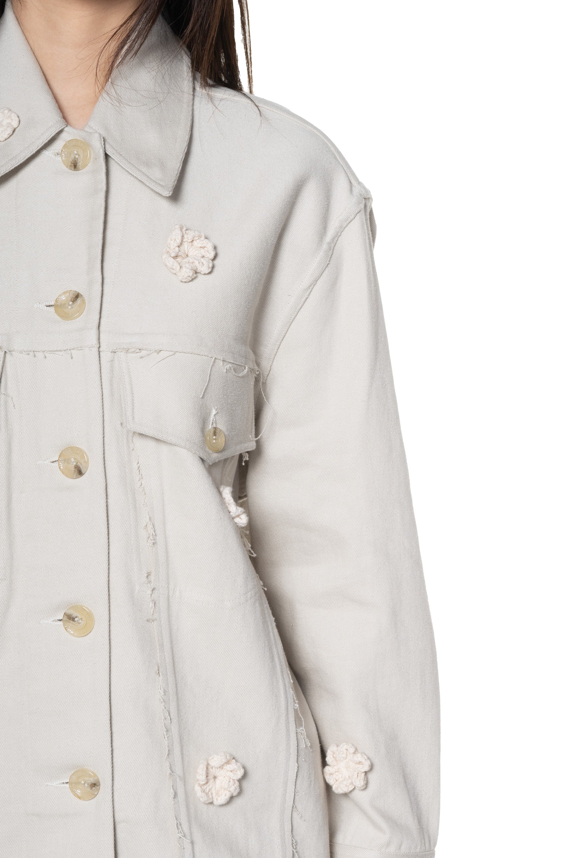 Song for the Mute worker jacket. Long sleeves. Button closure at front. Button closure at cuffs. Spread collar. Pocket at front. Two side pockets. Embroidered daisy flower throughout.