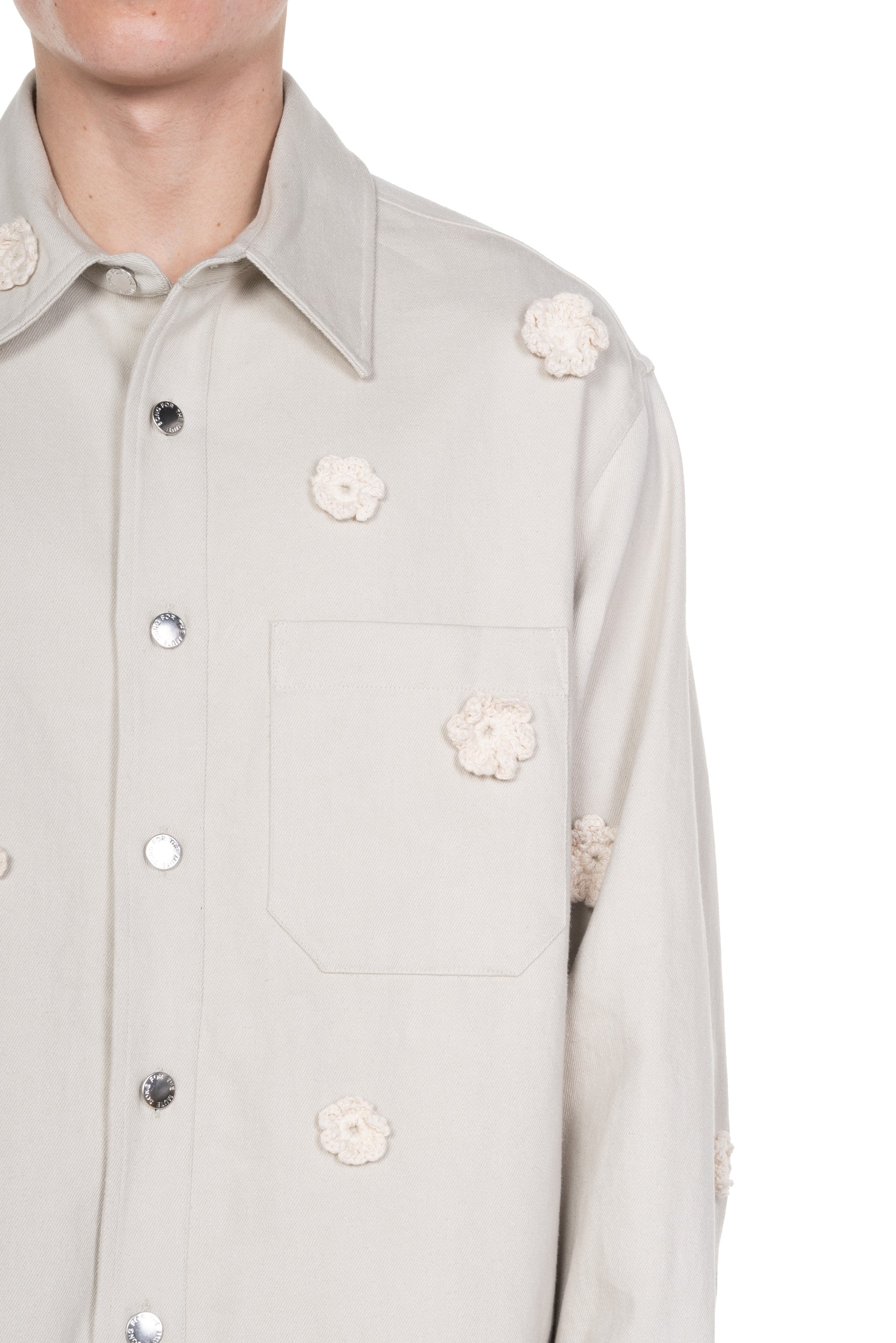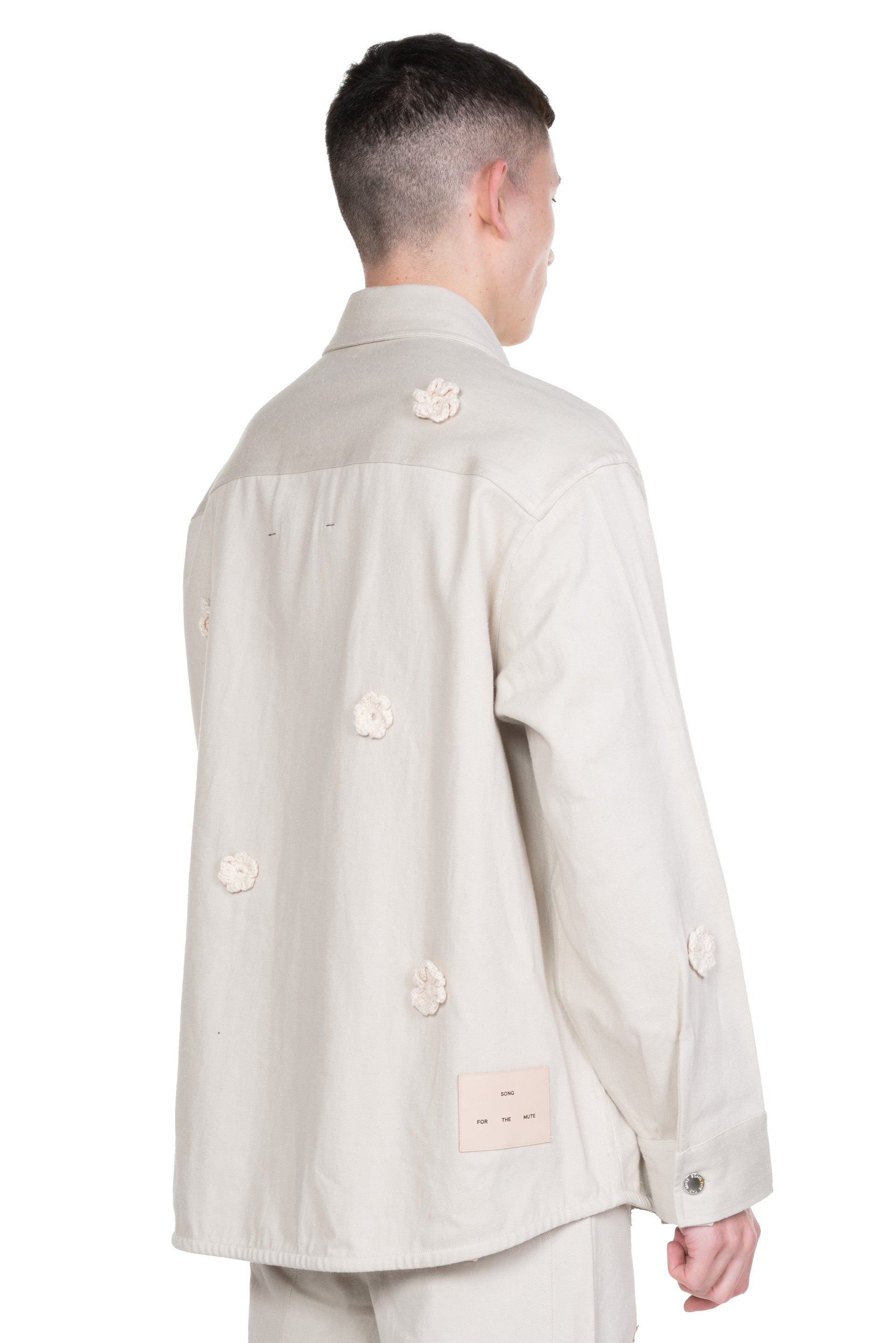 Song for the Mute shirt jacket. Long sleeves. Button closure at front. Button closure at cuffs. Spread collar. Pocket at front. Two side pockets. Embroidered daisy flower throughout.