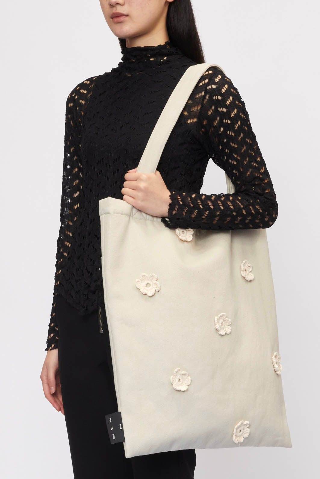 Song for the Mute rectangular shape tote bag. Slightly padded hemp cotton mix canvas. Daisy flowers embroidery throughout. Two inside compartment. Shoulder strap.