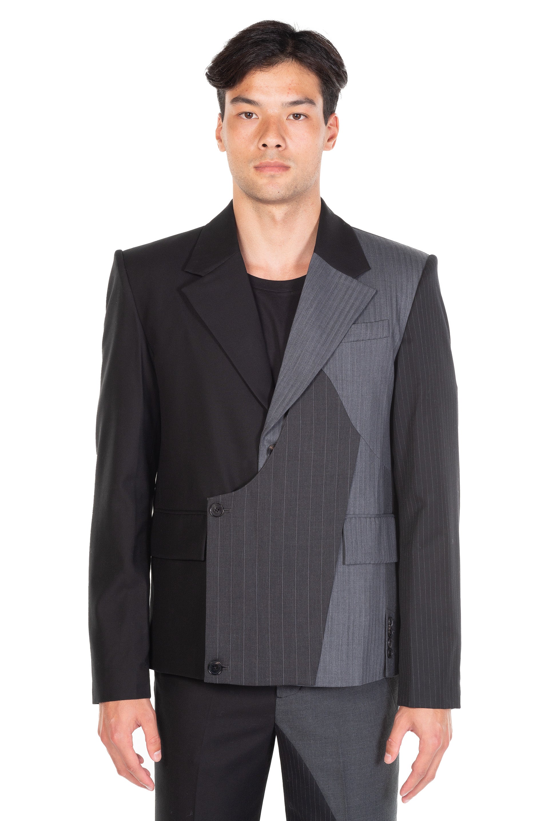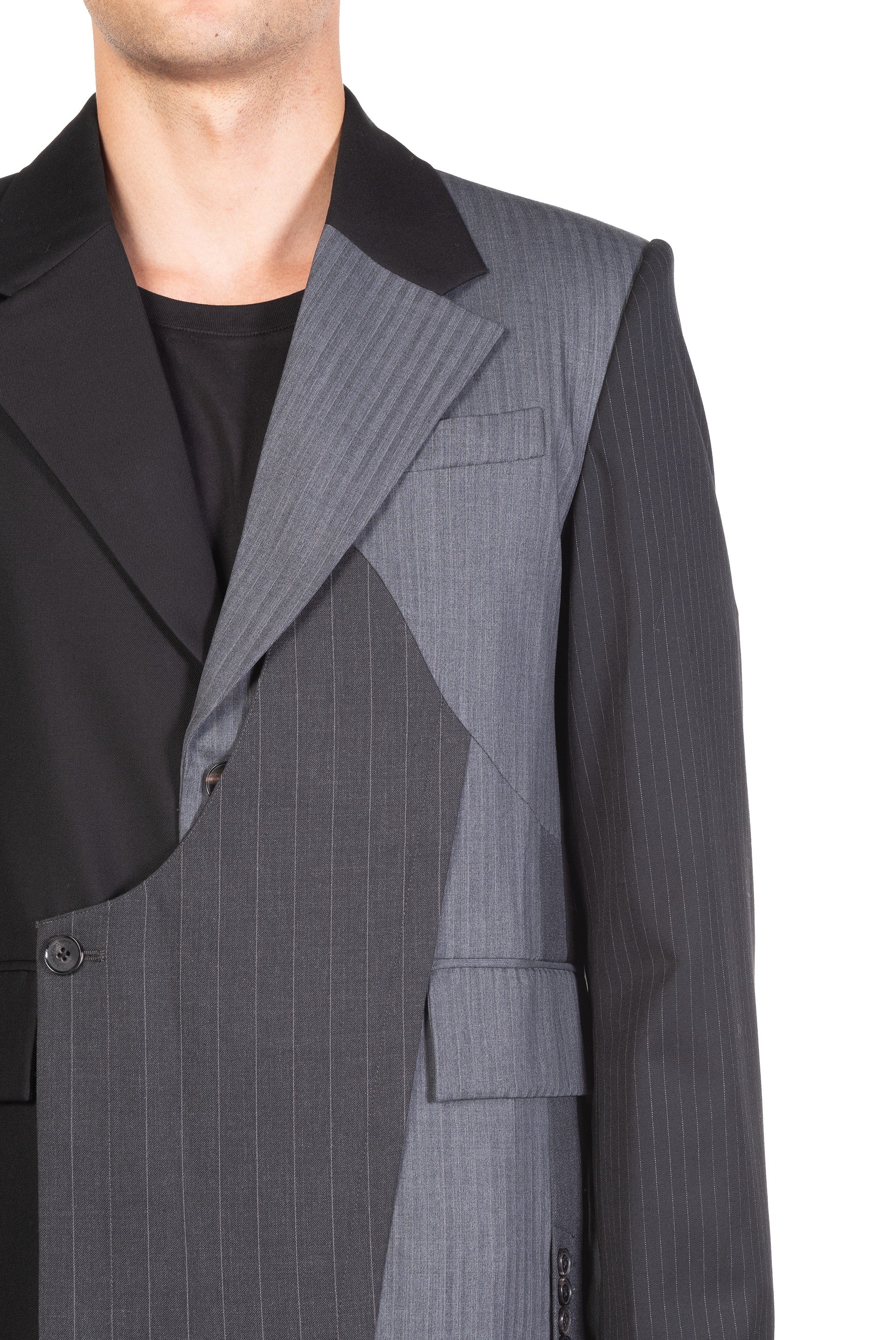 Long sleeves. Button closure at front. Padded shoulders. Deconstructed closure at front. Deconstructed design throughout. Signature patchwork.