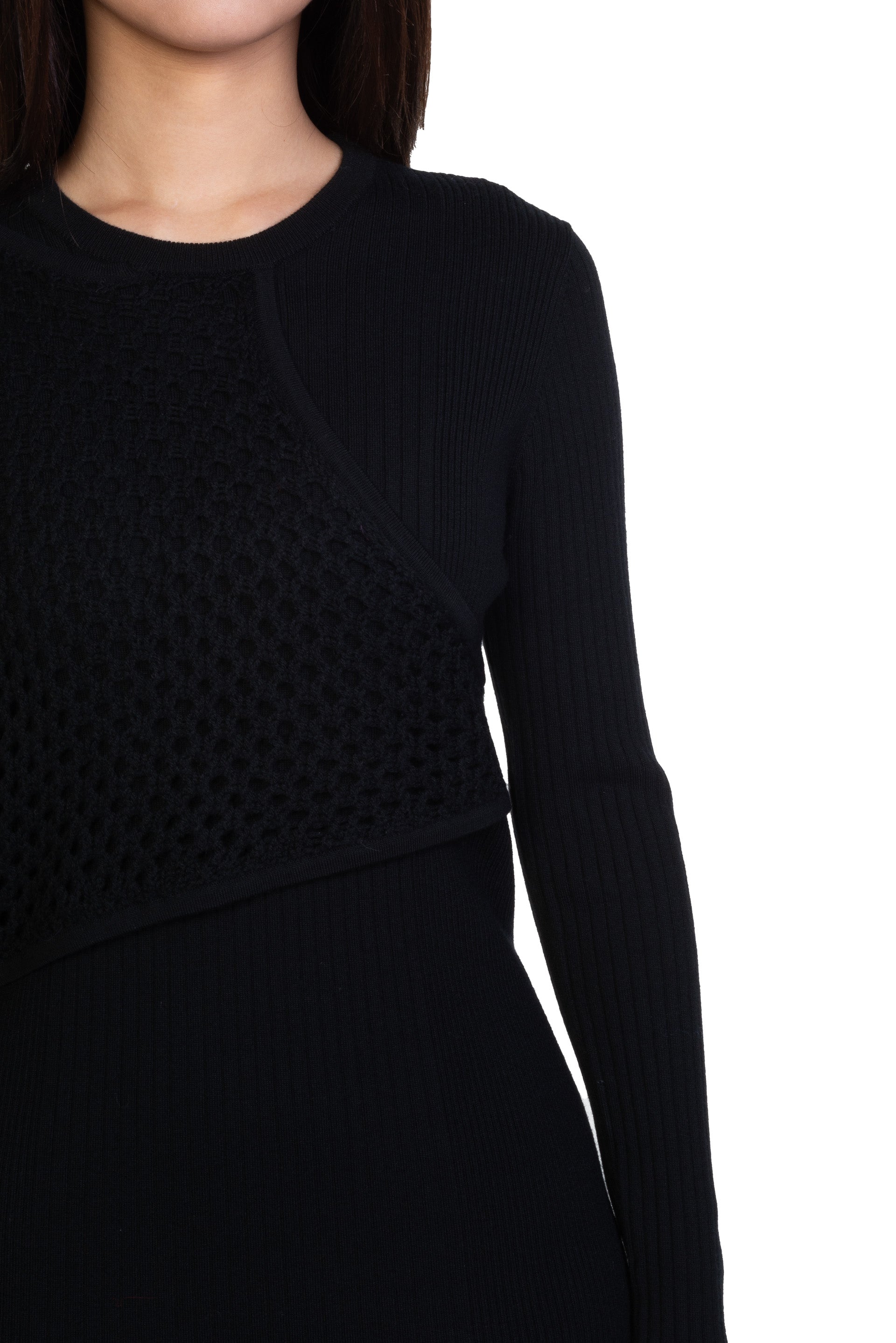 Long sleeves. Round neck. Deconstructed design. Multi knit details throughout.