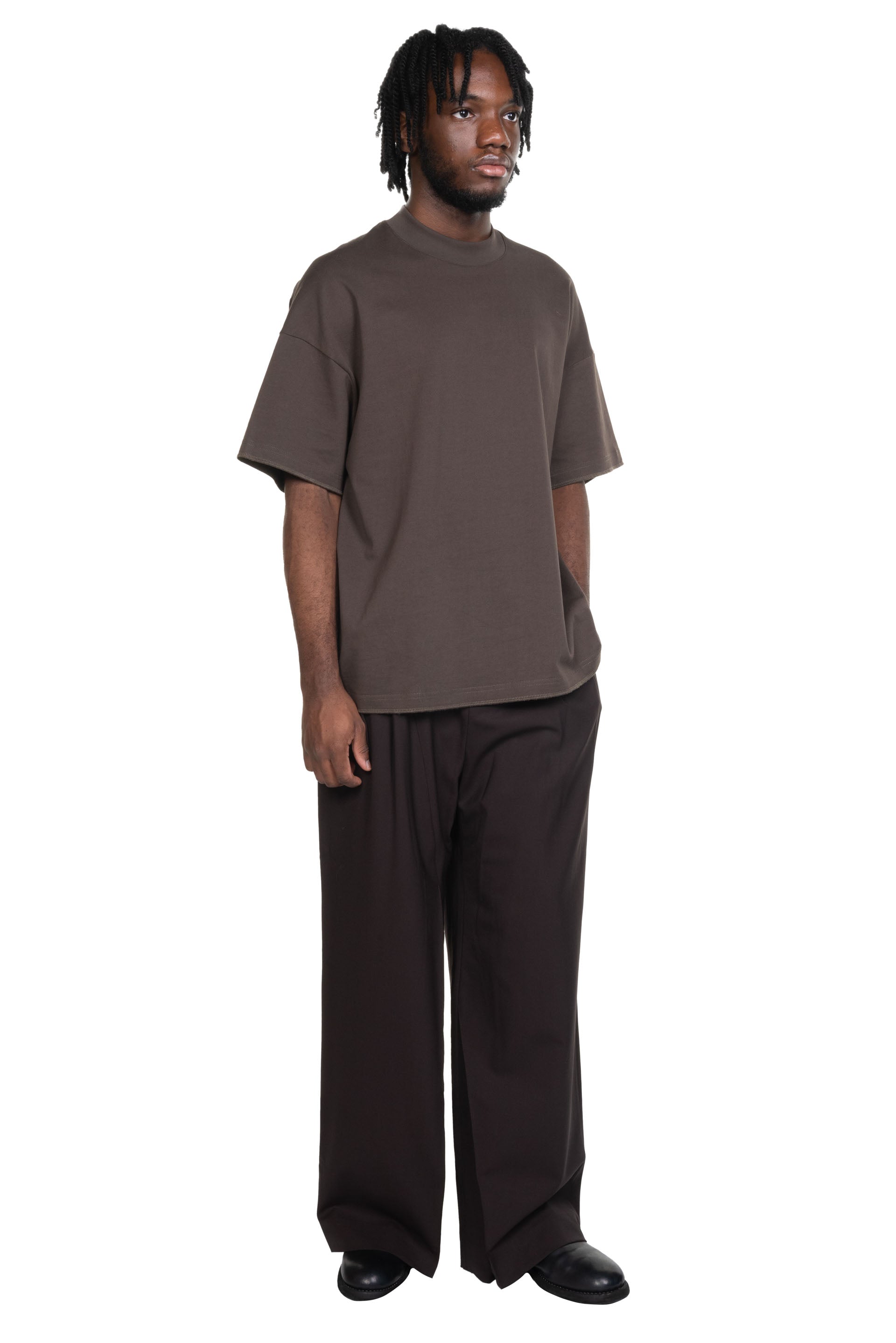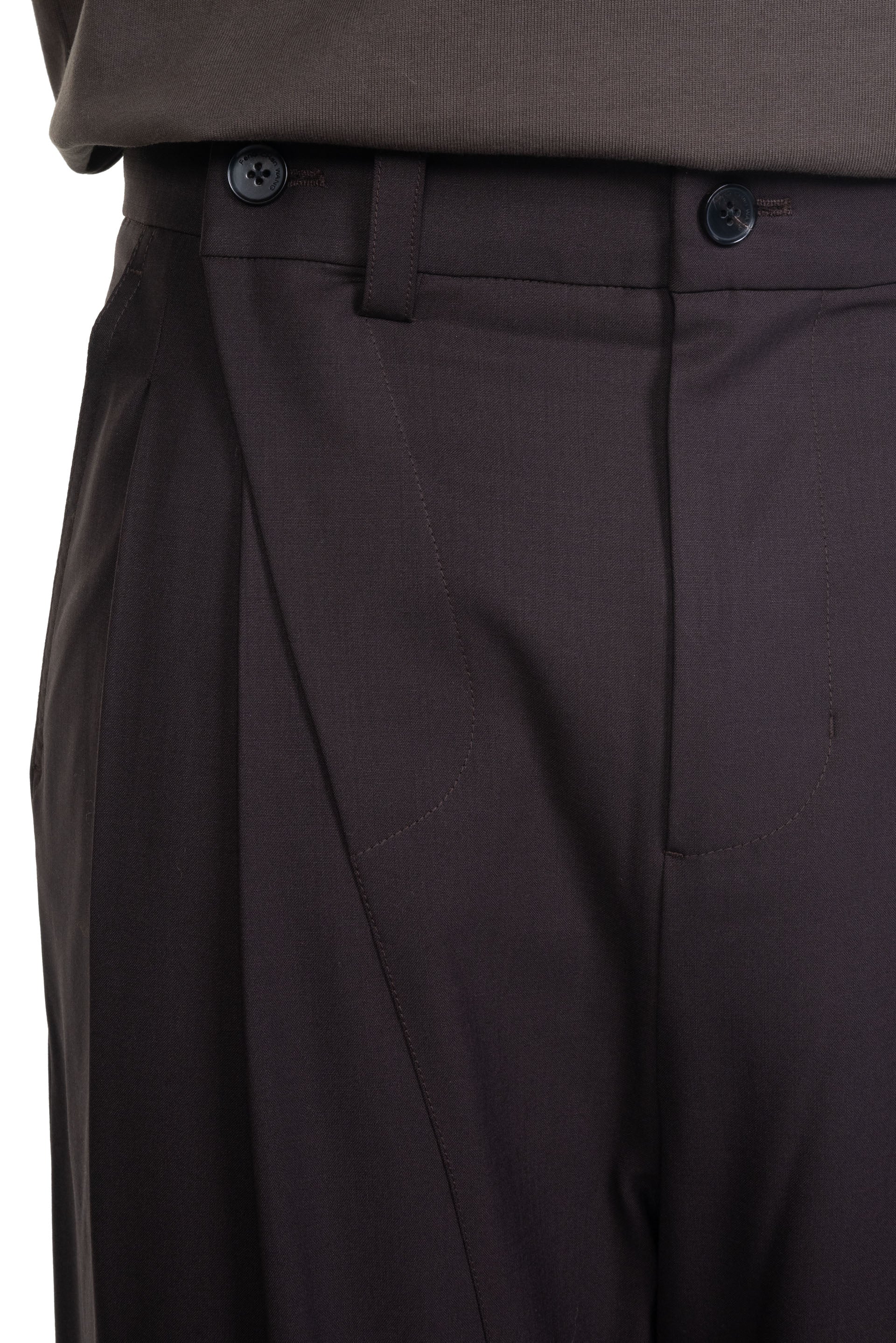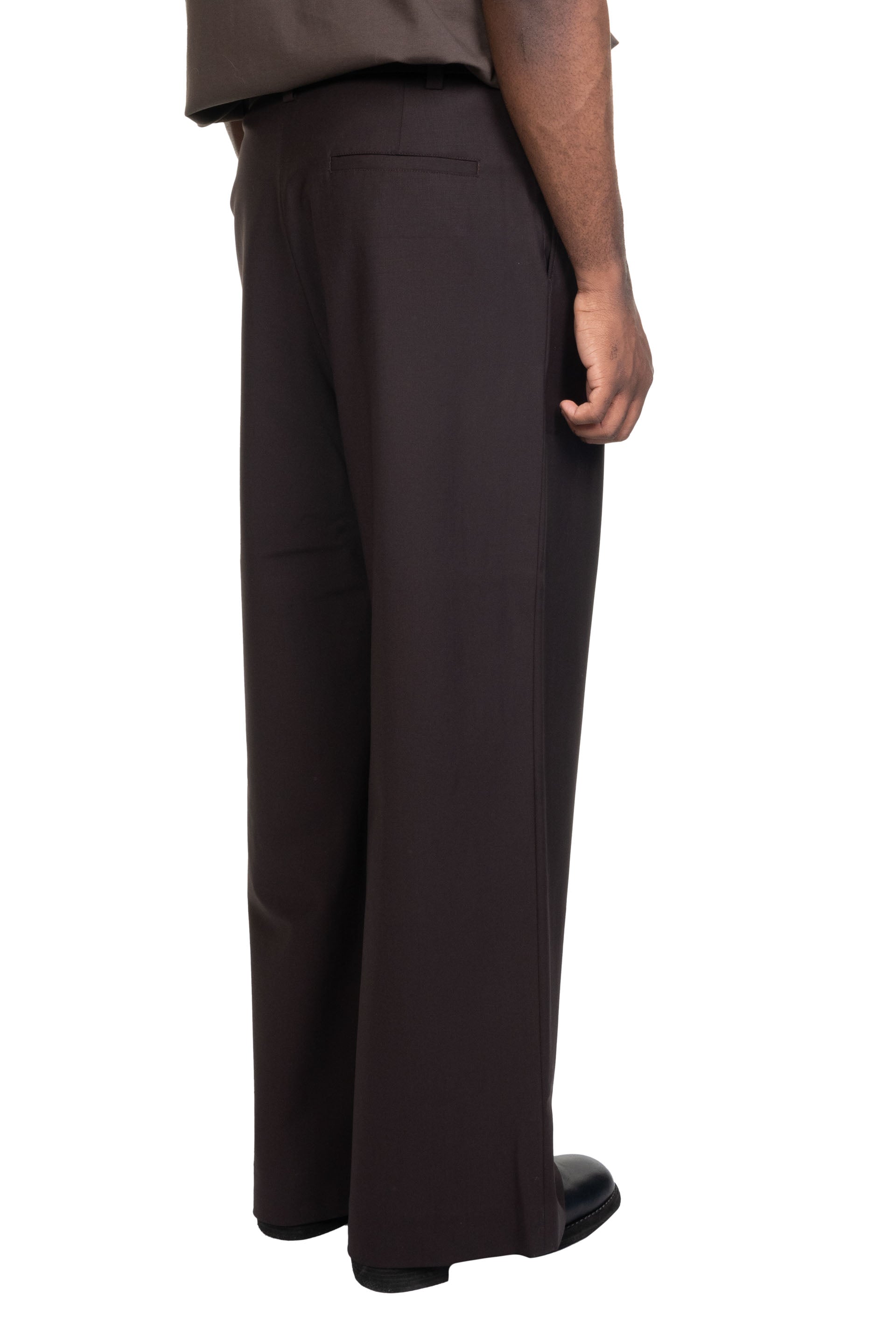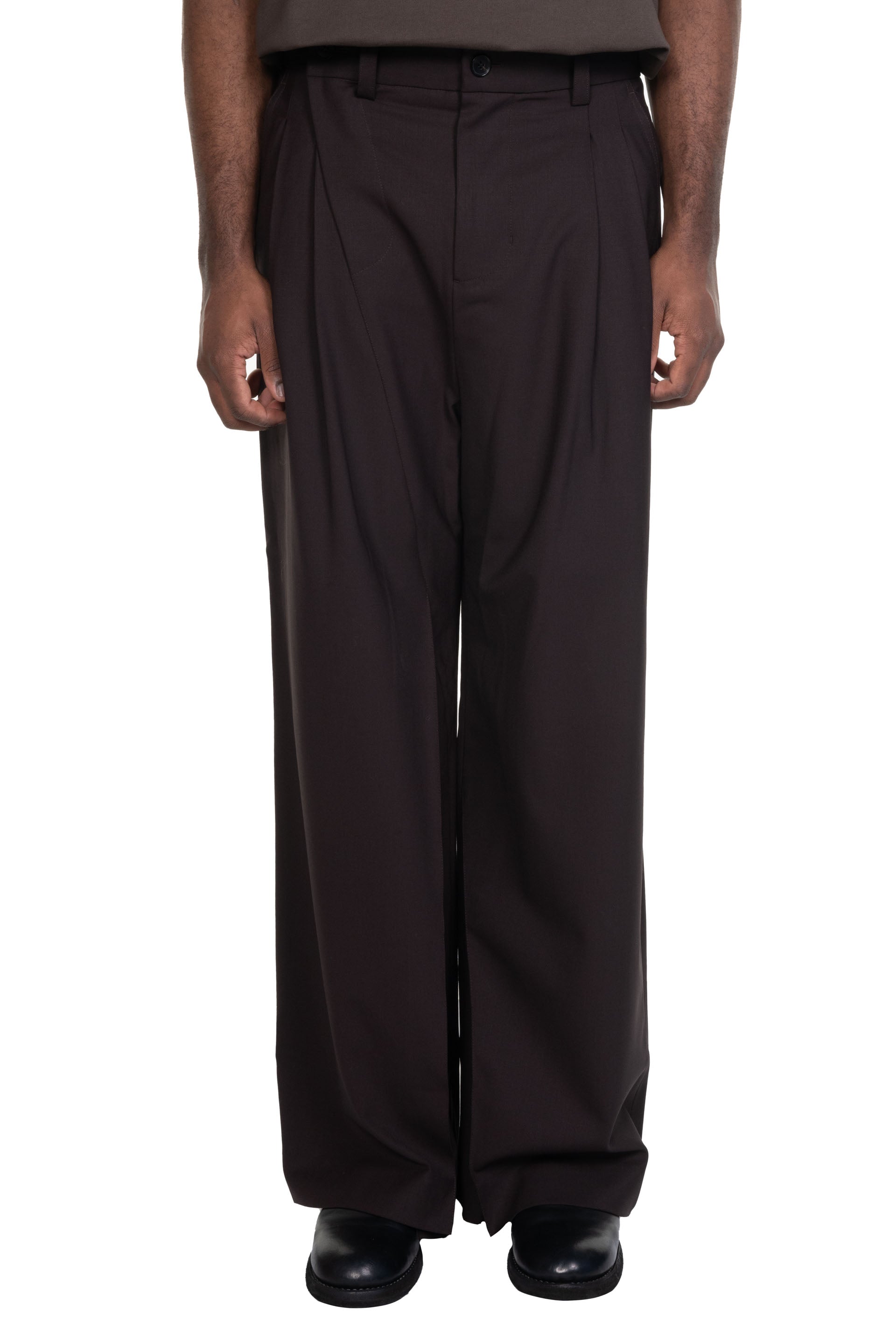 Button closure at waist. Two side pockets. Two back pockets. Long wide fit. Light textured wool fabric. Deconstructed details throughout. Wide long fit.