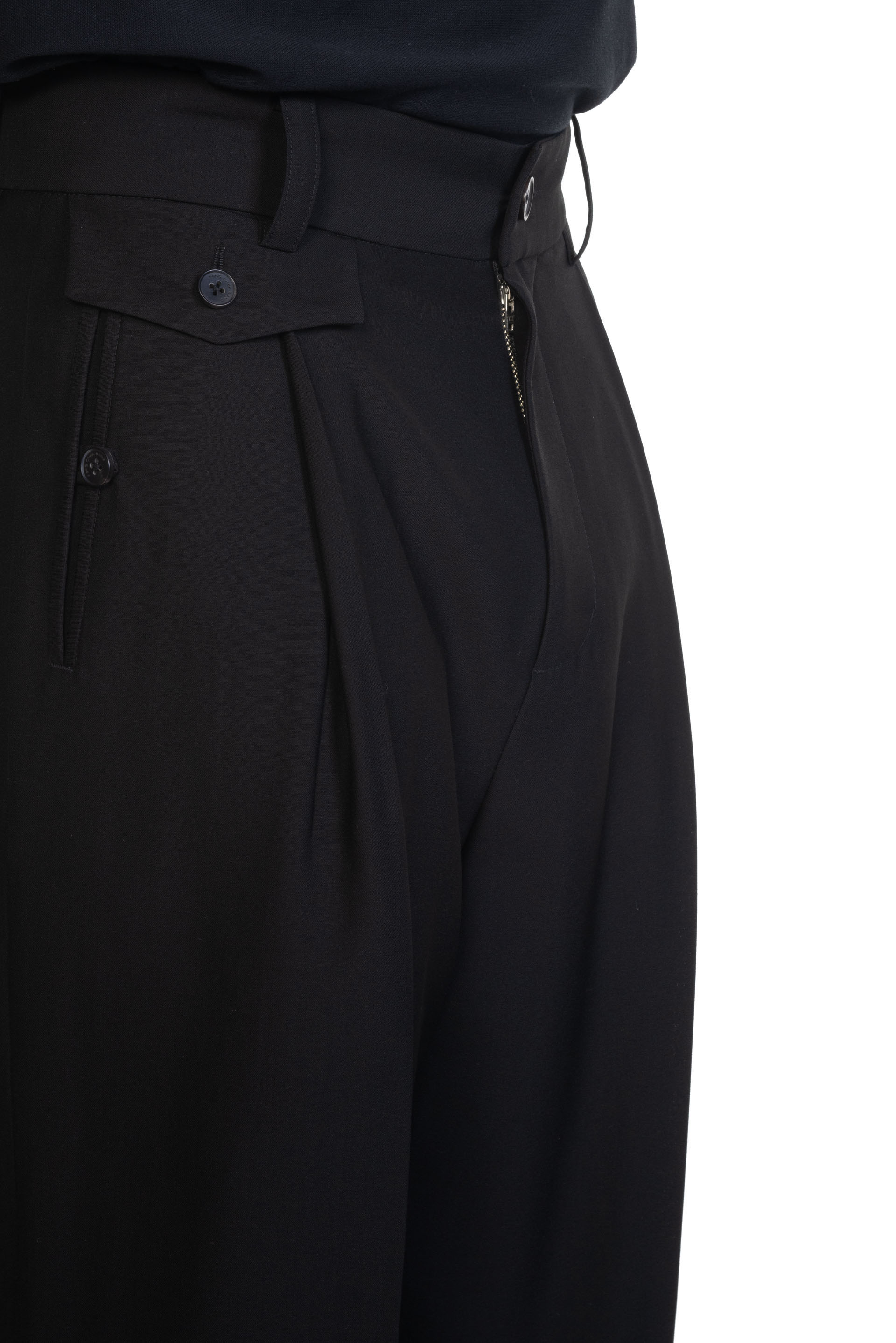 Feng Chen Wang Deconstructed black trousers. Button closure at waist. Two side pockets. Pleated at front.