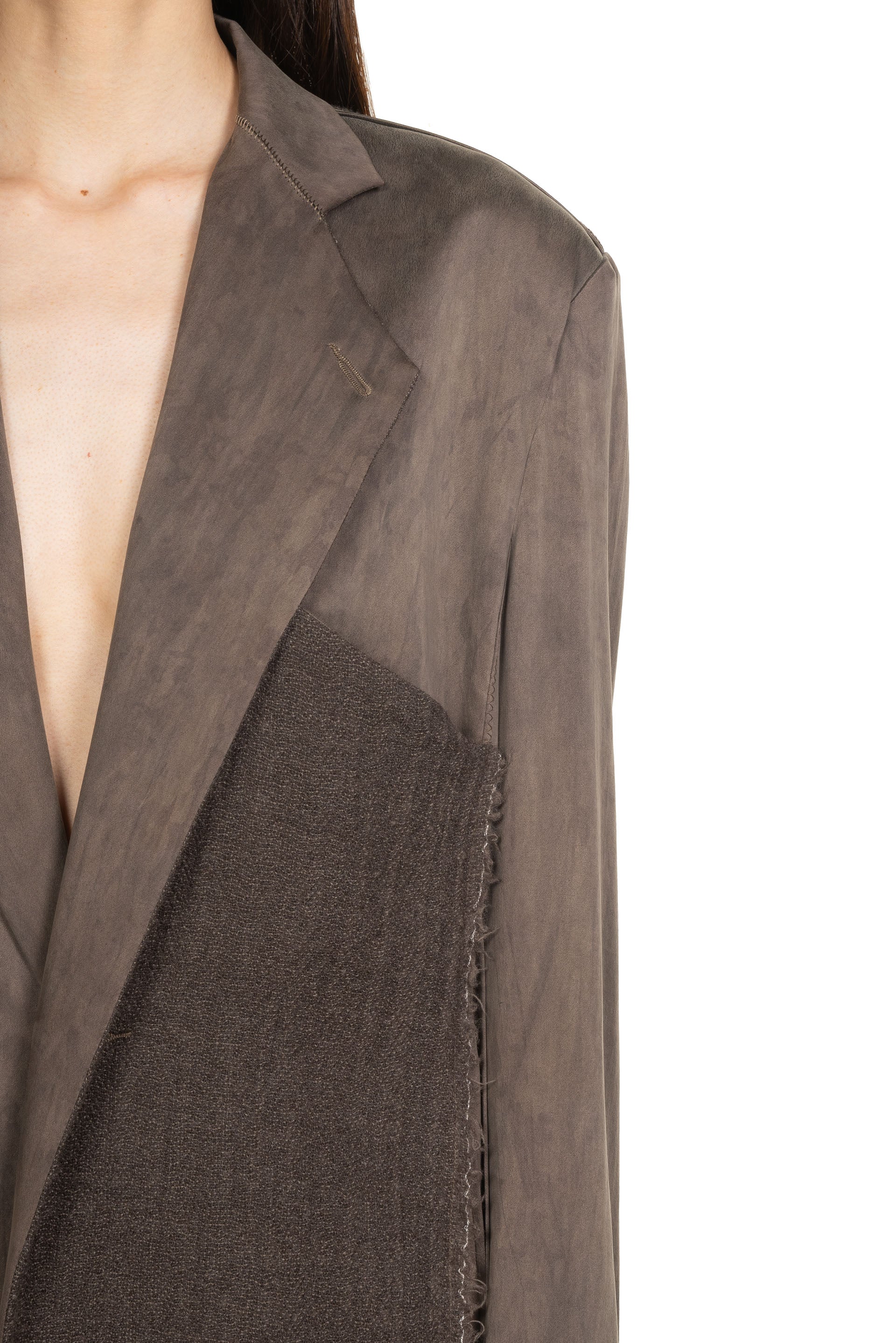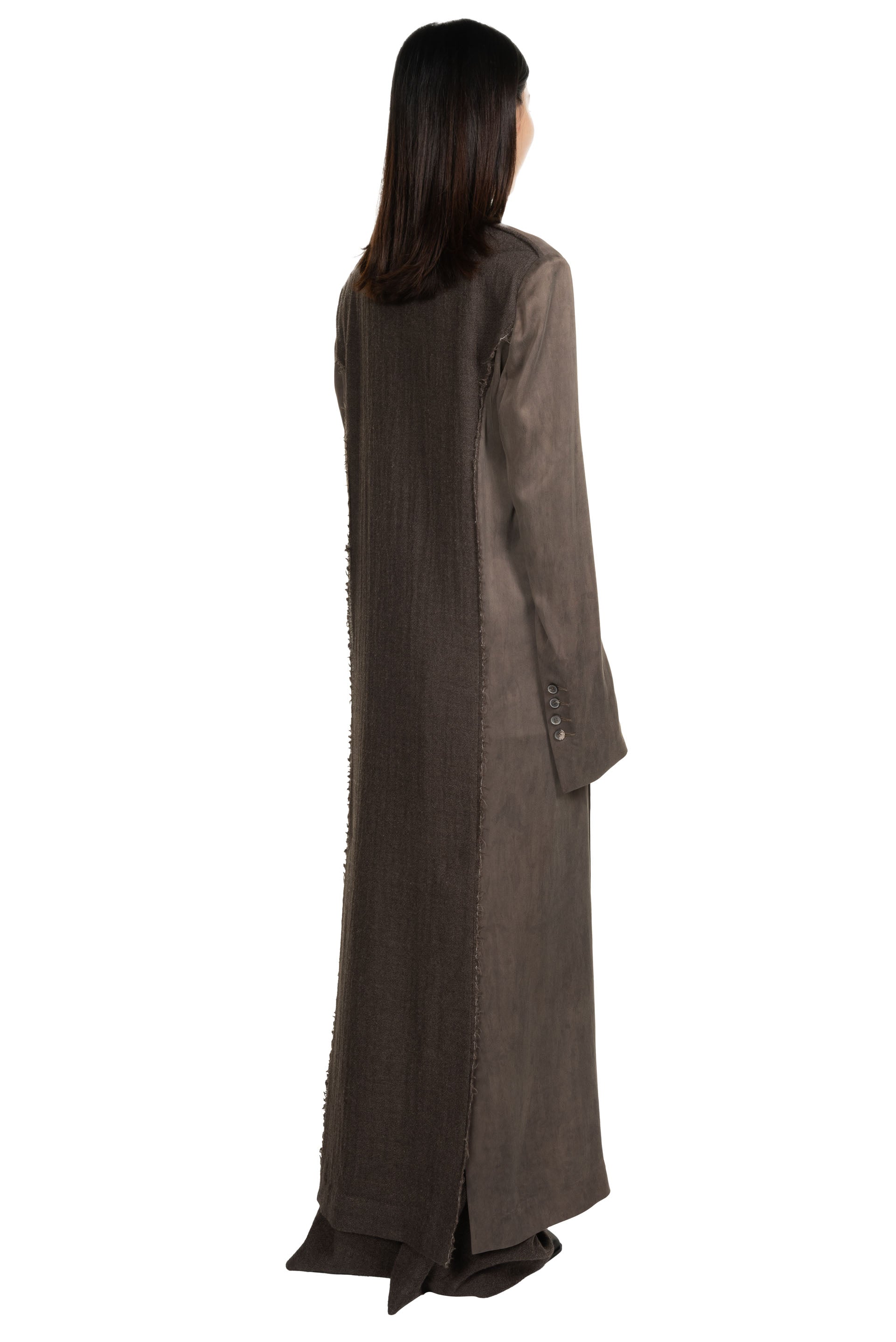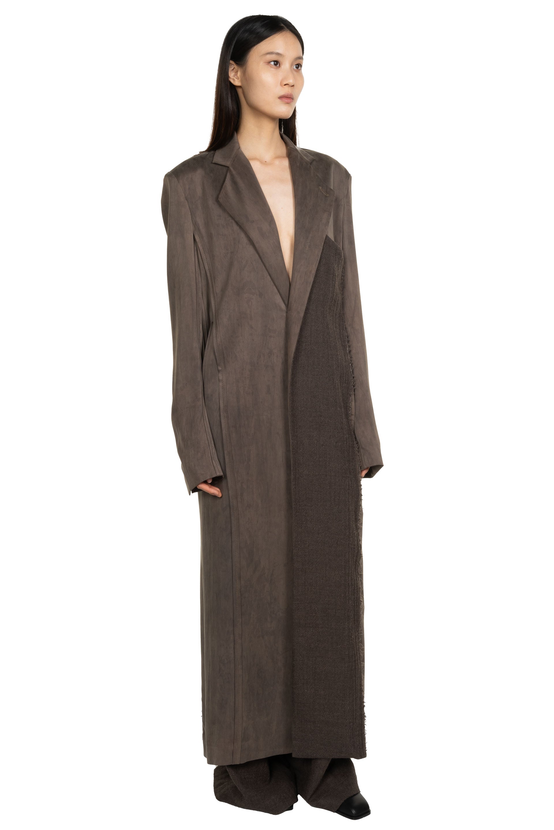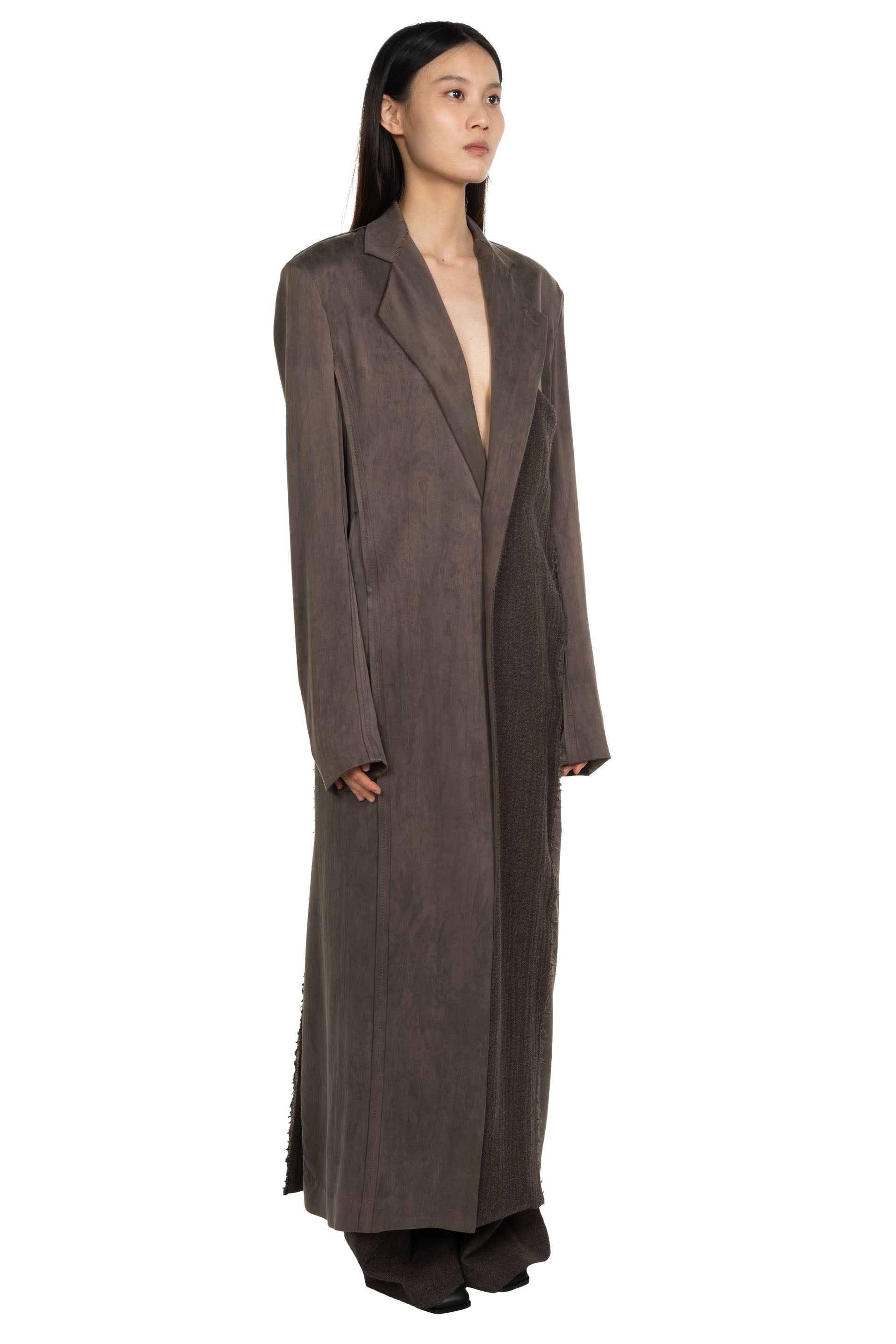 Yehuafan Deep Violet Coat. Long coat with multi fabric in deep violet. Button closure at front. Silk and knitted wool mix. Soft and textural feel. Two side pockets.