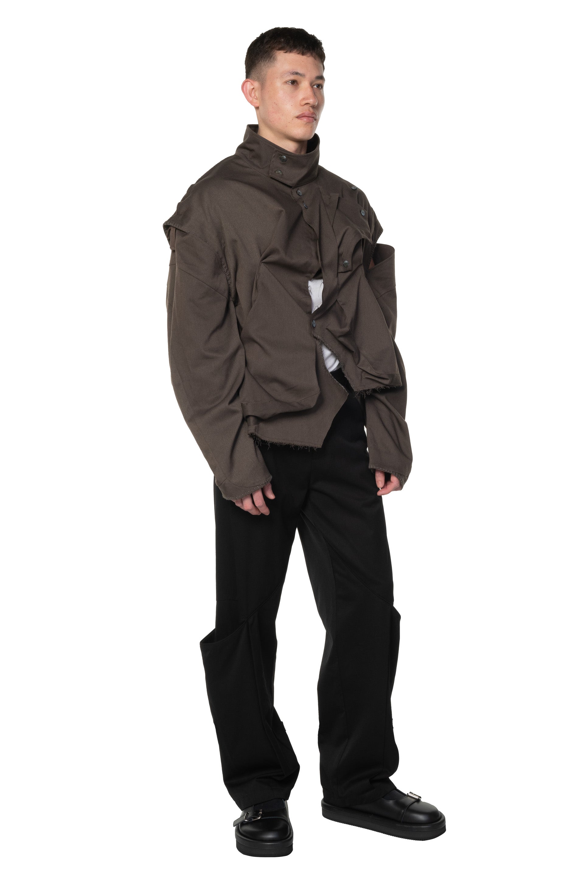 Aenrmous plays heavily with layers, asymmetry, deconstruction of pieces and detachable or adjustable elements. The brand understands trends while building something new and exciting as seen with the Deepi Crescent Jacket II Brown.