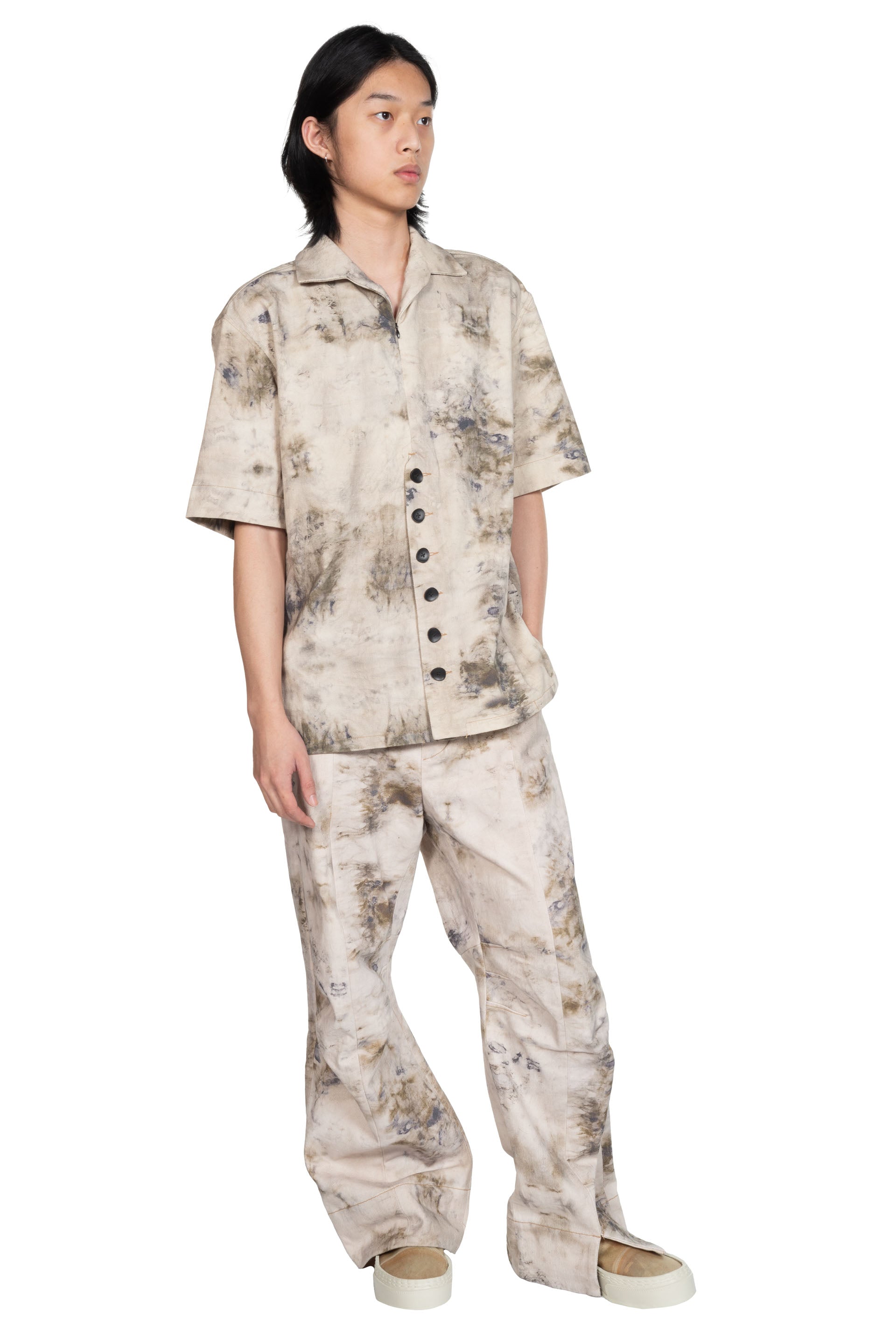 Peng Tai creates modern silhouette with traditional chinese philosophy. Inspired by how Chinese herbal medicine regulates the body from the inside out, Peng Tai aims to research and develop a way to boil Chinese herbal medicine with fabrics, to create clothes that feel like a second skin as seen with the Denim Button Zip Working Shirt.