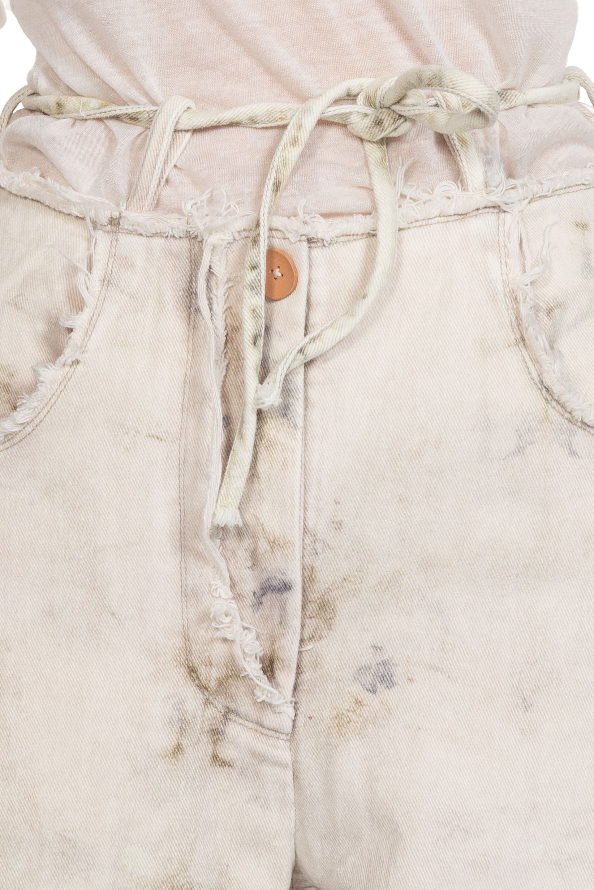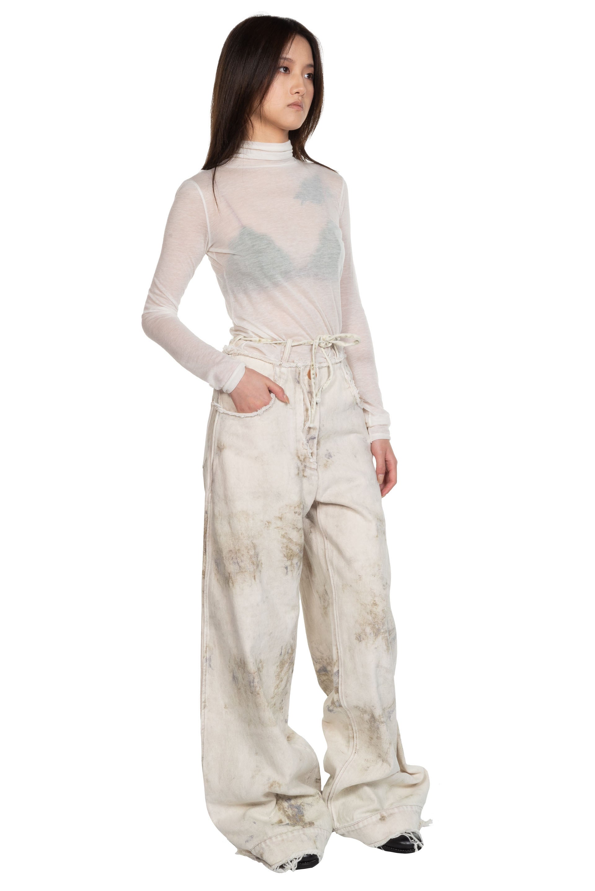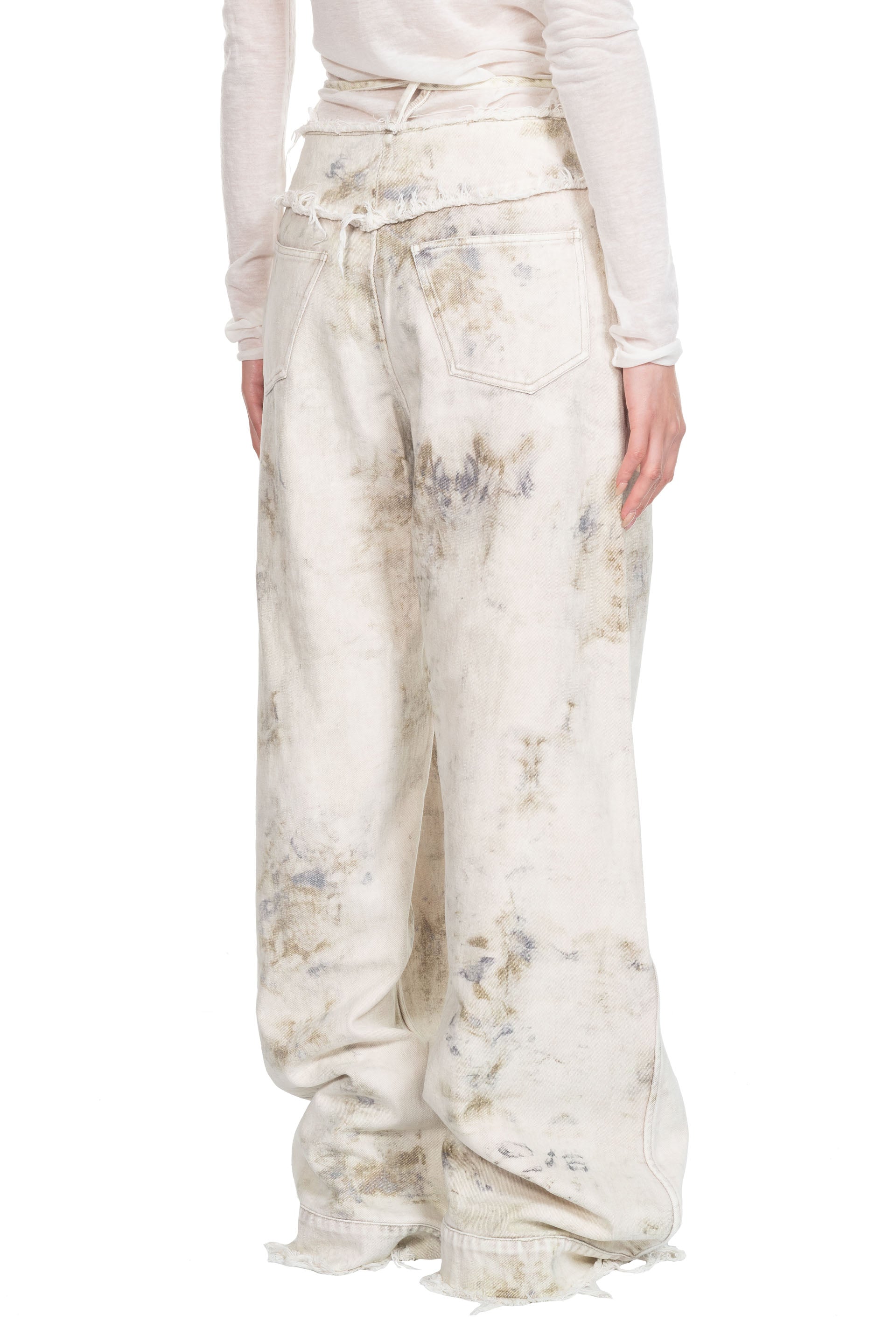 Peng Tai creates modern silhouette with traditional chinese philosophy. Inspired by how Chinese herbal medicine regulates the body from the inside out, Peng Tai aims to research and develop a way to boil Chinese herbal medicine with fabrics, to create clothes that feel like a second skin as seen with the Denim Jazz Jeans. Two Side pockets. Two back pockets. Belt loops at waist. Deconstructed belt. Button closure at waist. Wide leg. Raw edges throughout. Leather button.