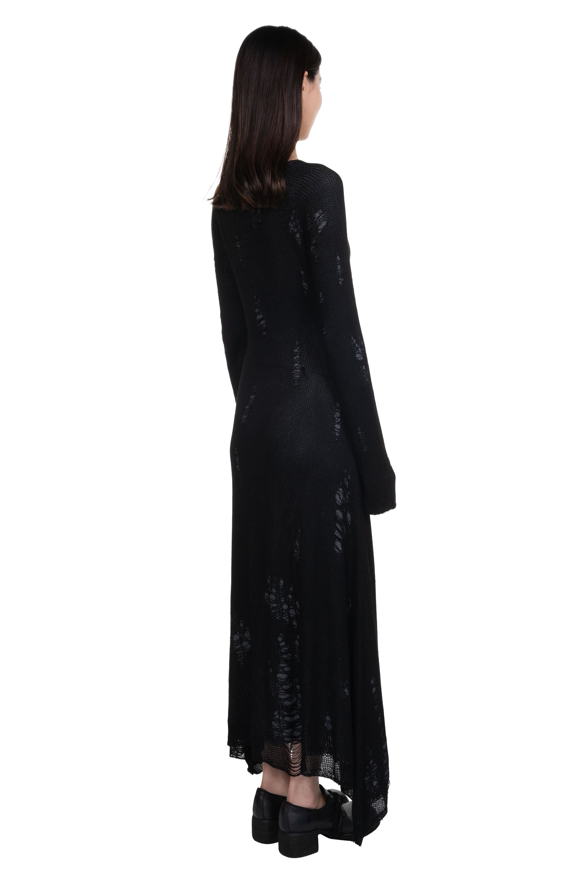 Black Destroyed Knit Dress from Professor e. Long sleeves. Distressed details throughout. Soft and light knitted fabric. Layered.