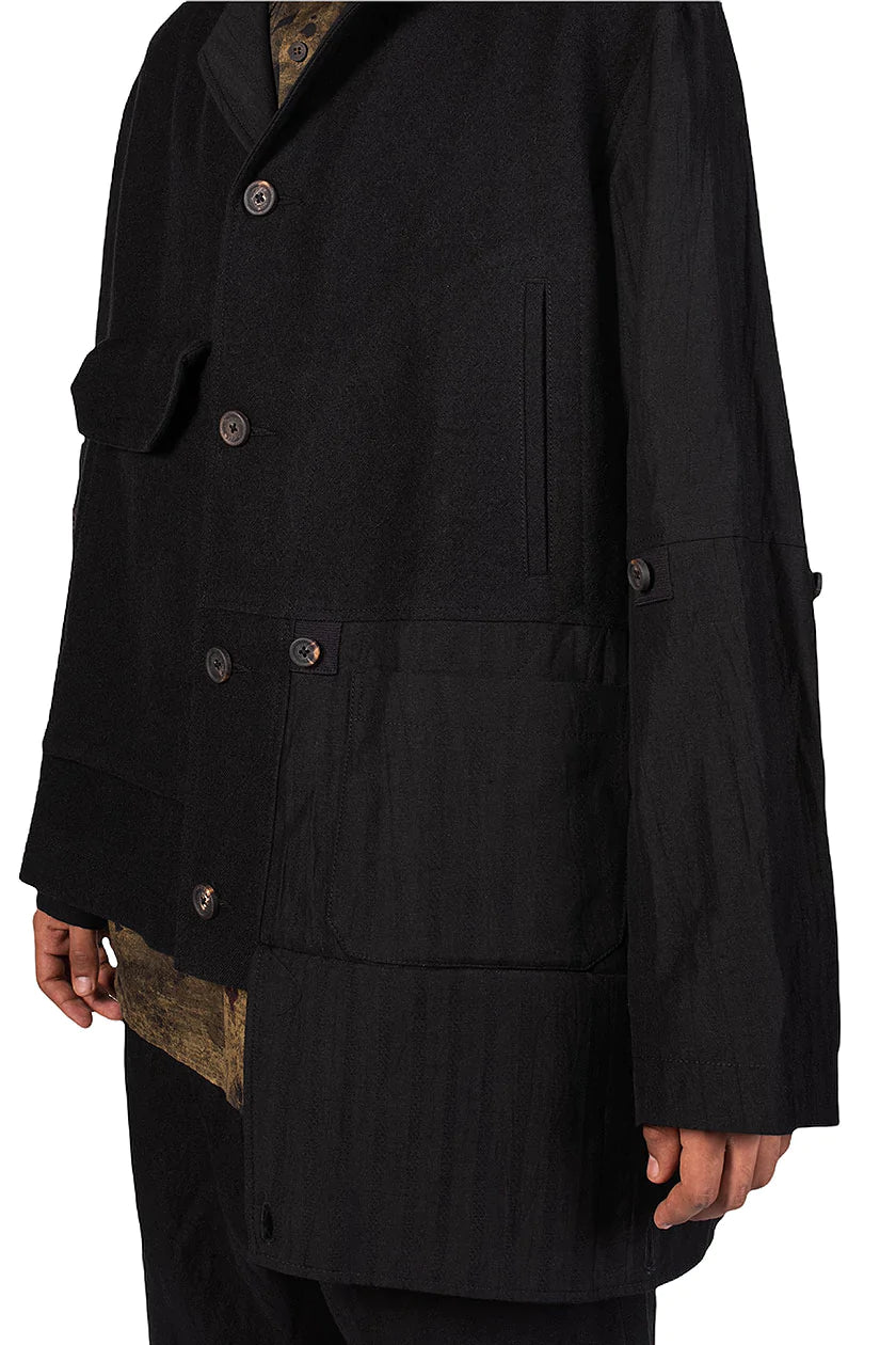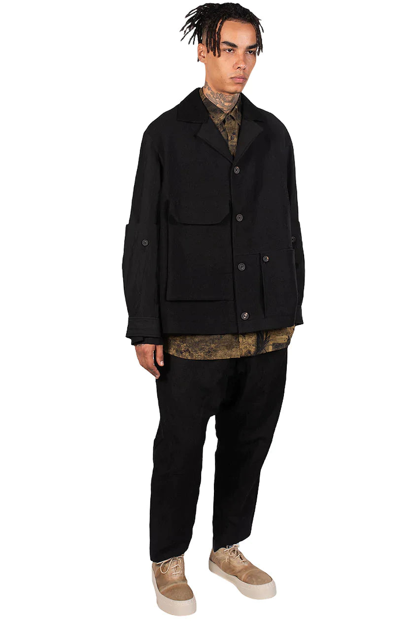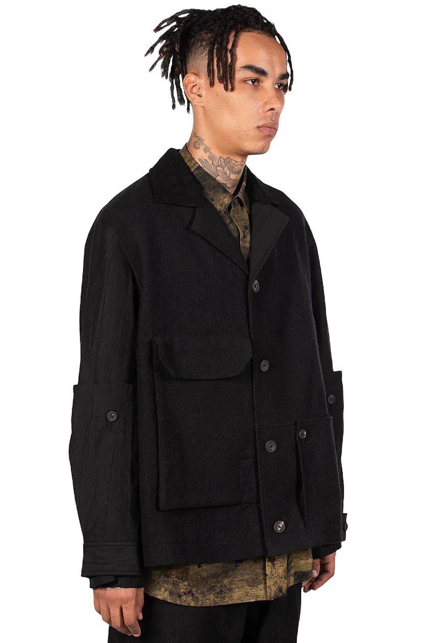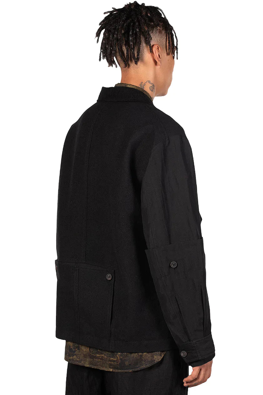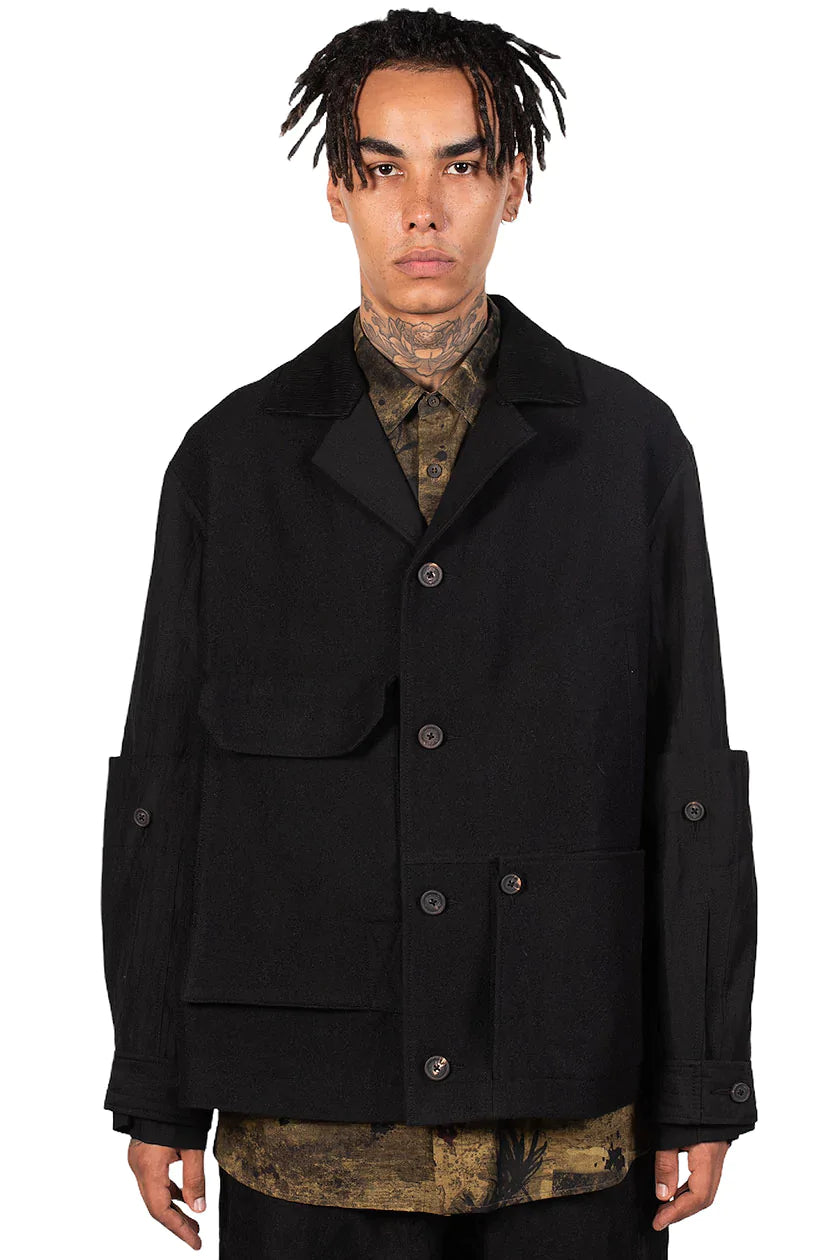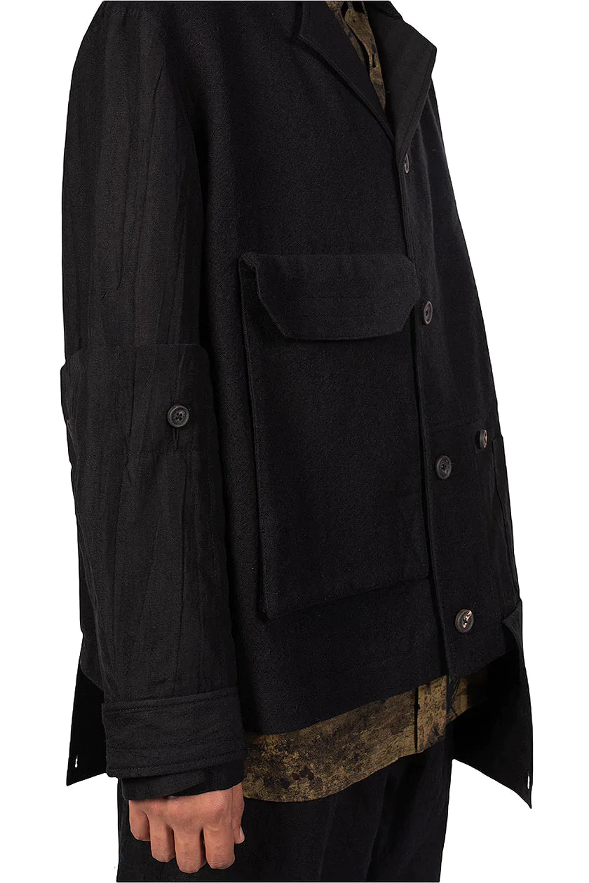 Ziggy Chen Detachable Over sleeves Worker Jacket. Button closure at front. detachable layer at sleeves. Details throughout.
