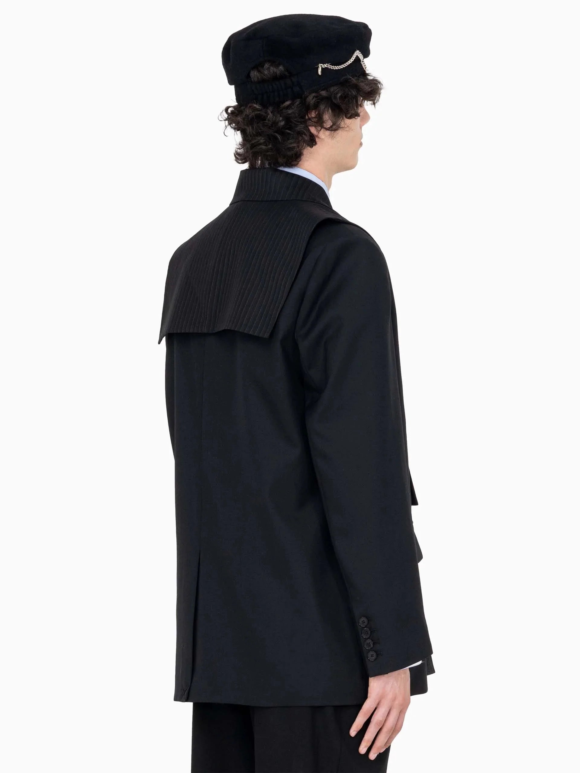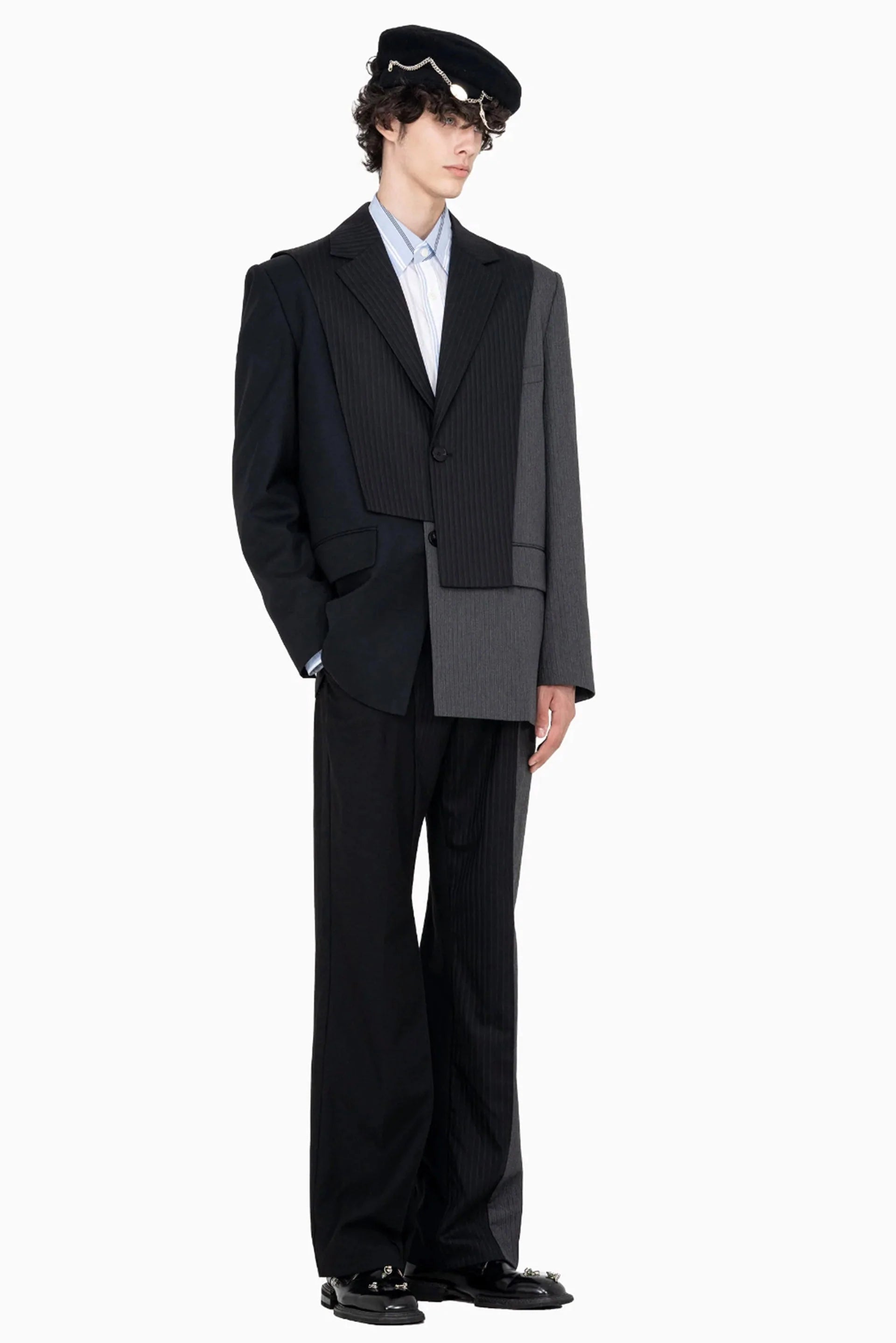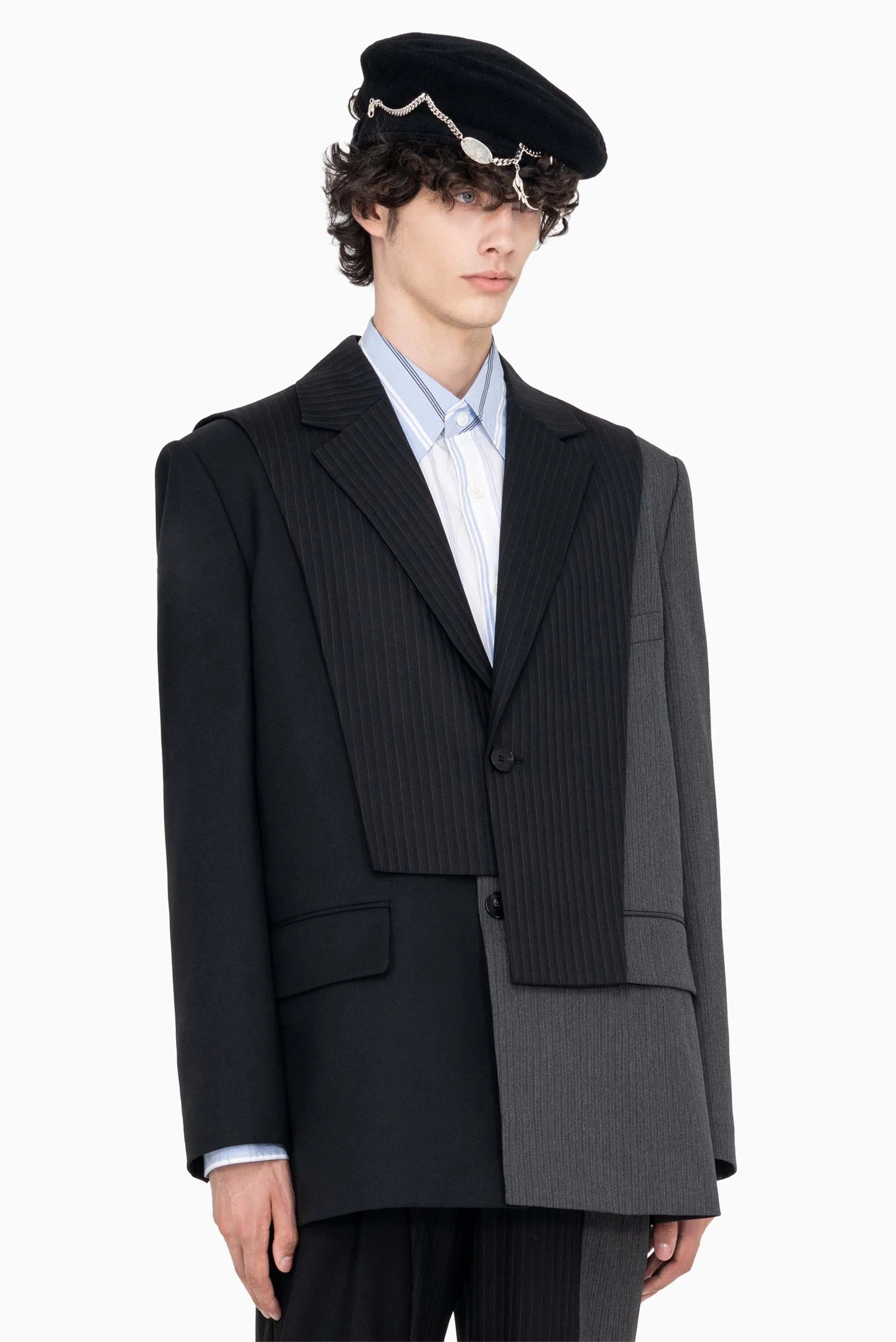Two-in-one black and grey wool blazer is inspired by the Feng Chen Wang classic suit. Detachable pinstripe lapel layer creating a separate piece. Can be worn in multiple ways. Button Closure at front. Long sleeves.