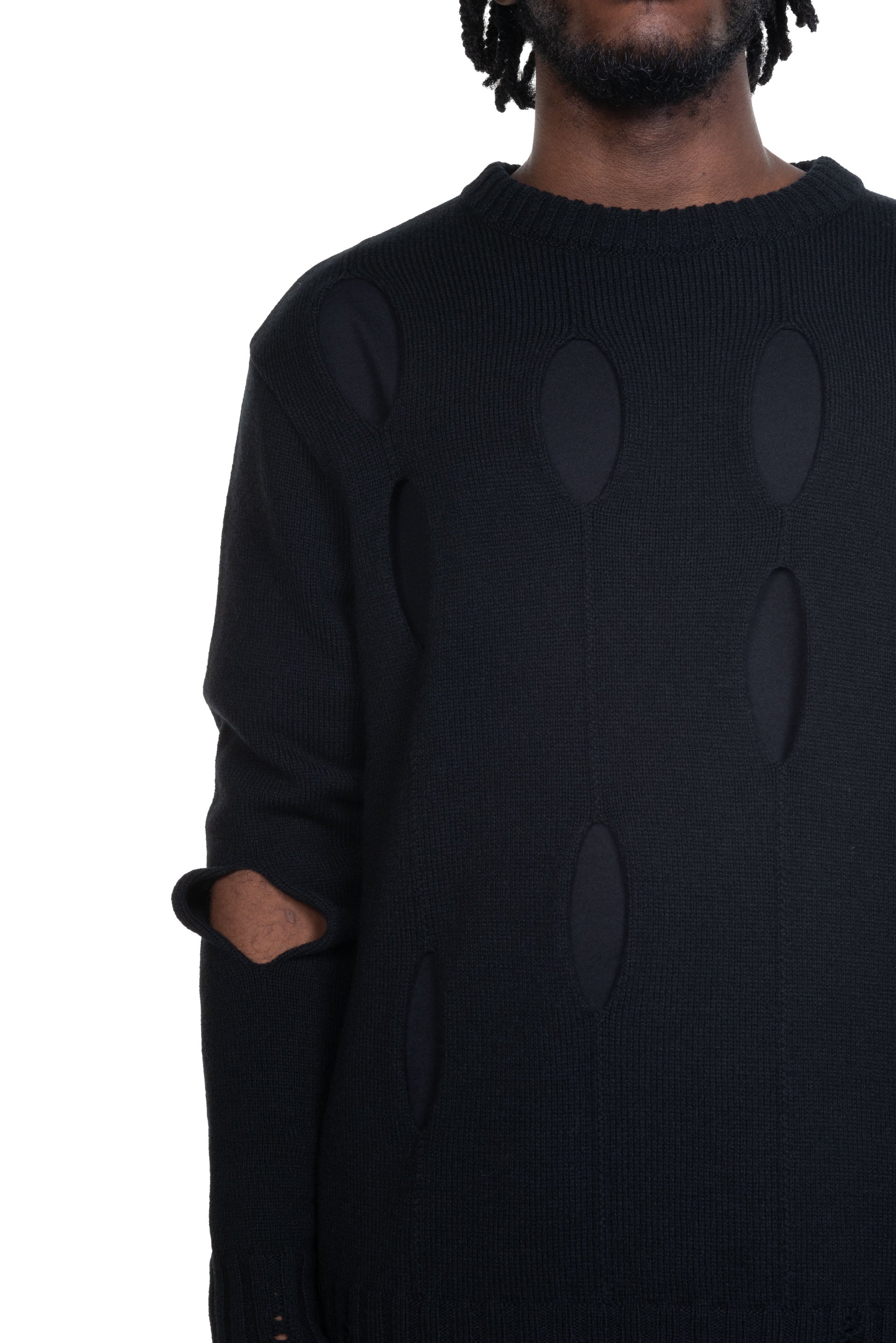 Song for the Mute oversized knitted sweater in a fine wool acrylic blend. Featuring diamond cut-out motifs throughout and distressing at cuffs and hem.