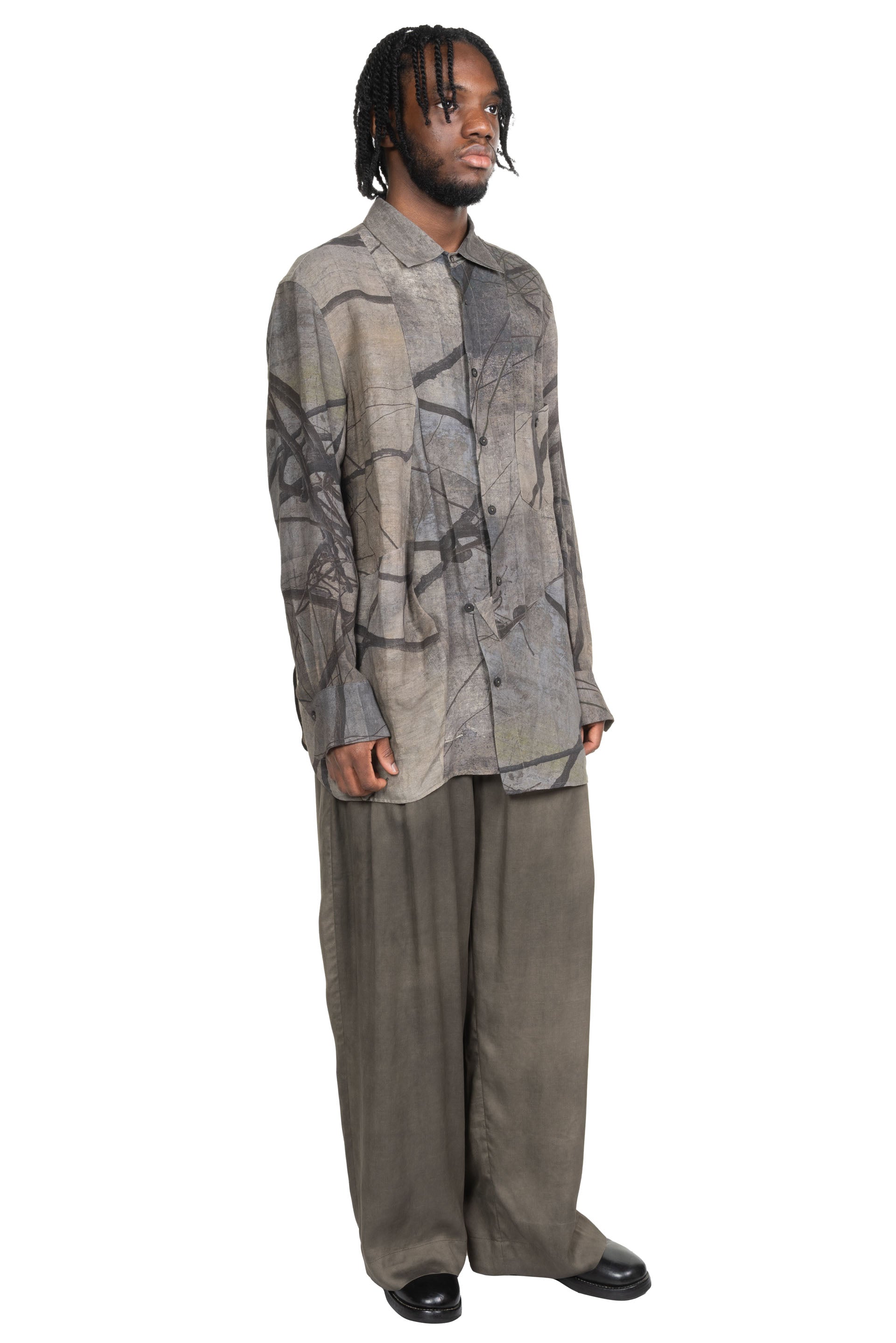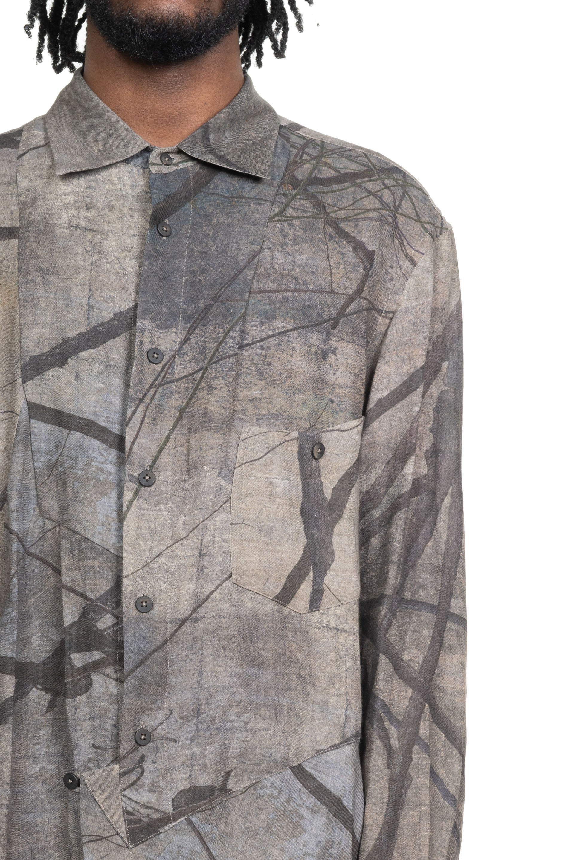 Ziggy Chen Digital Print Asymmetric Shirt. Long sleeves. Button closure at front. Button closure at cuffs. Pleated at front. Signature pocket at front. Asymmetric slit at sides. Soft and lightweight wool fabric. Ziggy Chen seasonal gnarled branches print.