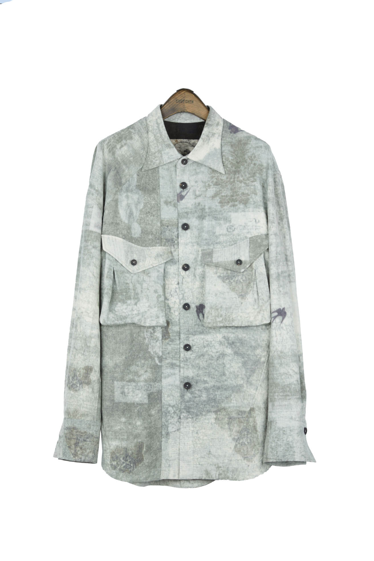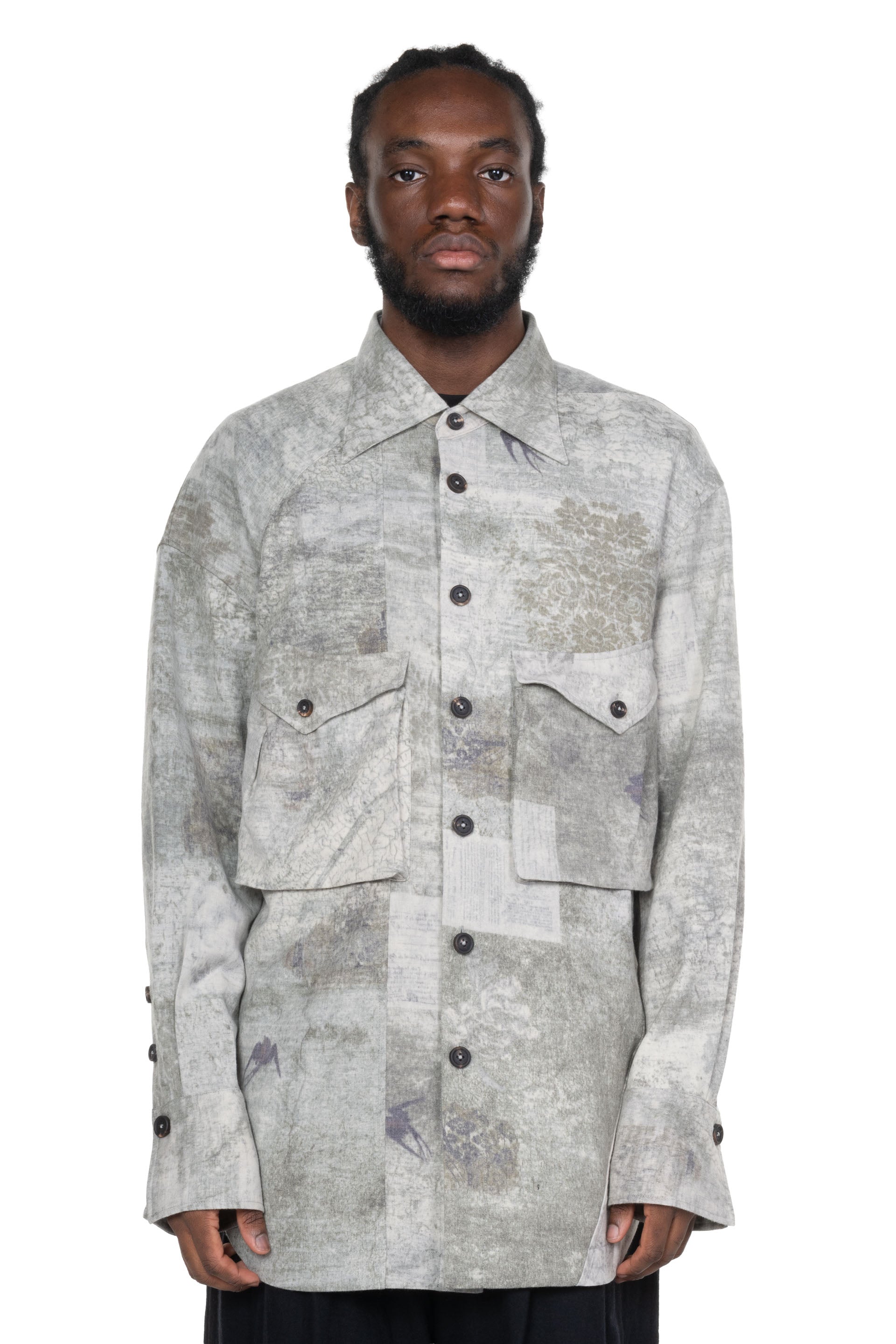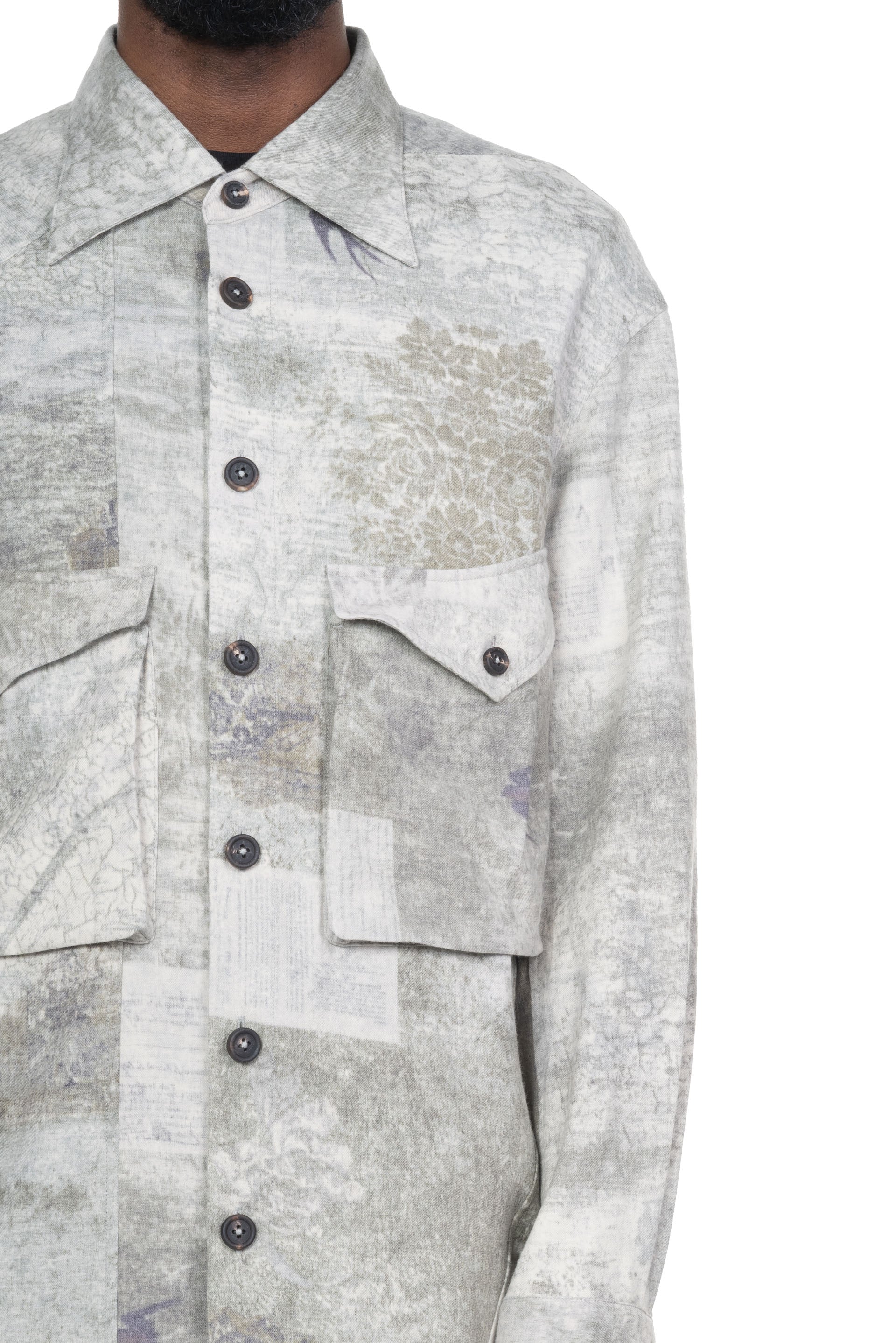Ziggy Chen digital print wool shirt jacket. Loose fit. Below-hip-length. Pointy spread collar. Visible button closure. Two front pockets with flap and button fastening. Seasonal digital print.