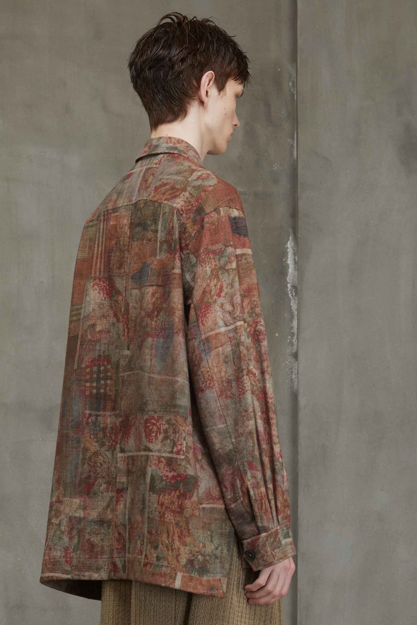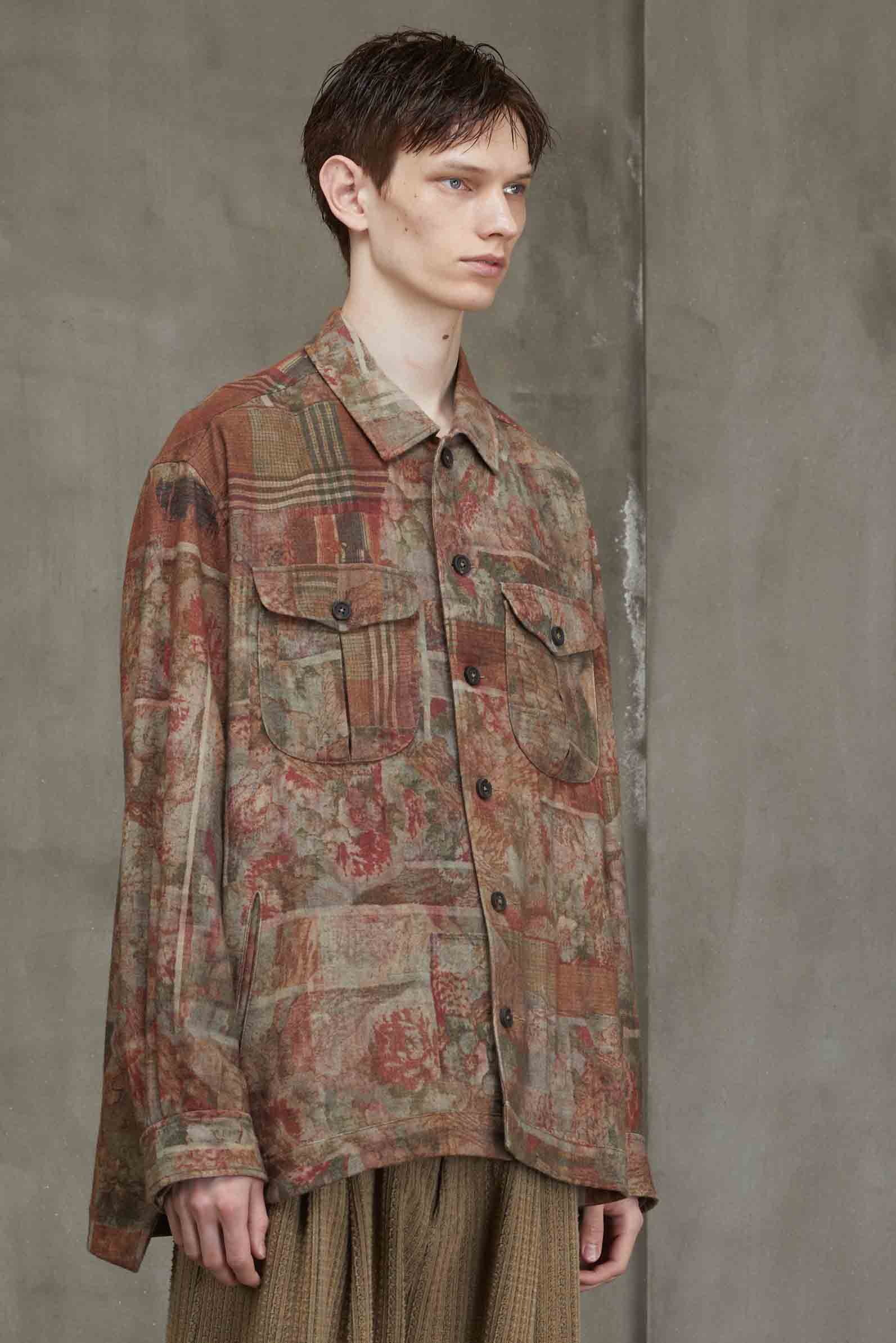 Ziggy Chen worker shirt with digital seasonal print. Long sleeves. Button closure at front. Button closure at cuffs. Two front pockets. Classic collar. Slit at sides. Seasonal print throughout.
