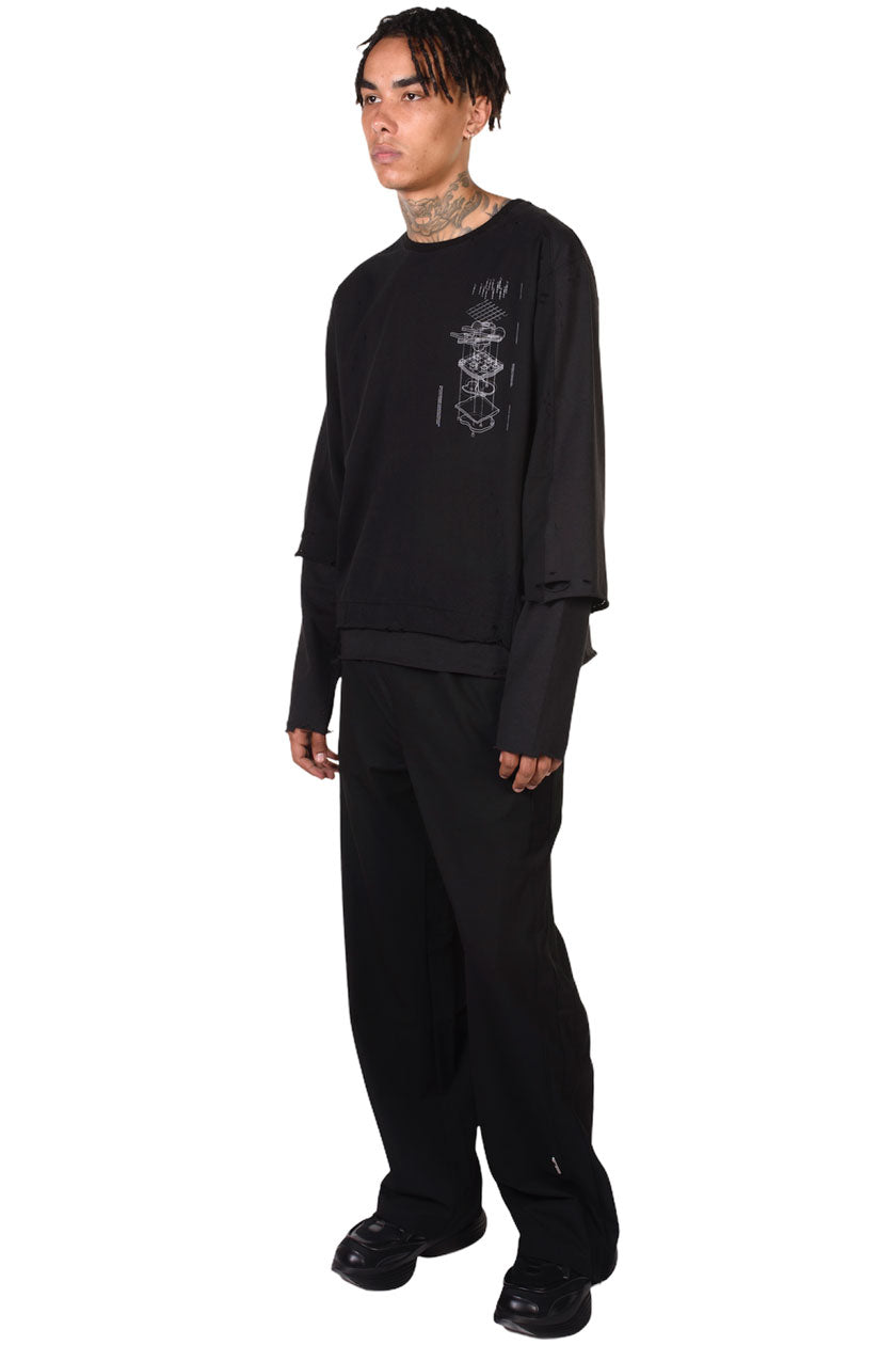 C2H4 concept ranges from hypothetical space scientists producing sport and streetwear-inspired designs creating an intergalactic underground culture. Using her studio as a laboratory, Chen’s meticulously elevates wardrobe cornerstones as seen with the Distressed Double Layer T-shirt.
