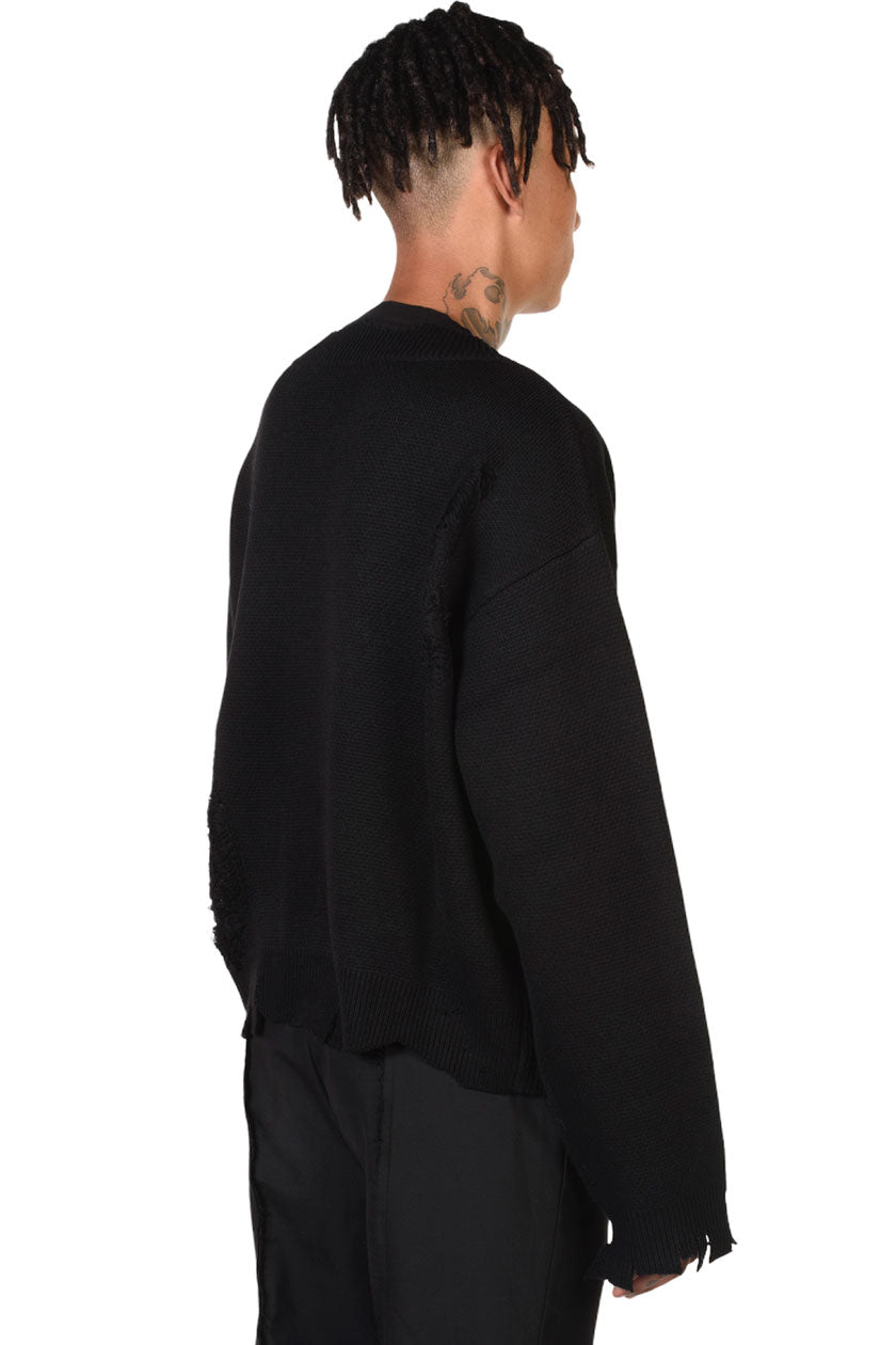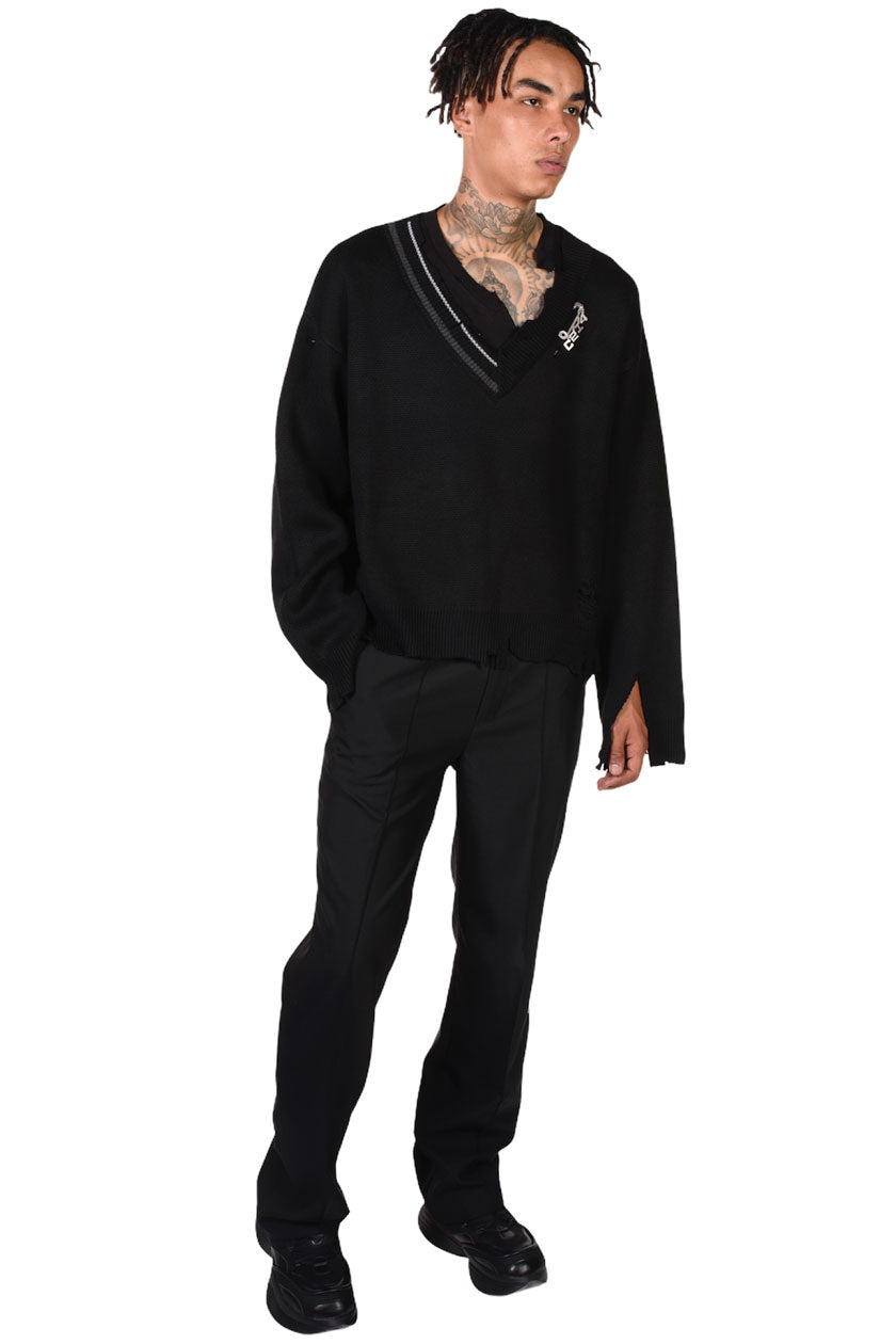 C2H4 concept ranges from hypothetical space scientists producing sport and streetwear-inspired designs creating an intergalactic underground culture. Using her studio as a laboratory, Chen’s meticulously elevates wardrobe cornerstones as seen with the Distressed Knit Layered Sweater Black.