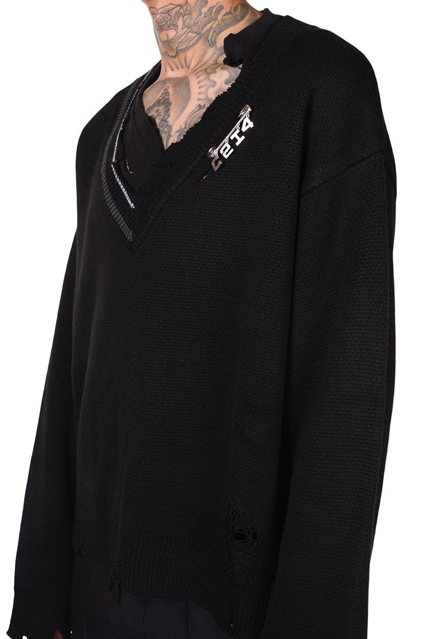 Layering V-neck Collar. Rib Knit Cuffs And Hem. Comes With White Gold Coated. Brass Safety Pin Set. Distressing Throughout.