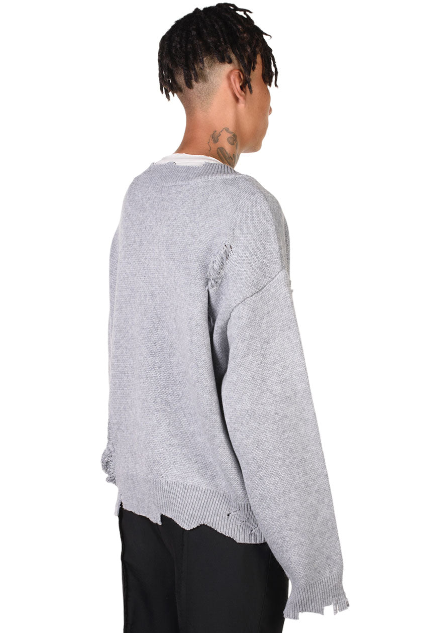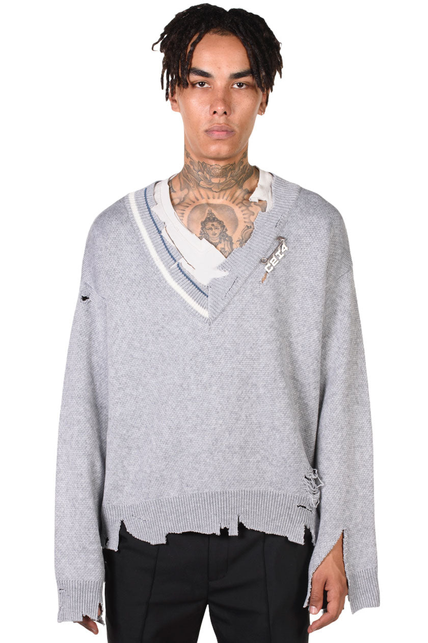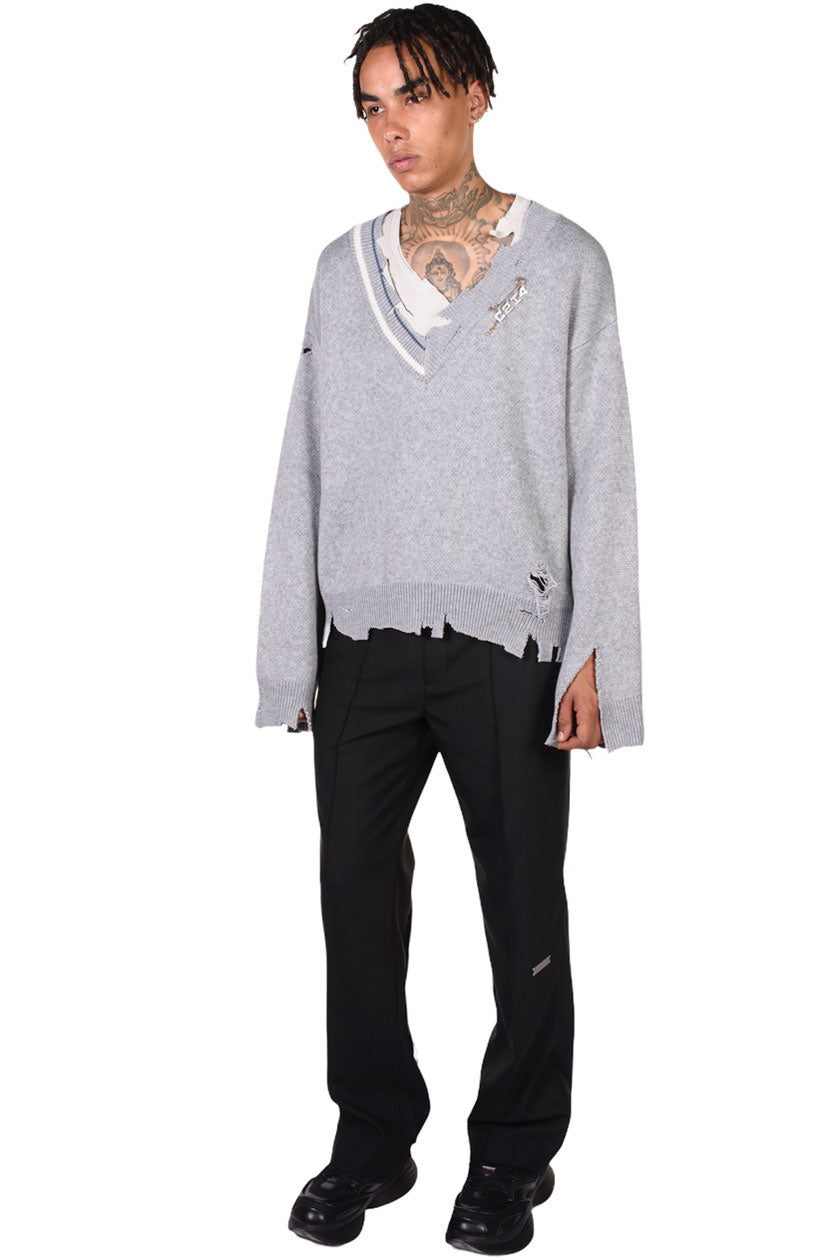 C2H4 concept ranges from hypothetical space scientists producing sport and streetwear-inspired designs creating an intergalactic underground culture. Using her studio as a laboratory, Chen’s meticulously elevates wardrobe cornerstones as seen with the Distressed Knit Layered Sweater Grey.