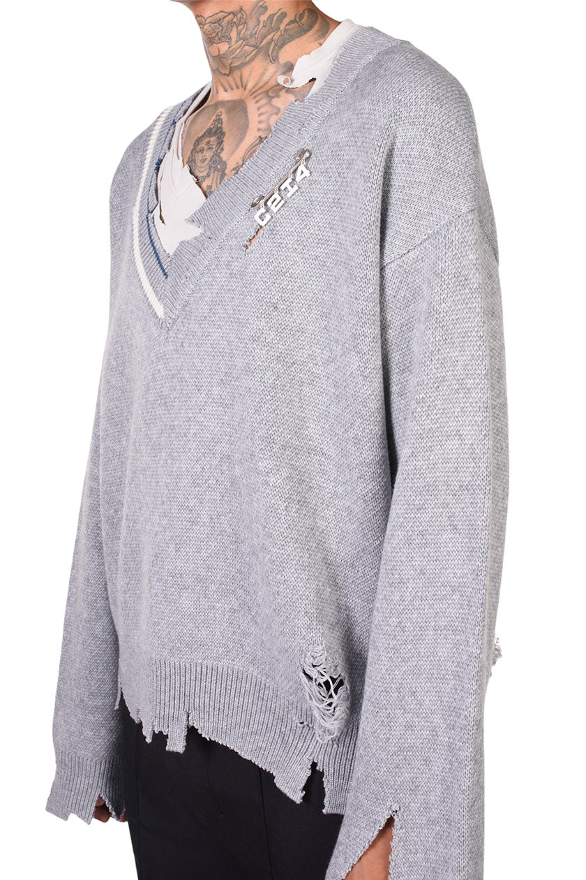 Layering V-neck Collar. Rib Knit Cuffs And Hem. Comes With White Gold Coated. Brass Safety Pin Set. Distressing Throughout.