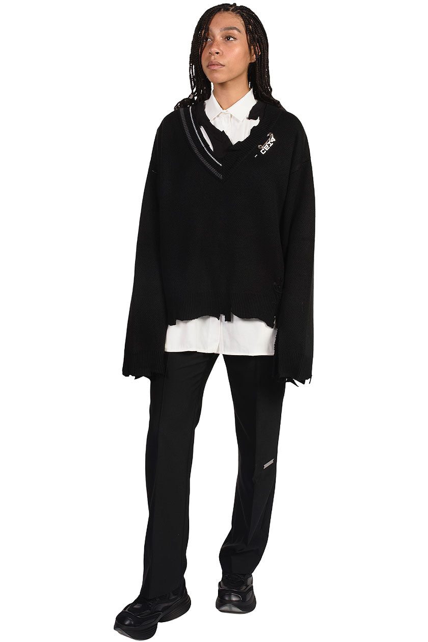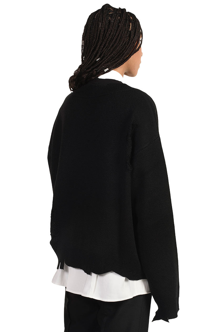 C2H4 concept ranges from hypothetical space scientists producing sport and streetwear-inspired designs creating an intergalactic underground culture. Using her studio as a laboratory, Chen’s meticulously elevates wardrobe cornerstones as seen with the Distressed Knit Sweater Black