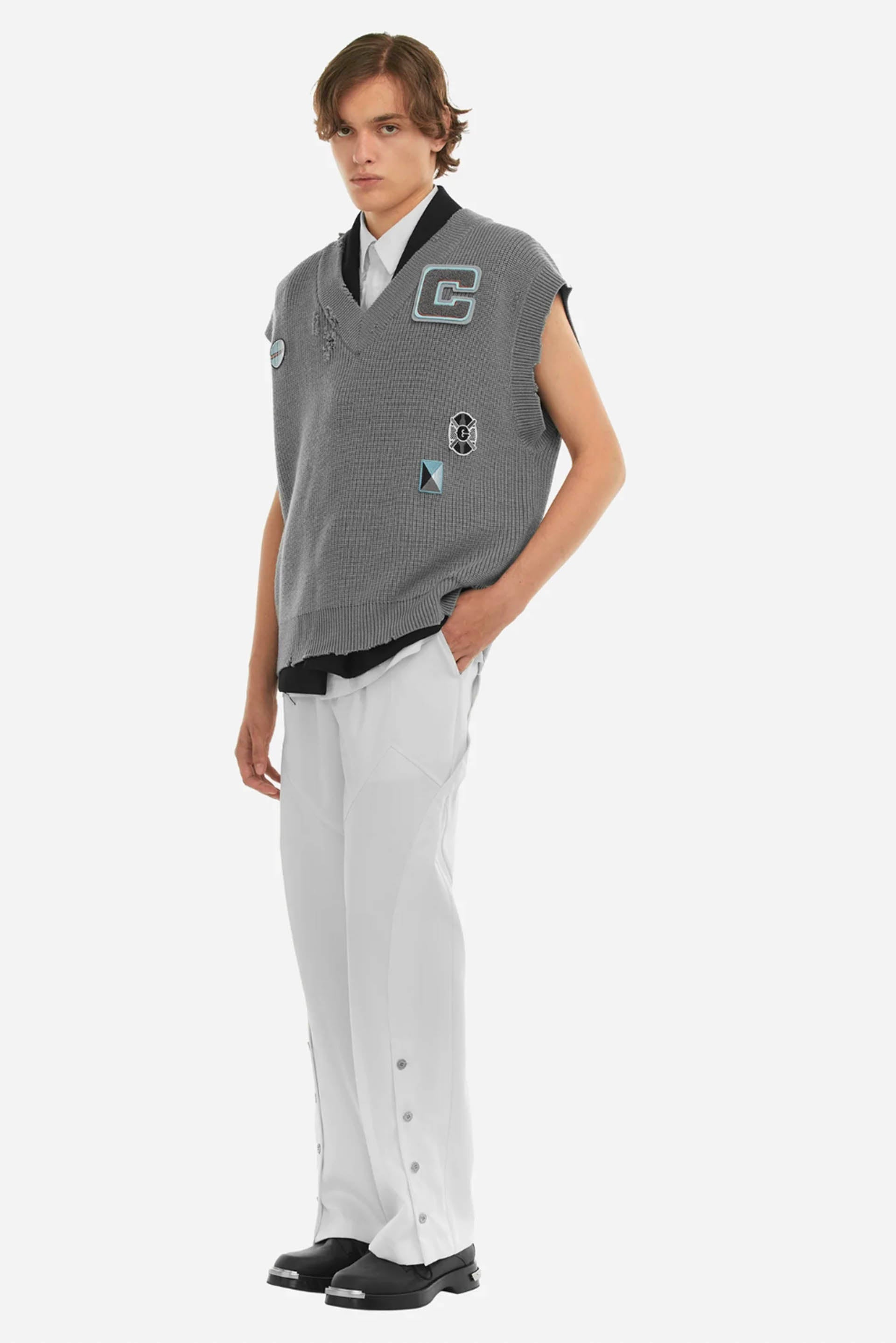 C2H4 concept ranges from hypothetical space scientists producing sport and streetwear-inspired designs creating an intergalactic underground culture. Using her studio as a laboratory, Chen’s meticulously elevates wardrobe cornerstones as seen with the Distressed Knit Vest Grey.