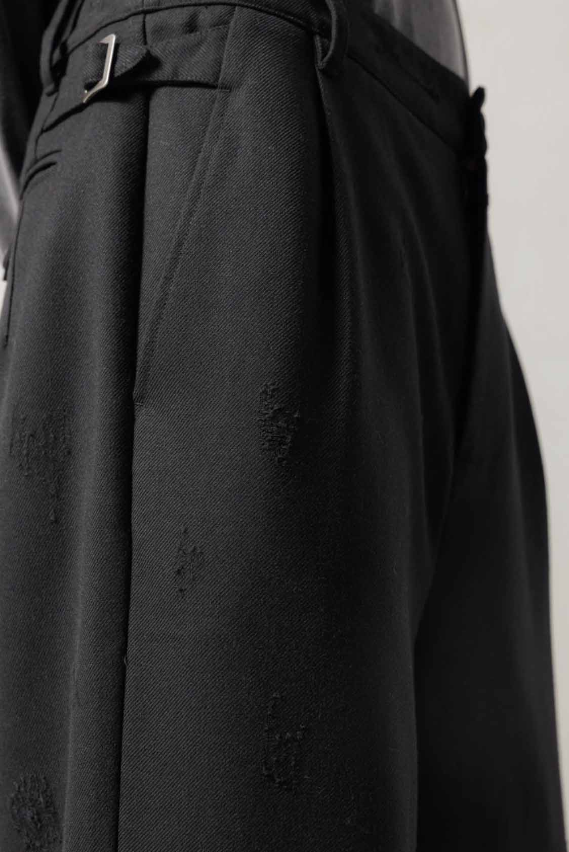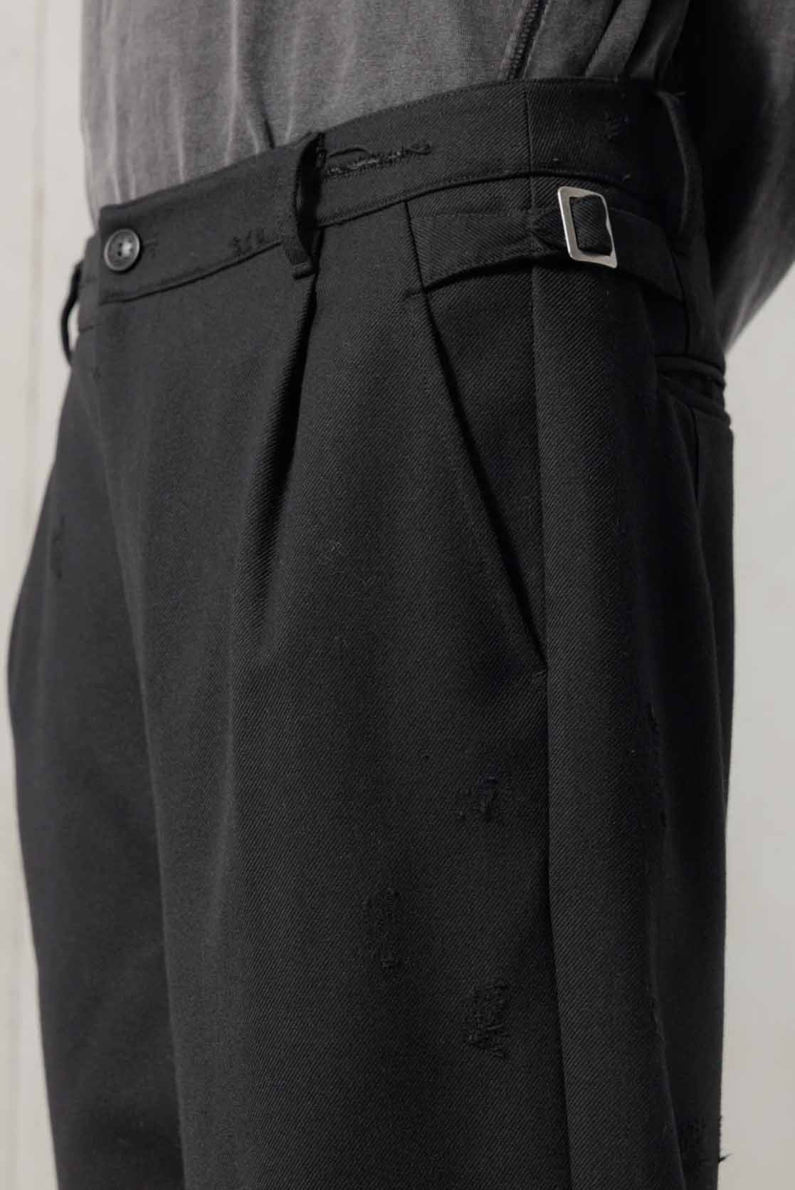 Professor e wool pants. Inspired by a pair of French work trousers from the 1930s archive, this piece retains the original side metal buckles for waist adjustment. Distressed detailing is added to evoke the worn-in character and texture of long term use.