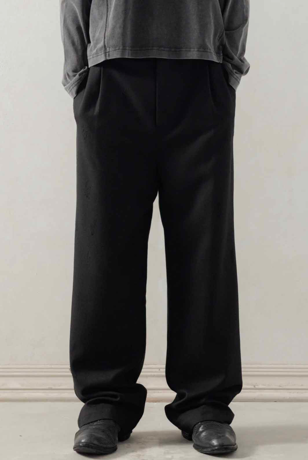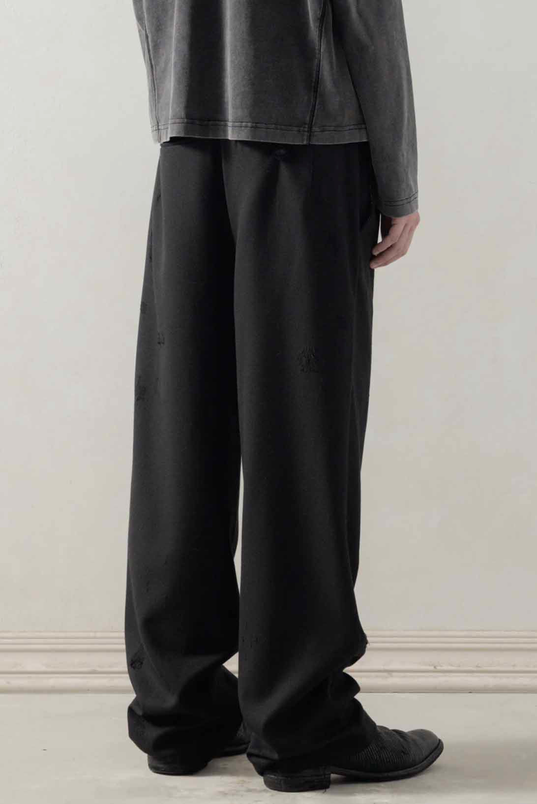 Professor. E understands the time of aesthetics from the use of cotton, hemp and wool. Fabric stitching, patching, designs without edge trimming, deconstruction, and reproduction are all Professor. E's signature elements creating classic immortal designs that can be viewed with the Distressed Wool Pants Black