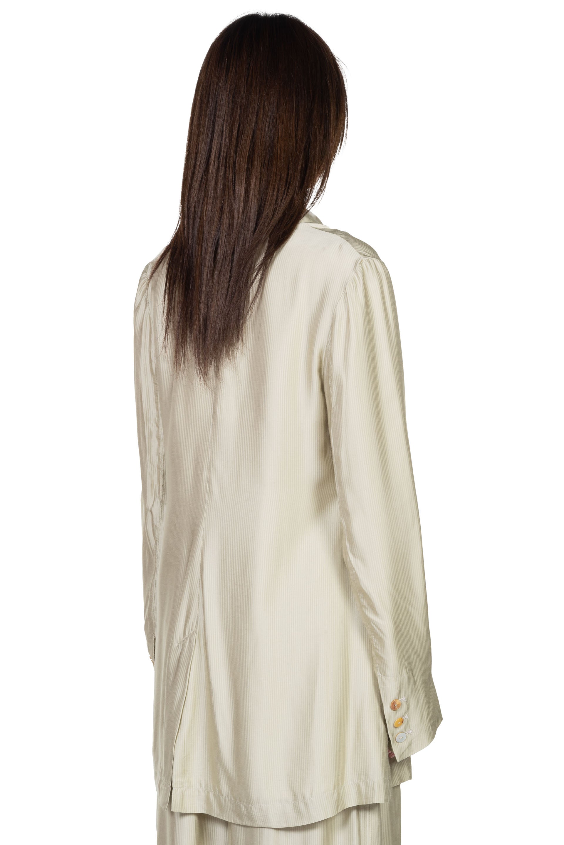 A Tentative Atelier aims to explore artistic handicraft elements and innovative forms and silhouettes on garments combining with neo-vintage effect. The label does not only focus on fashion, it is a platform to encourage and sustain the spirit and tradition in craftsmanship to create new form as seen with the Double Breasted Drape Stripe Jacket.