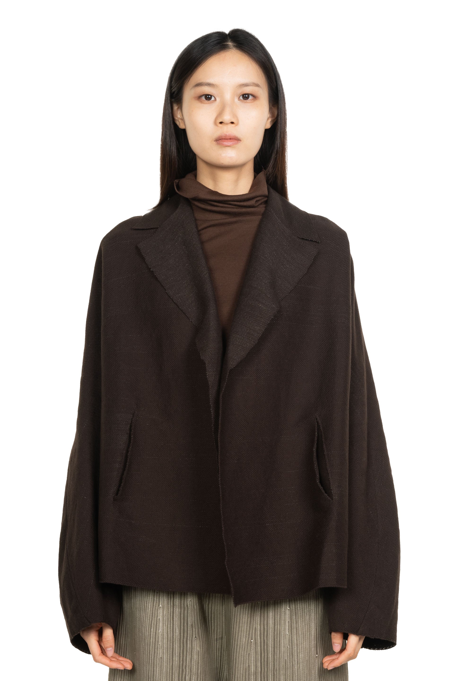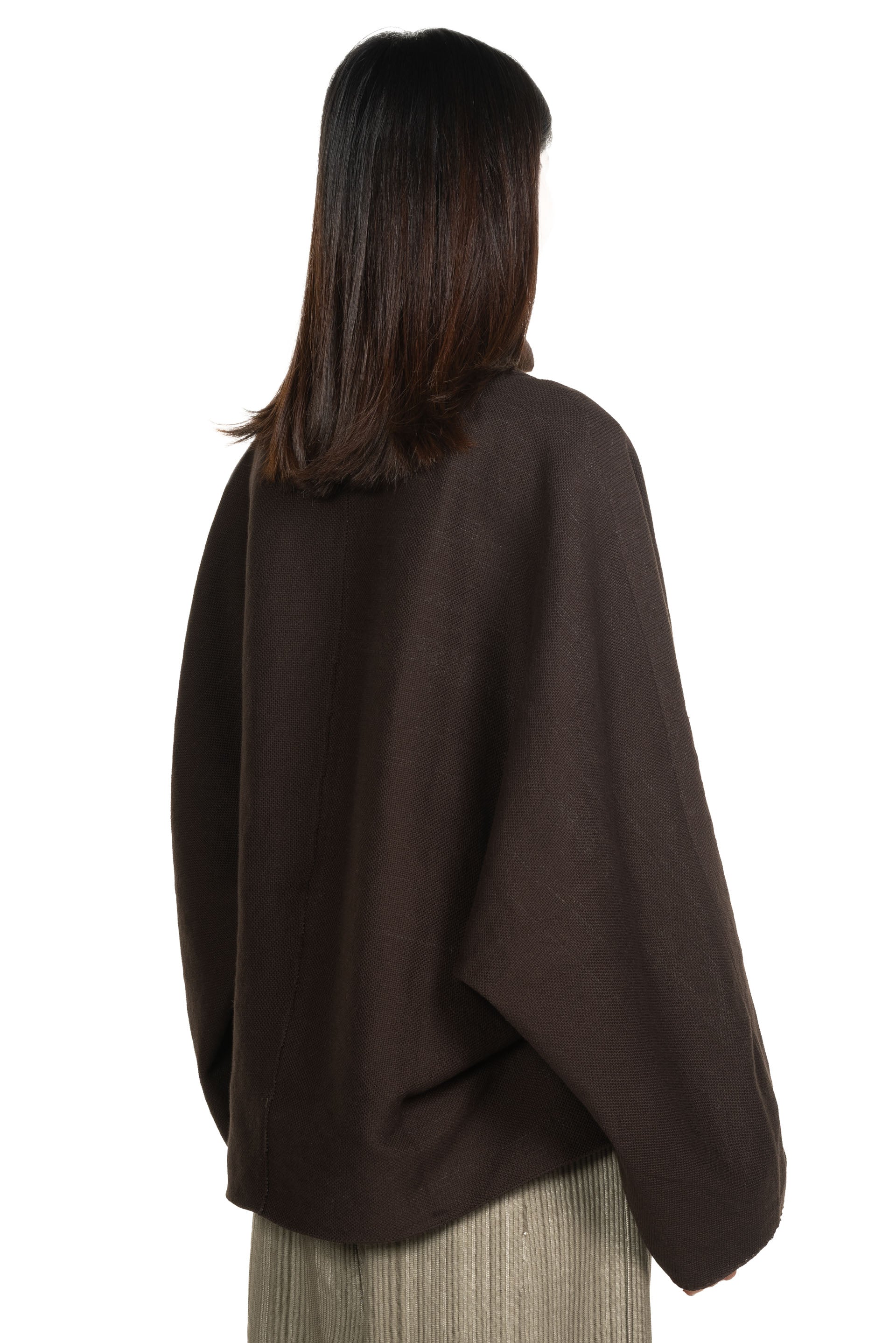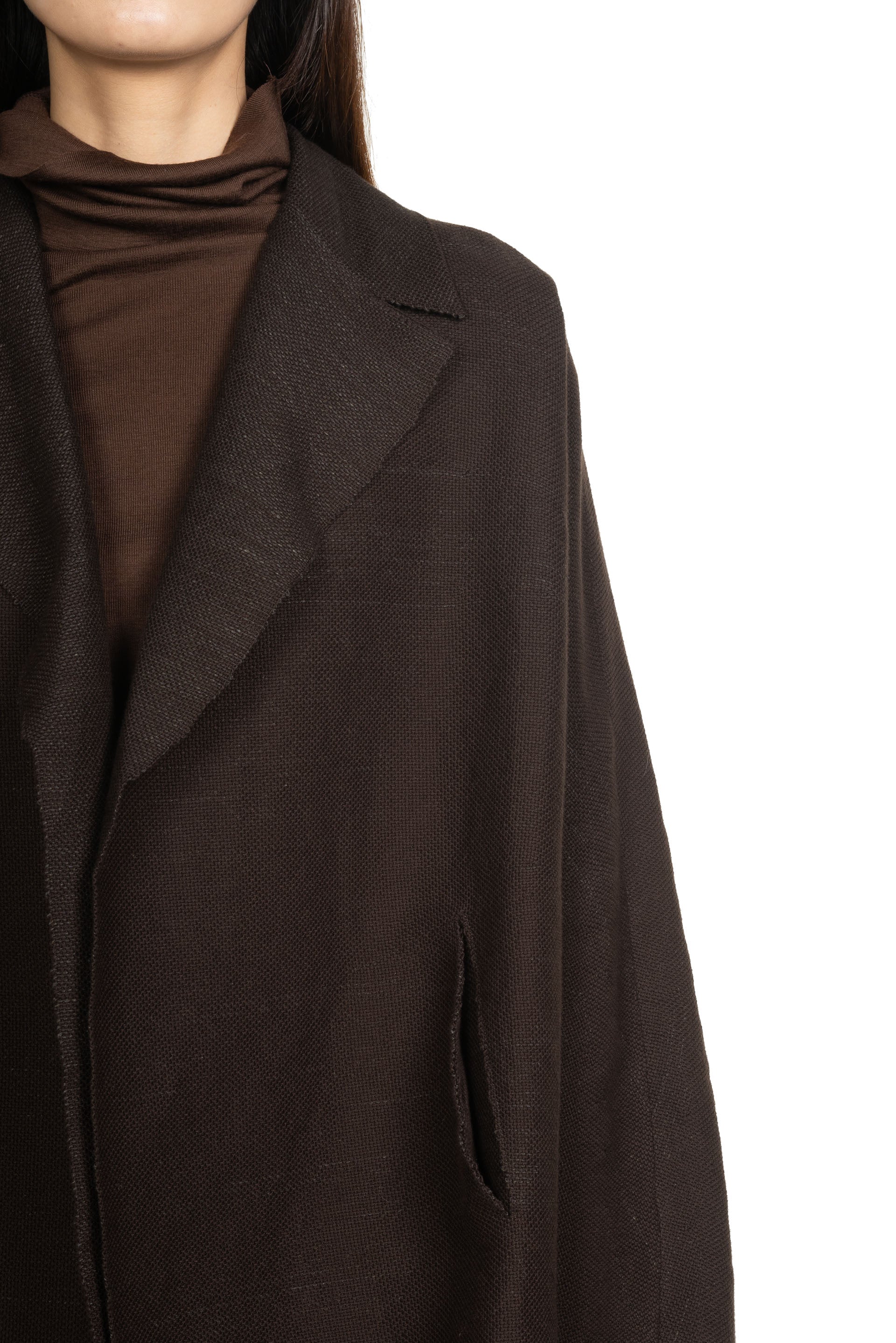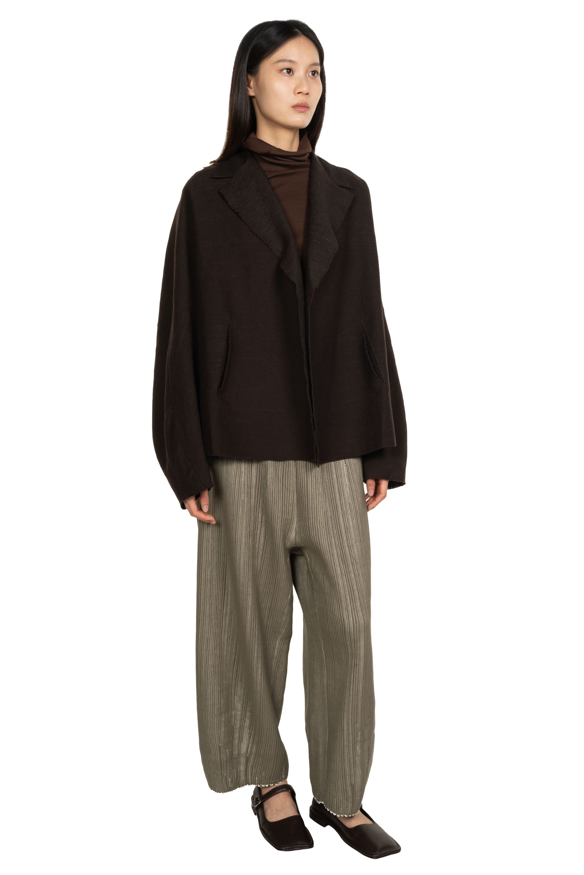 Boboutic consider knits an ideal medium, since its versatility allows conceiving unique surfaces and unexpected shapes. The approach to knitwear is unpredictable, aiming at creating a product where materials and structures compensate each other as seen with the Double Breasted Jacket Coffee