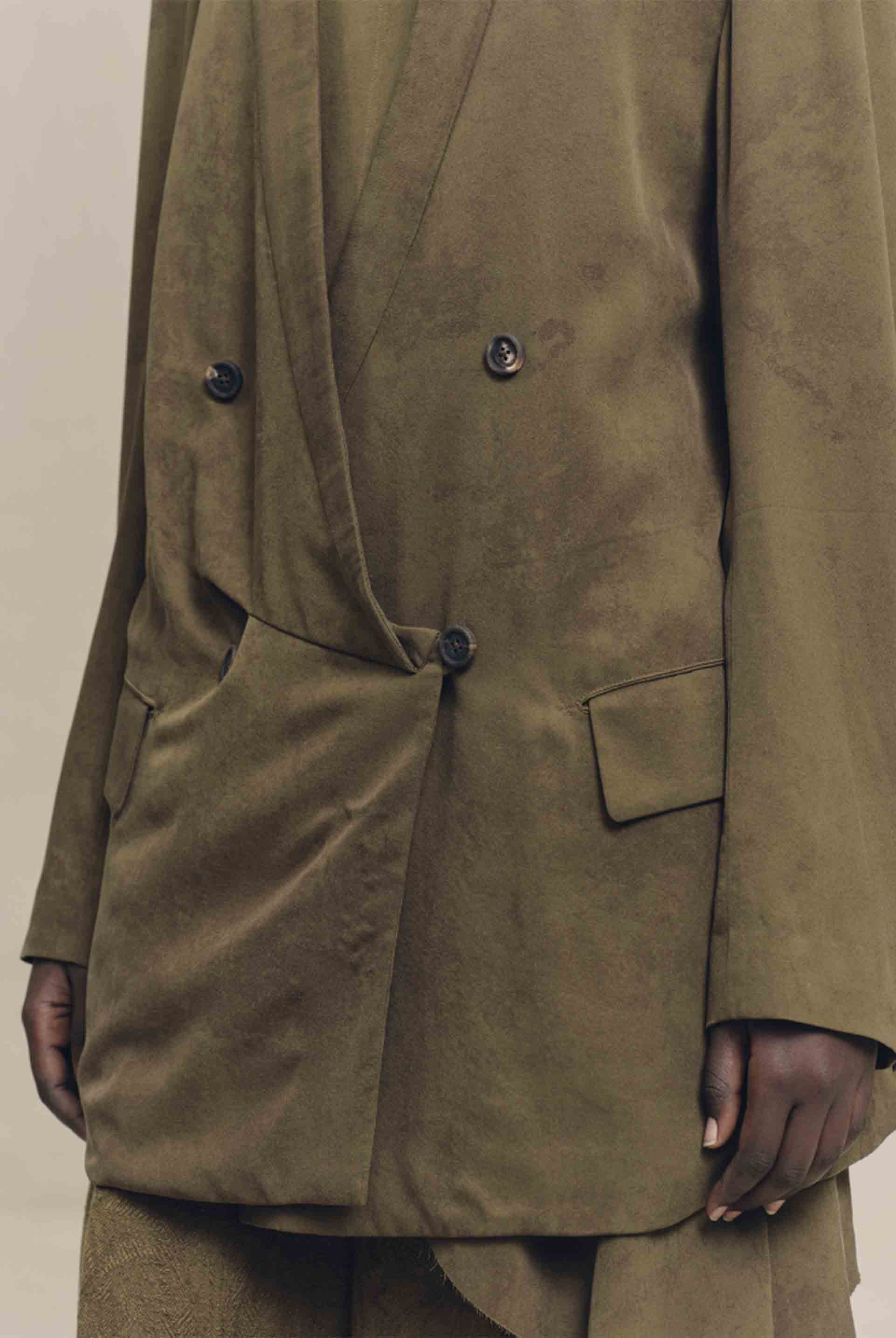 Ziggy Chen silk double breasted blazer. Long sleeves. Collarless. Button closure at front. Relax fit. Pleated at back. Two pocket at front. Rich Olive colour in a soft textural silk fabric.