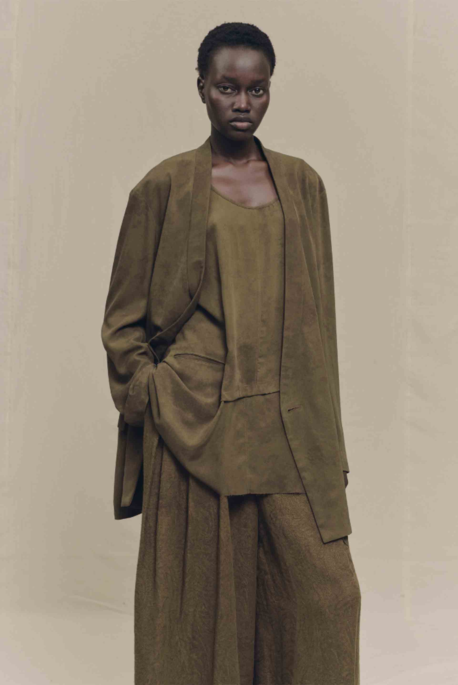 With a colour palette of browns and greens, Ziggy Chen’s designs evoke the textures of aged architecture and the natural world. The garments feel as natural as they look, combining softness with structure. Seamlessly blending Eastern and Western influences, Ziggy Chen captures the essence of timeless beauty, from fluid silhouettes to intricate patterns. Ziggy Chen continues to redefine the intersection of tradition and modernity in fashion as seen with the Double Breasted Silk Blazer Olive.