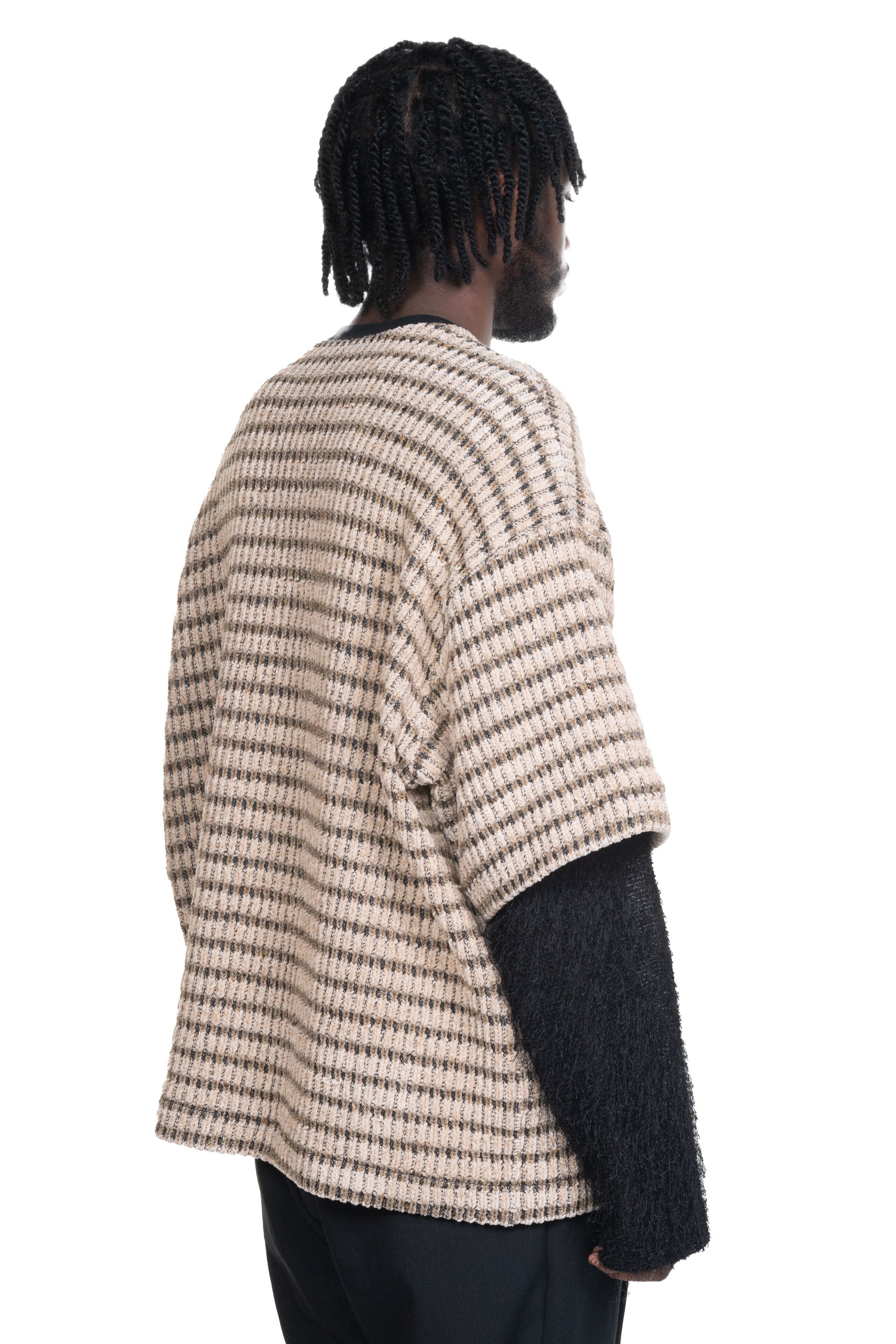 Double layered oversized pullover in a ribbed poly acrylic blend. Featuring dropped shoulders, cotton ribbing and double-layer effect sheer shaggy sleeves.