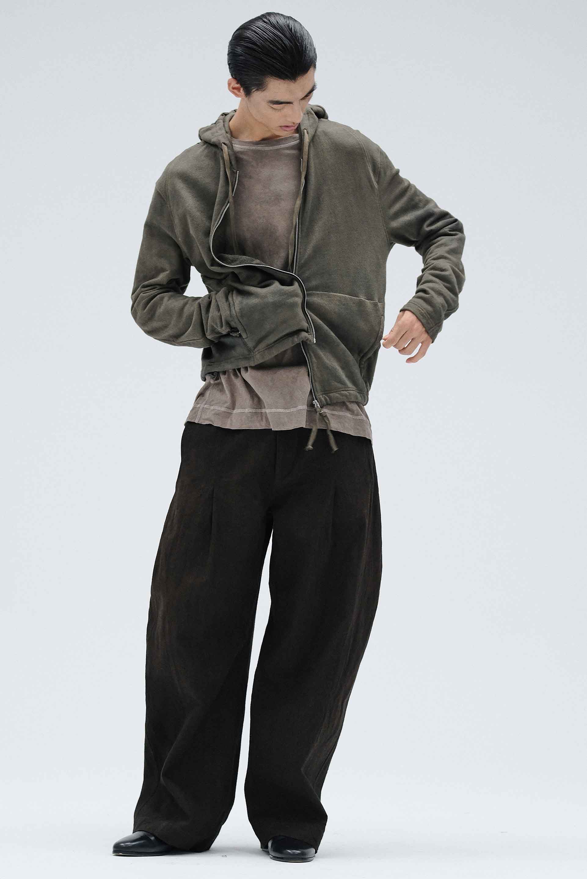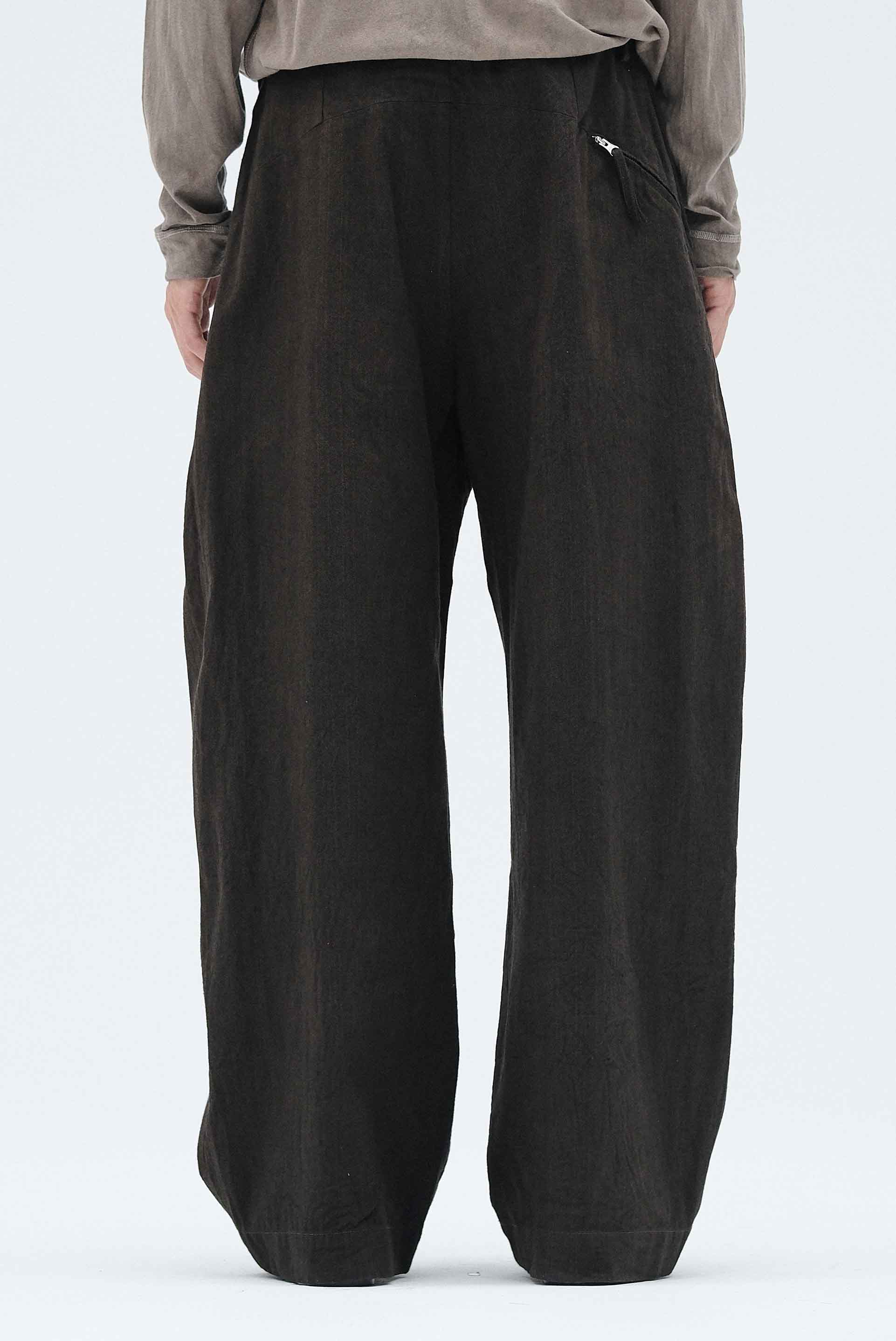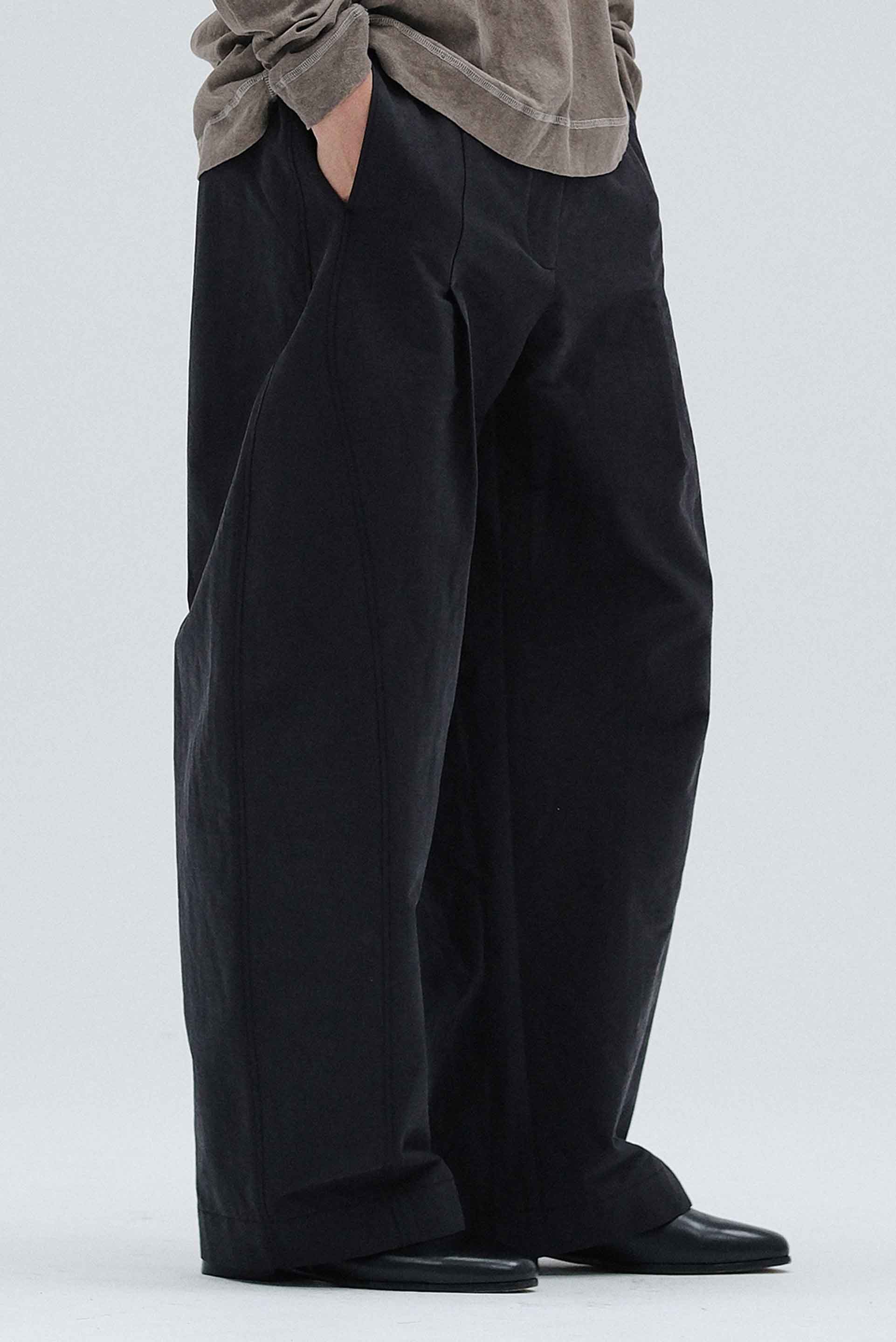 ATTEMPT reconstructs different styles and elements to create a new aesthetic system. By taking a more experimental approach to creation and production, which involves an understanding of the past and the current form of society, Attempt is creating an aesthetic form that is anchored in the present but different from it. It must ultimately be a product that cannot be defined as seen with the Double Pleated Vase Pants Black.