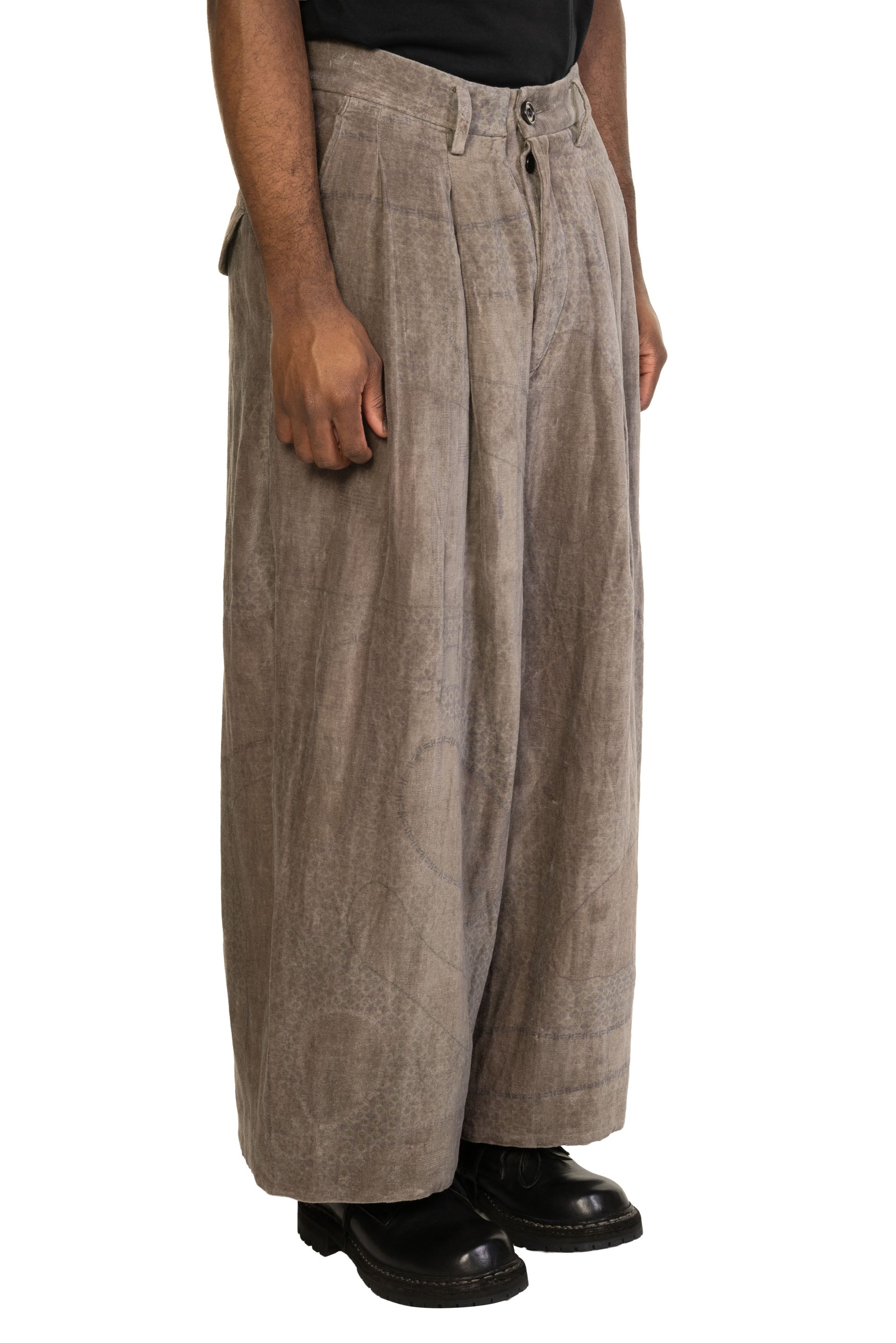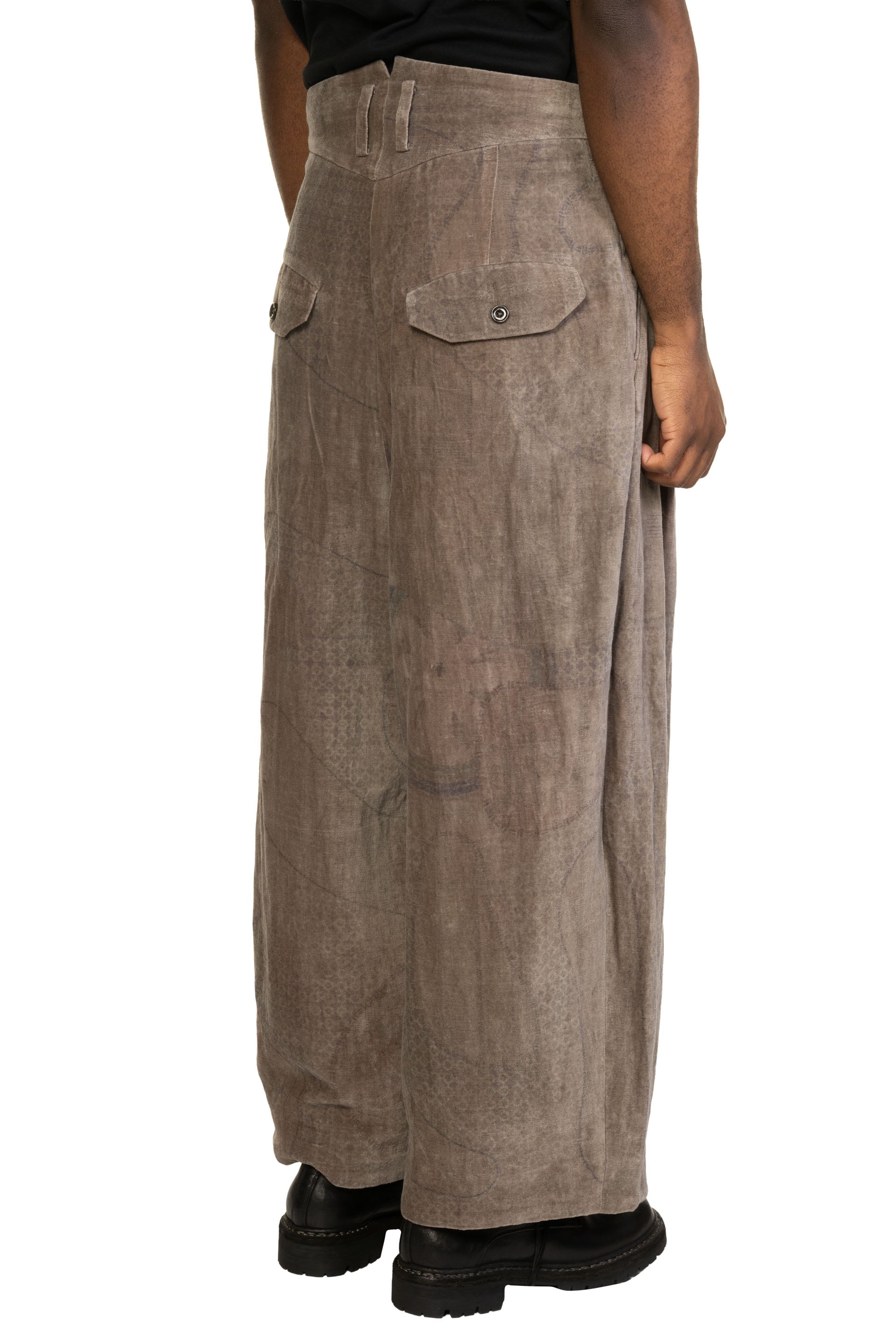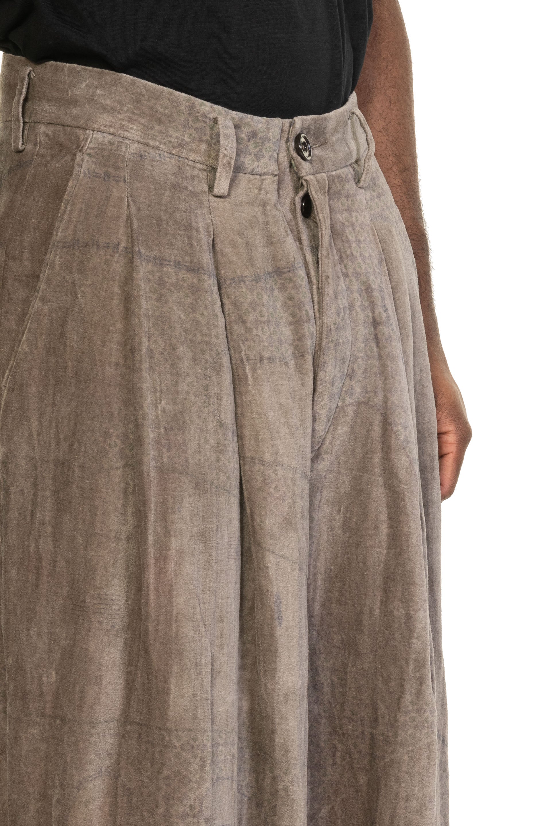Pants with Multiple Pleats. Button closure at waist. Drawstring with signature fabric. Fully lined. Double pleats. Loose fitting. Two side pockets. Two back pocket. Soft textural velvet fabric with signature print.